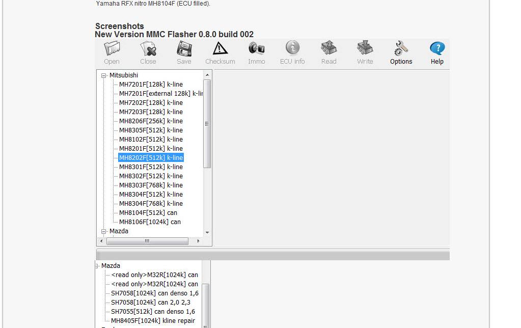Мозги на проце MH8305F. Пошарил в нете - пишут что EcuFlash должен читать(писать) такие мозги без проблем. Кто подскажет в чем загвоздка? Недели три назад, точно с таким же процессором прошивал мозги от Каризмы. Читал и писал с помощью Экуфлеша, выложенного выше, и адаптера Openport1.3 . Читал через "read-evo9" . Это проц на базе SH7055 . Пробуй разные дрова. у меня скан флешера там проц SH7055 прописан как Мазда шина CAN |