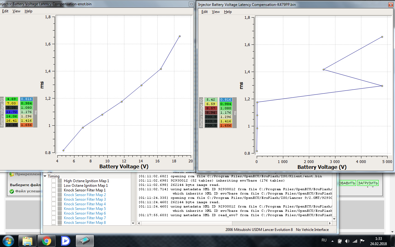 Приветствую форумчане, подскажите начинающему программисту, Lancer 9 2004г.в. 2.0L считал прошивку EcuFlash`ем, а там вот такая бредятина... Хм. В 92930009 оси кривые. Причем у меня на домашнем компе топливная карта 92930009 нормально открывается, а вот коррекция времени открывания форсунки по напруге батареи еще кривее, чем на Ваших скринах. Похоже очередная непроверенная карта вылезла. А какой версией EcuFlash пользуетесь? |