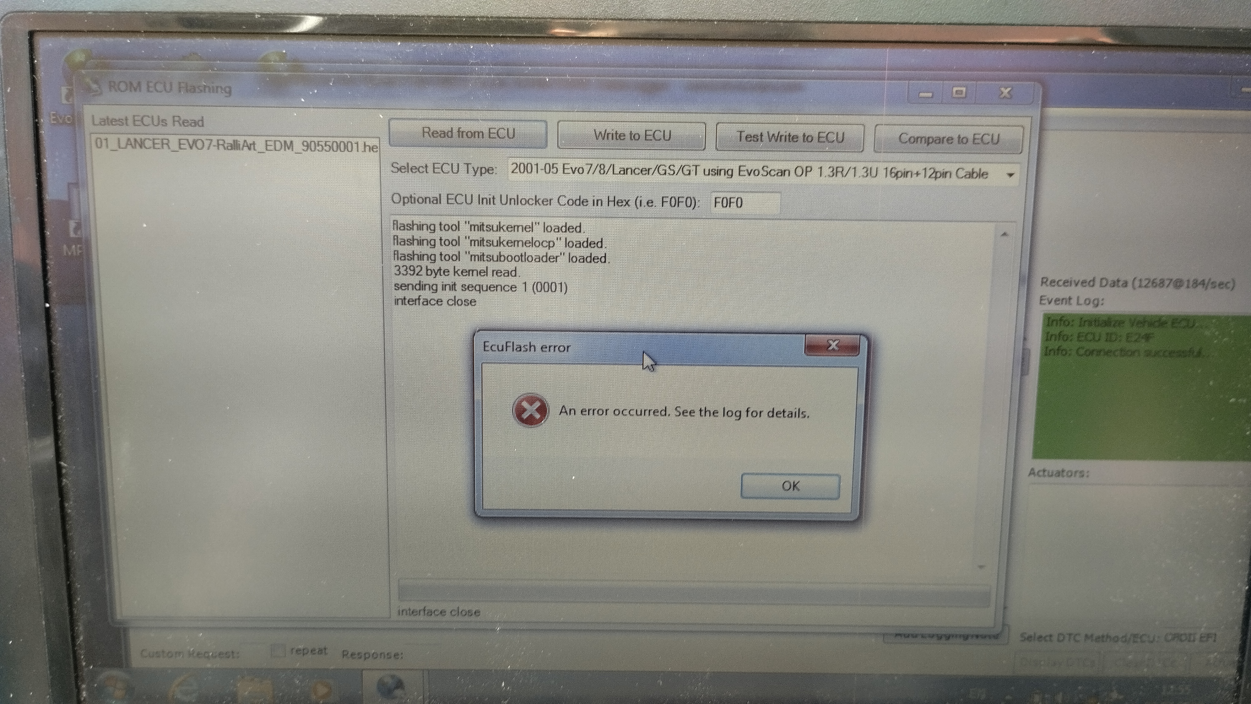 В логе просто может быть ответ на все вопросы - или аппаратная ошибка или пин-код мозга ему не нравится и тд. Еще раз сегодня попробовал считать прошивку через Evoscan 2.9. то что выдает на фото. Разобрал openport, увидел что номер партии у FT232RL CN480661, а Дмитрий писал что такую лучше не использовать. Может в этом дело? Завтра перепаяю. И еще заметил после всех манипуляций по считыванию прошивки холостые обороты падают до 500, приходится скидывать клему акб и заново адаптировать заслонку. |