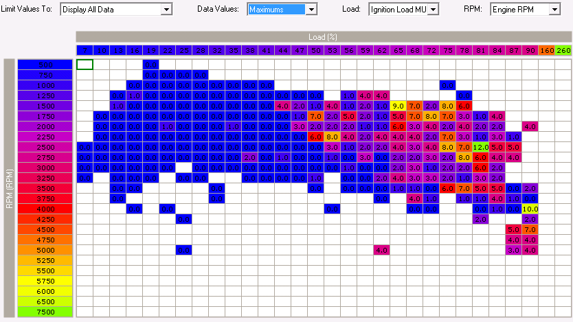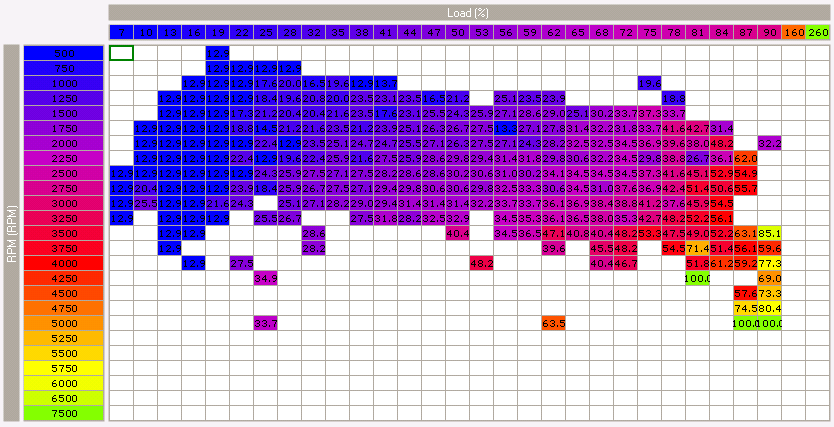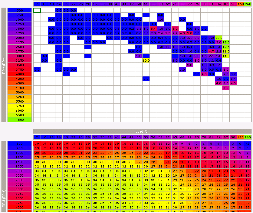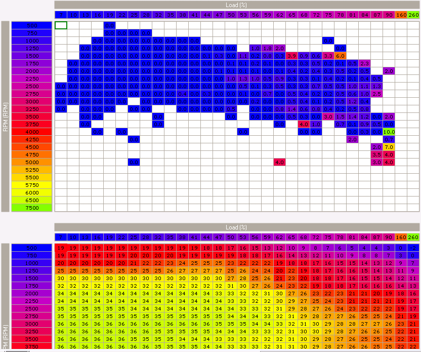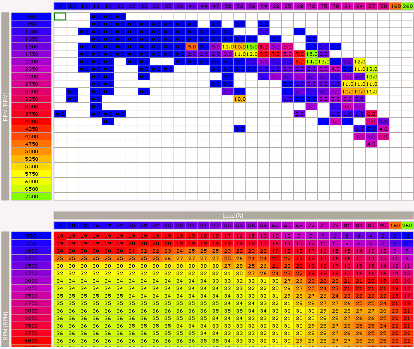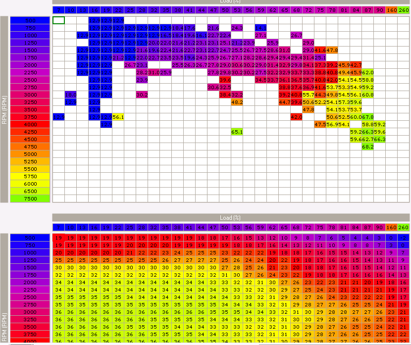 Суть в том, что при малом ТПС и при езде в горку - внатяг - лоад подскакивает до значений, которые обычно означают езду с тапкой в пол. Не, такое я понять не в силах. Такое возможно если только обороты сильно упали. По идее лоад это количество воздуха на один цикл. А какой у тебя угол, скажем, при 2000 об. на круизном лоаде, что детонация появляется? |