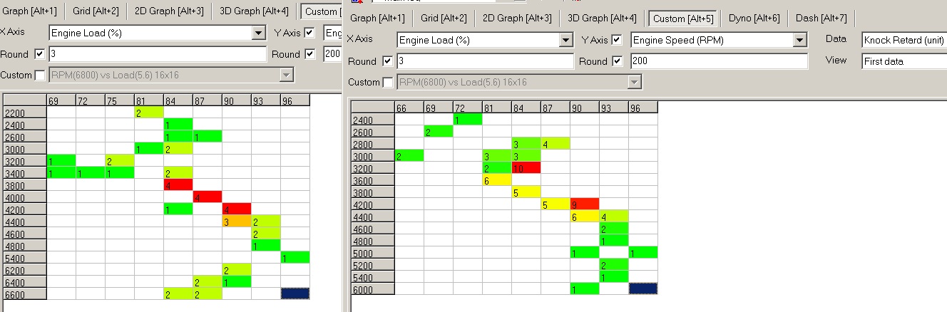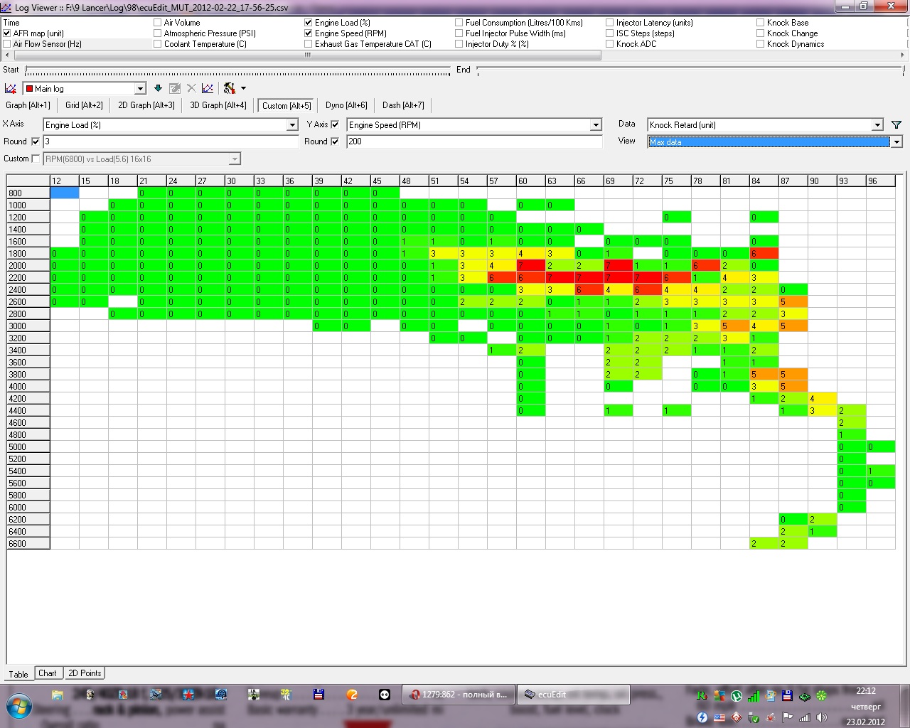 Уж если смотреть логи (с твоего лога) то как то так и я уж думаю спроецировать на карты сможешь ?? в Эдите к тому же есть трассер - если совсем туго. не понял где ignition в логах и octan level ?? (как смотреть откаты зажигания??) где скрины карт AFR и Ignition ?? чего наменял ?? retard до 10-12 считаю нормальным. у меня летом до 19-21 доходило. судя по твоему логу - нормальная работа стокового ДВС да еще на 98 бензине. |