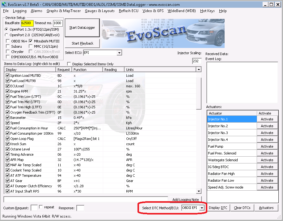 Саша, попробуй в окошке "Select Method/ECU:" выбрать OBDII EFI. Иногда еще бывает глюк - с первого раза читать не хочет, нужно повторить 1 - 2 раза попытку.