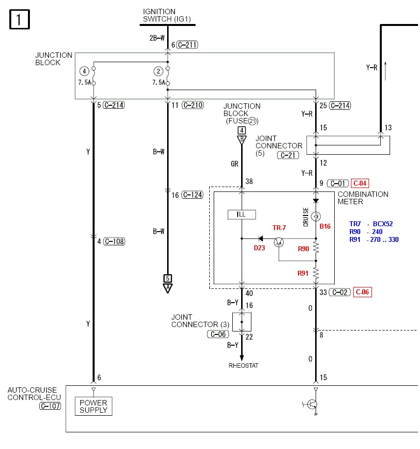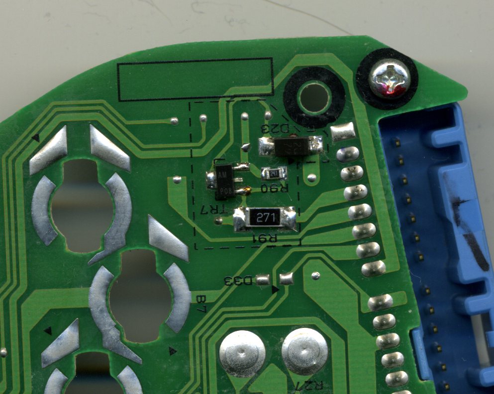 © материала принадлежит Николаю Копаневу, вот ссылка на его пост: http://www.forum.lancer-club.ru/index.php?...t&p=4782683 Публикуется здесь с разрешения автора. * * * Ну, вот, выкладываю свои изыскания по поводу задействования штатной лампочки круиз-контроля. Вот участок схемы, отвечающей за это (с американских лансов): Красным цветом исправлены номера разъёмов (применительно к европейцам) и маркировка элементов с платы приборной панели. Синим - номиналы деталей. Диод может быть практически любой в корпусе DO214-AC (как на фотке ниже) на ток 1А и выше. Я использовал: TR7 - BCX52-16 R90 - 240 Ом R91 - 270 Ом (тестировал с 300 Ом, просто не нашёл в таком корпусе другого подходящего номинала) D23 - даже не знаю, выпаял откуда-то... Вот как это выглядит на плате: Теперь лампочка круиза будет загораться при подаче низкого уровня на контакт 33 разъёма С-06 (синий), и её яркость можно регулировать совместно в яркостью всей приборки штатным реостатом. Один нюанс: осталось проковырять во вставочке с надписью LANCER иконку круиза, или заменить вставочку на другую, где это уже предусмотрено. |