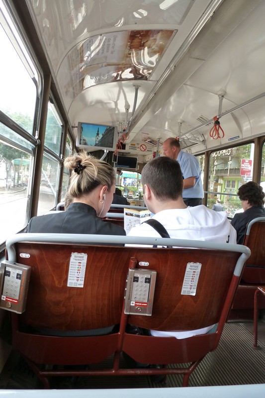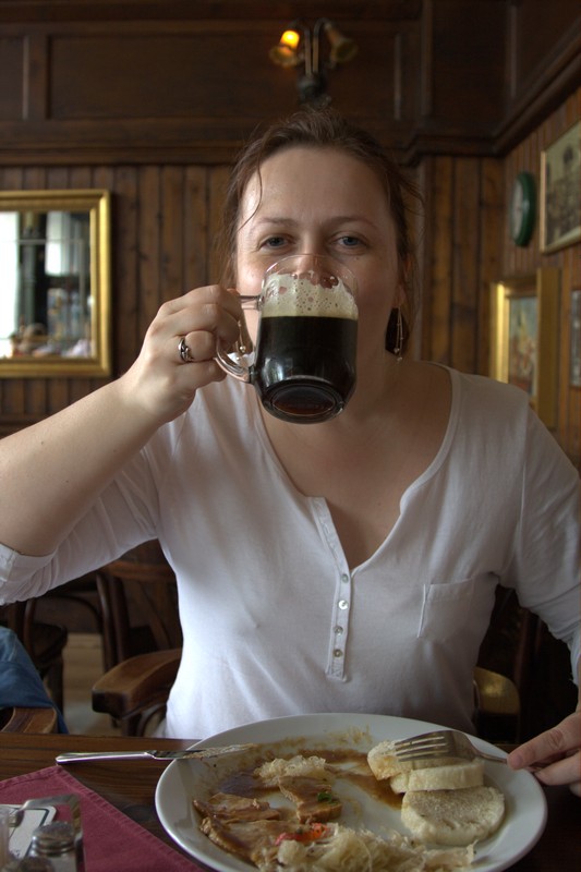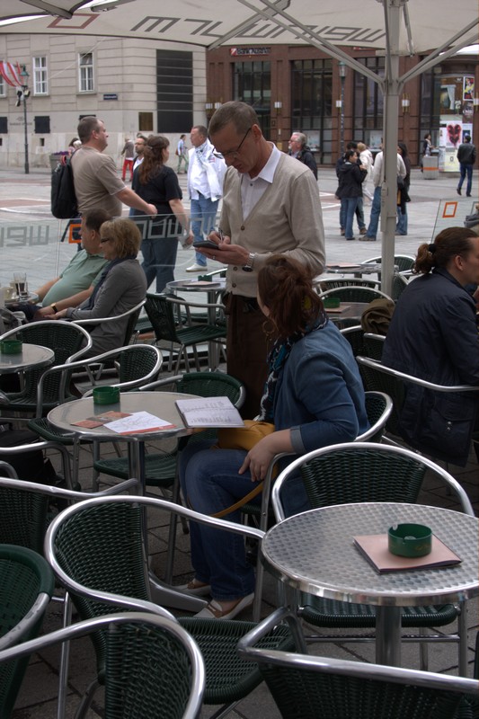 Если у народа будет интерес, то могу сделать типа OnLine отчет о поездке (IMG:style_emoticons/default/smile.gif) Пока первые впечатления от первых полутора дней: Ну вчера, практически первым делом, только забросив вещи в отель, рванули до легендарного места "Пивоварский дом" Вид изнутри "Пивоварского дома" на улочки Праги: Моя жена, снимающая пробу с местного пива: Сегодня погодка подкачала, но тем не менее мы пошли бродить по городу Дошли до Национального Музея и Вацлавской площади: Пофотографировались и пофотографировали... Даже памятники не любят дождик и стараются спрятаться от него под что-нибудь: Вот такая прикольная кафешка есть на Вацлавской площади (Чехия, блин, родина большей части советских трамваев): Слегка "убил" памятник Вацлаву в пассаже "Люцерна" Ну а это я за поеданием блюд местной кухни: ps1. Изумляет плотность дорожного и пешеходного движения в Праге. Его практически нет (IMG:style_emoticons/default/blink.gif) Казалось бы - столица страны, популярнейший туристический центр... А народу на улицах мало, машин - я бы тоже не сказал, что много... ps2. На завтра в планах налет на Вену... ----------------------------------------------------------------------------------------------------------------------------------------------------------------------- 12.06.2012 Вена Раненько утором выскочили из номера, по быстрому позавтракали и рванули на автовокзал Праги. Наш автобус отходил в восемь утра по местному времени. Вот собственно и он: Автобус компании "Евролайн" - это нечто. Не знаю конечно, как у других европейских перевозчиков, но в этом автобусе всю дорогу работал WiFi выход в инет и у каждой пары кресел была розетка на 220 вольт. Так что вполне можно ехать с буком и всю дорогу ползать по инету... Экскурсию по Вене мы начали с самого центра - площади Св. Стефана (Stephansplatz) Ну и как же не присесть в кафе на площади и не попить настоящего венского кофе, ну и не позвонить на родину... Потом двинулись по узеньким Венским улочкам... ... к остановке кольцевого экскурсионного трамвая "Ring Tram" Собственно "Ring Tram" - это почти обычный трамвайчик, бегающий по исторической Вене по кольцевому маршруту. Весь круг он делает за полчаса. Внутри каждое посадочное место оборудовано аудиогидом, в том числе на русском языке. Так что разок проехавшись в этом трамвае, можно получить общее представление о том, где какая достопримечательность находится. Ну и распланировать дальнейший маршрут. Что мы и сделали.... Дальше мы побежали по заинтересовавшим нас местам: Единственные сохранившиеся в настоящее время городские ворота Вены: Главное здание музейного комплекса "Museums Quartier" было изначально построено в качестве придворных конюшен: Один из любимых способов отдыха европейцев - валяться на газоне. Причем этот конкретный газон - газон парка одного из дворцовых комплексов Вены. Вот такие картинки попадаются в витринах Венских магазинов: Ну и я обещал о чешских дорогах. Пока мы ехали от Праги в направлении Брно на некоторых участках автобус весьма ощутимо потряхивало. Я никак не мог понять в чем же дело. Визуально на дороге никаких выбоин/неровностей не было. Да и длина участков со "стиральной доской" наводила на мысли, что скорее они сделаны специально, чем что это дефекты дорожного покрытия. Вот даже видео записал на таком участке дороги. Особо характерный участок в конце ролика. Последним доводом в пользу мысли, что данное извращение сделано намеренно, был закат на обратной дороге. В его свете о