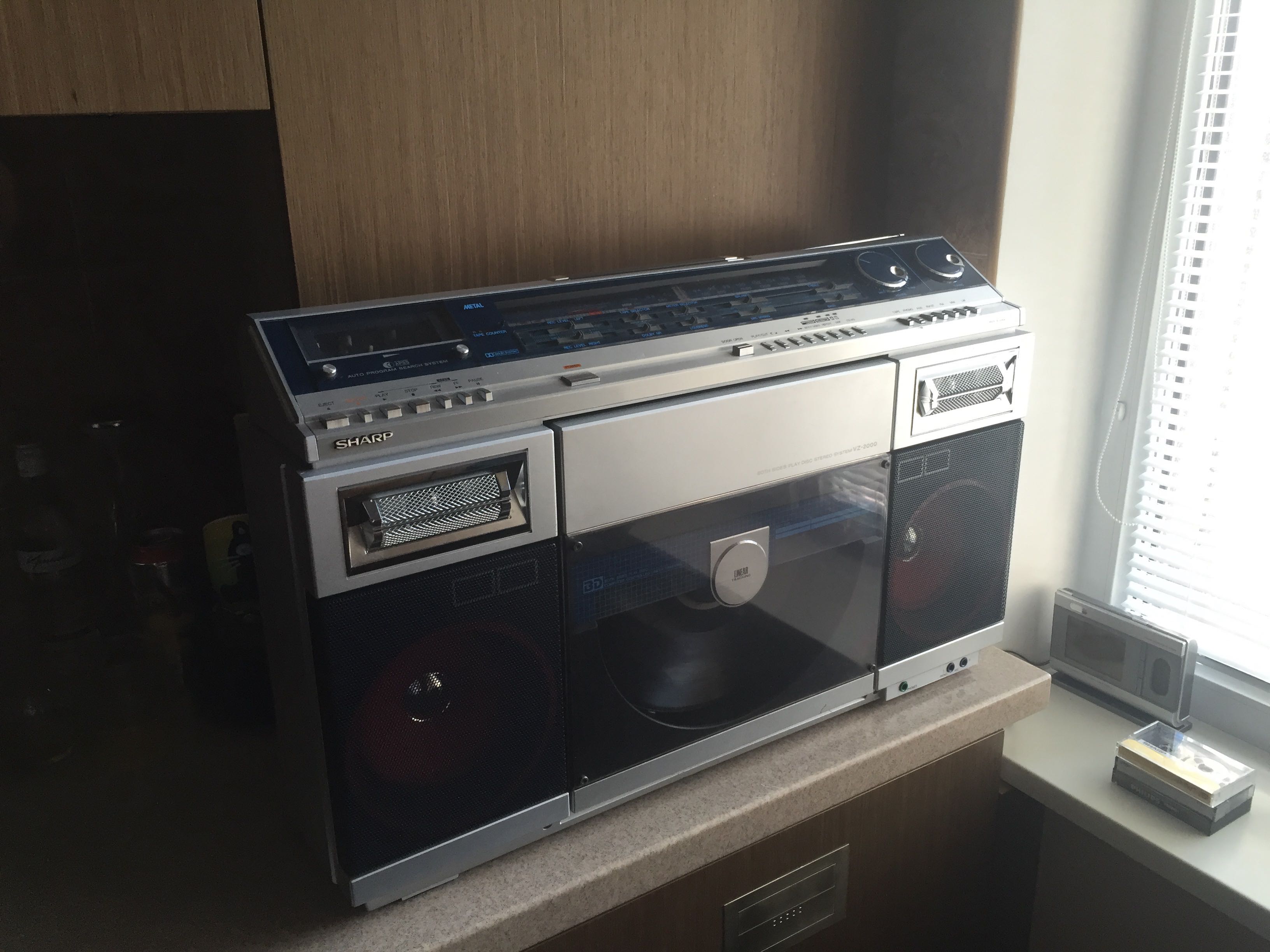 Sharp VZ-2000, в идеальном состоянии. Два тангенциальных тонарма - позволяют проигрывать пластинку с двух сторон не переворачивая, плюс радио, кассетник и все звучит весьма (IMG:style_emoticons/default/smile.gif)