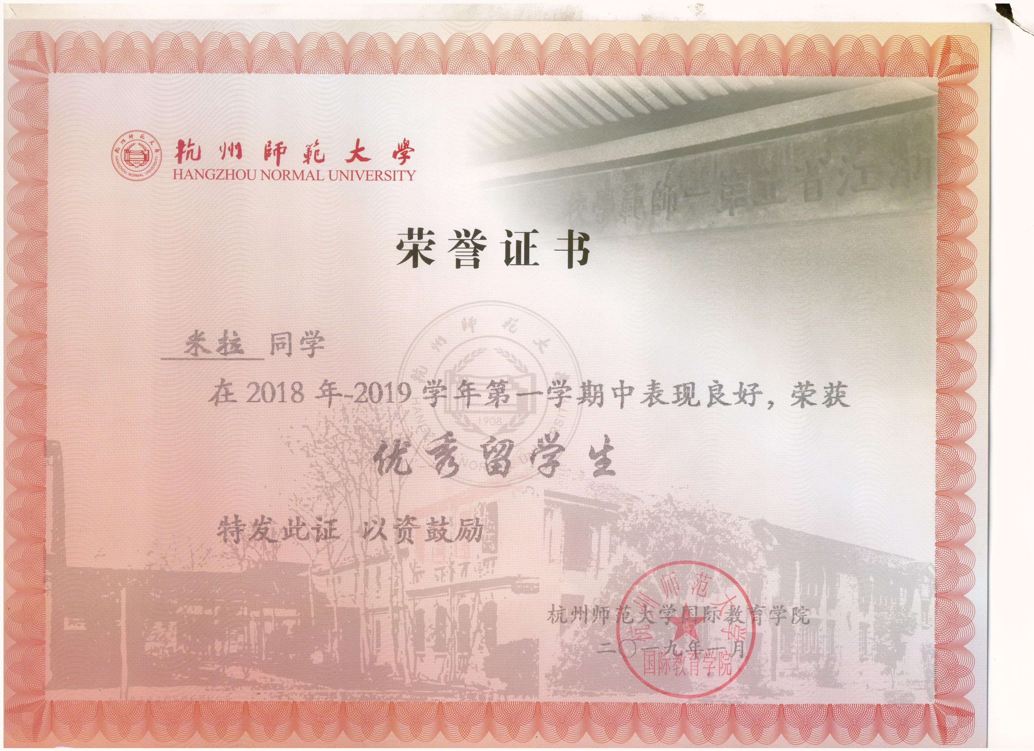 Мог бы и перевод типа такого прилепить: НОРМАЛЬНЫЙ УНИВЕРСИТЕТ ХАНЧЖОУ Почетные сертификаты Студенты в первом семестре учебного года 2018-2019 показали хорошие результаты и получили награду для выдающихся иностранных студентов за поощрение государственного отделения. (IMG:style_emoticons/default/biggrin.gif) (IMG:style_emoticons/default/drinks.gif) |