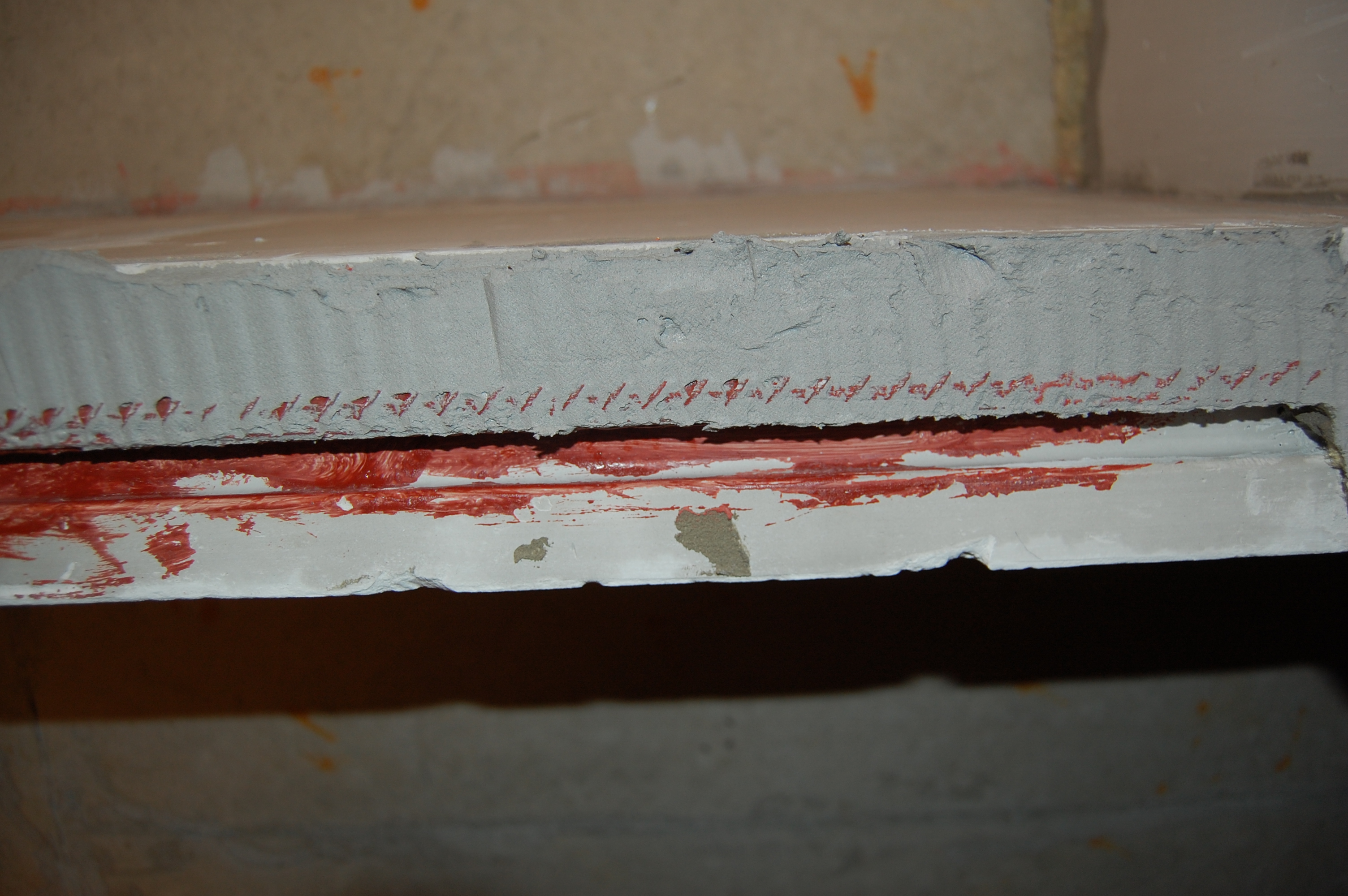 Стены из пазогребневых гипсовых блоков (ПГБ) Отколотый кусок над дверью кладём на место на клей Проходим швы и заполняем щель между ПГБ и потолком Заталкиваем клей в щель перемычки над дверным проёмом Так как клей ещё остался, то можно начать сравнивать низ блока и арматурины для верхней части коробки двери Специально для этого клей разводить не нужно, т.к. впереди ещё штукатурка стен и будет много раз не угадано, как в большую, так и в меньшую сторону: А сколько штукатурки замесить для вот этой дырки? (IMG:style_emoticons/default/laugh.gif) |