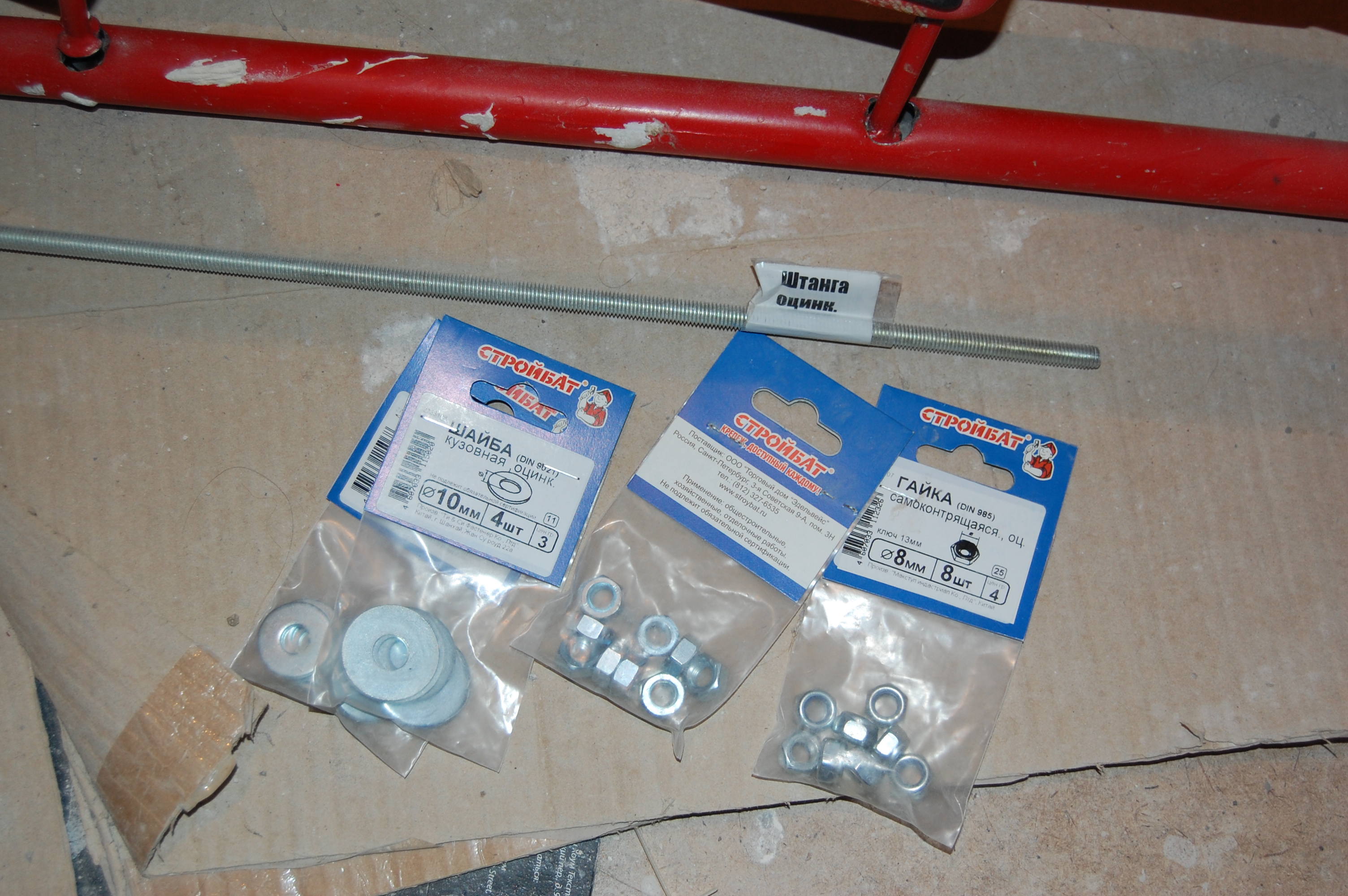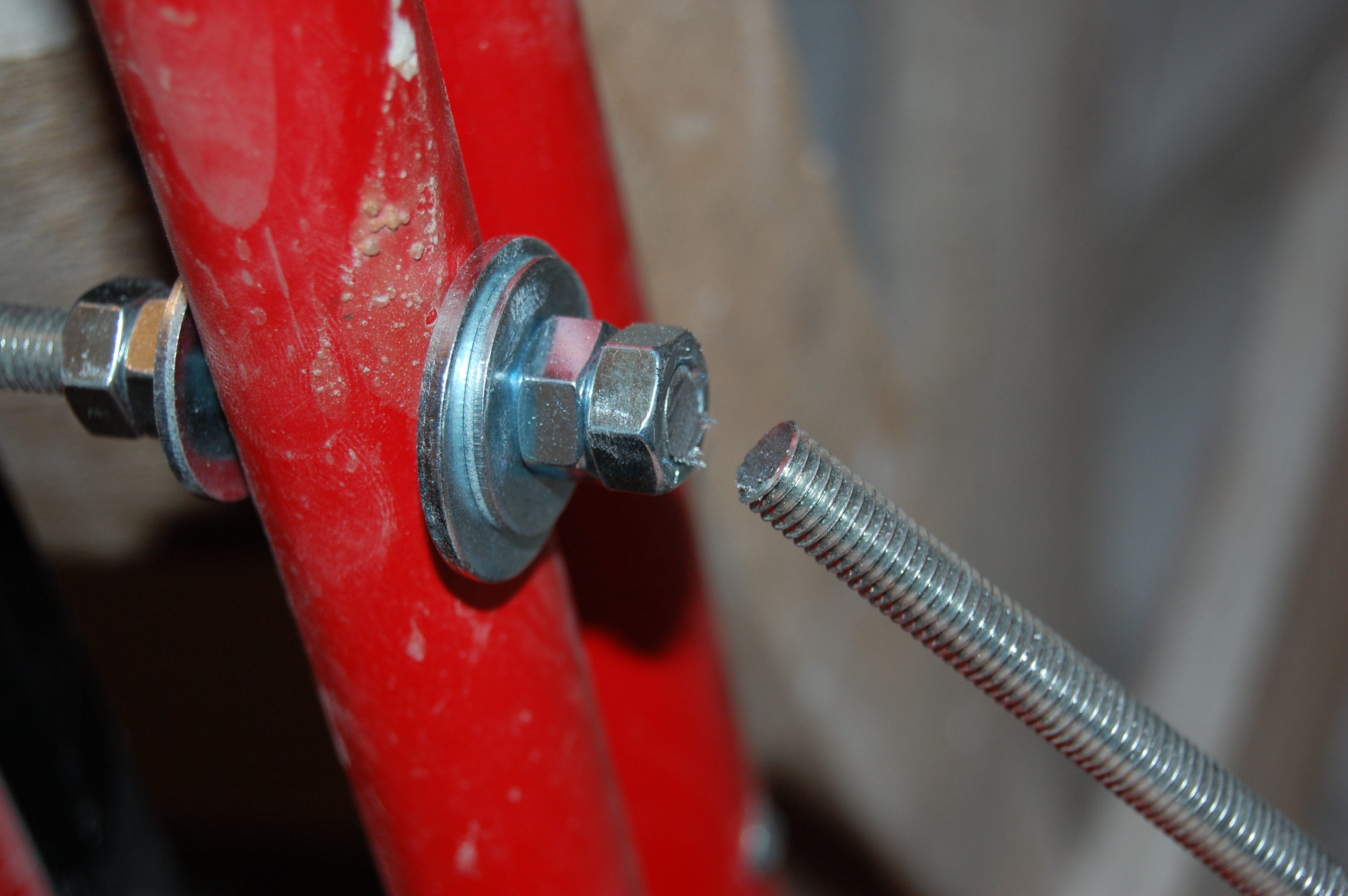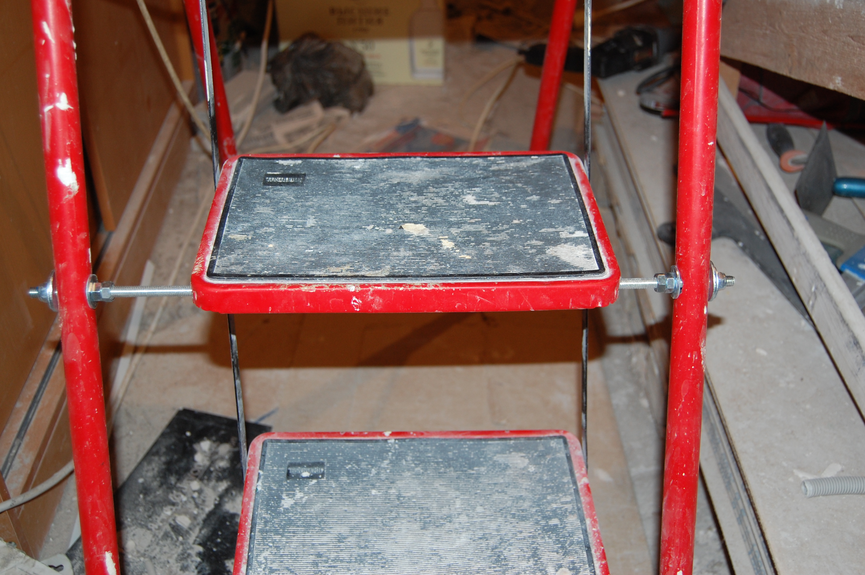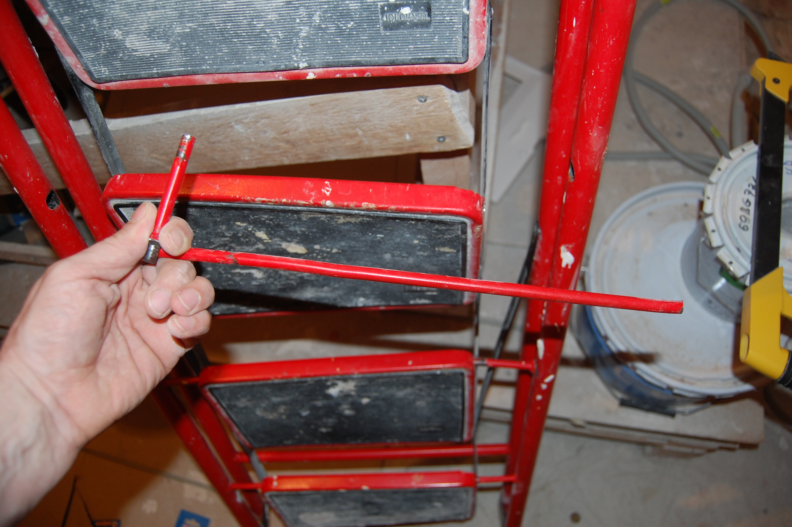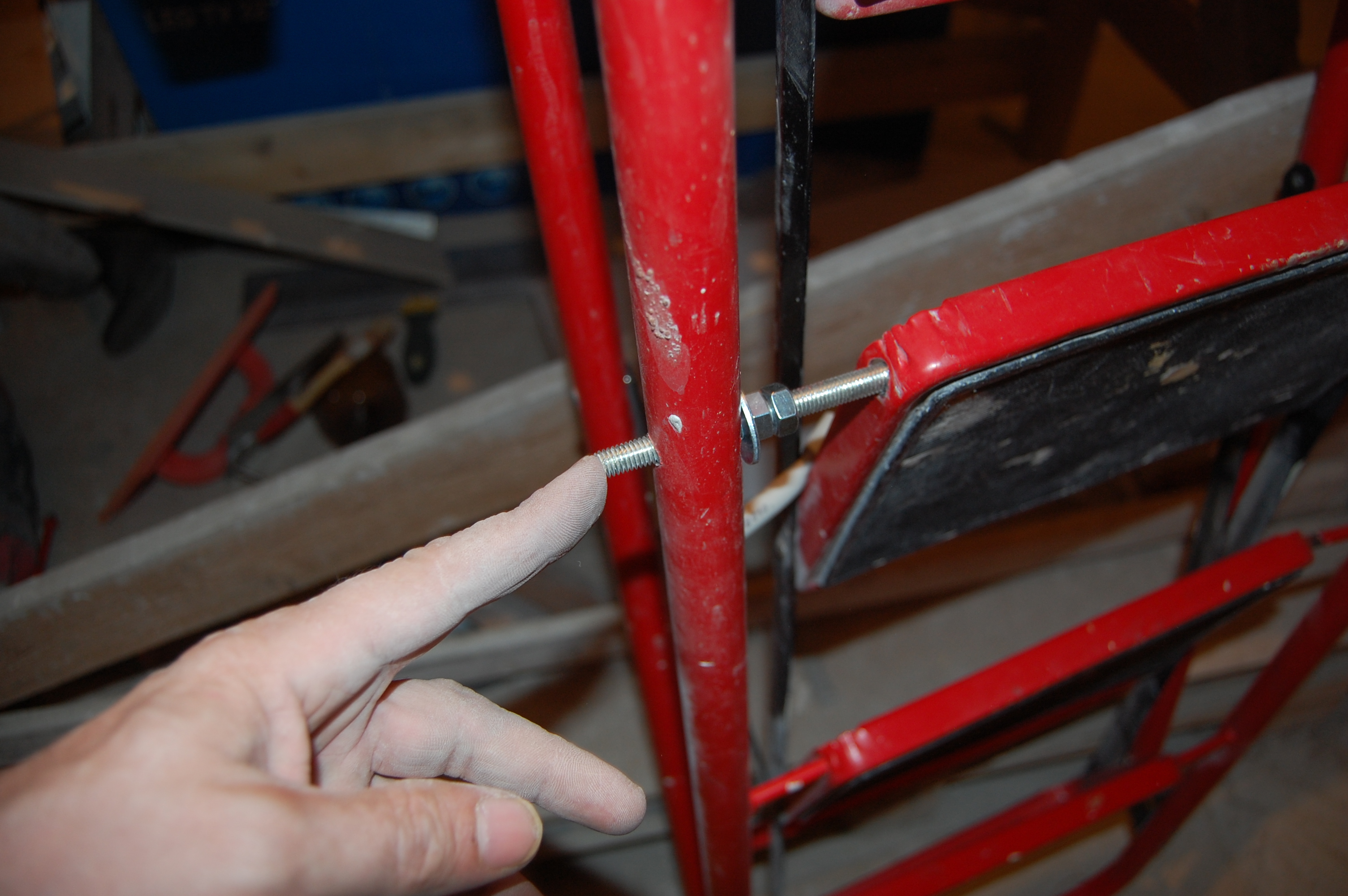 Но манипуляции без стремянки ( старожилы помнят топик посвящённый поломке ) стали неудобны и немобильны. Итак чиним стремянку Вот она моя красавица! (IMG:style_emoticons/default/smile.gif) Чем она удобна и почему я её пёр через границу (IMG:style_emoticons/default/laugh.gif) Ну во-первых, конечно жадность! (IMG:style_emoticons/default/biggrin.gif) Где в Москве купишь стремянку за 800 рублей? А тут всё равно машина пустая шла. Во-вторых, ступеньки. На ступеньку можно стать полной стопой, крутиться не слезая со стремянки на ступеньках не теряя равновесия и не опираясь и не цепляясь ни за что руками. И к тому же на ступеньках прорезиненные накладки - в какой бы обуви не залез, нога не соскользнёт. Но вот приключилась с ней беда - стали отваливаться перекладины Встанешь на такую ступеньку, согнётся по краям оторванная распорка и ... не поднимешься высоко (IMG:style_emoticons/default/laugh.gif) Помнится, когда думал её заварить, Серёга Лан упомянул про шпильки. Не знаю, что он имел ввиду, но наверно я претворил его идею в ... стремянку (IMG:style_emoticons/default/biggrin.gif) Заскочив в Леруа запасся ремкомплектом Поддерживающий ступеньку прут перепилил. Металл сырой - пилится "на ура" Перепилил. Вытащил. С обратной стороны образовавшейся дыры на ноге стремянки делаю отверстие Керню, чтоб сверло не соскальзывало Сверлю В просверленное отверстие на ноге стремянки продеваю шпильку, перед тем как проткнуть шпилькой ступеньку накидываю шайбу и пару гаек С противоположной стороны ступеньки перед тем как проткнуть ногу тоже гайки и шайбу Фиксирую шпильку в нужном положении и конторю её гайками с одной и с другой стороны С внешней стороны оставил хвостик, чтобы так же влезли шайба и две гайки. В принципе снаружи надел потом самоконторящиеся гайки, но что-то они мне не внушили доверия при осмотре, поэтому на всякий пожарный делал хвост под две обычных С другой стороны отпиливаю ( можно ножовкой, можно болгаркой ) лишнюю шпильку ( ну она на следующую ступеньку пойдёт ) Чтобы не тянуть сопротивляющуюся контргайку через полсотни сантиметров свободной шпильки, перед тем как пилить шпильку на неё надо надеть простую гайку, которая при откручивании восстановит резьбу на месте отпила Надеваю на её место самоконторящююся Затягиваю гайки и проверяю работоспособность. Вот стремяночка подставив ступенечку стоит Вот сложилась Со второй отвалившейся ступенькой делаю то же самое и любуюсь (IMG:style_emoticons/default/smile.gif) |