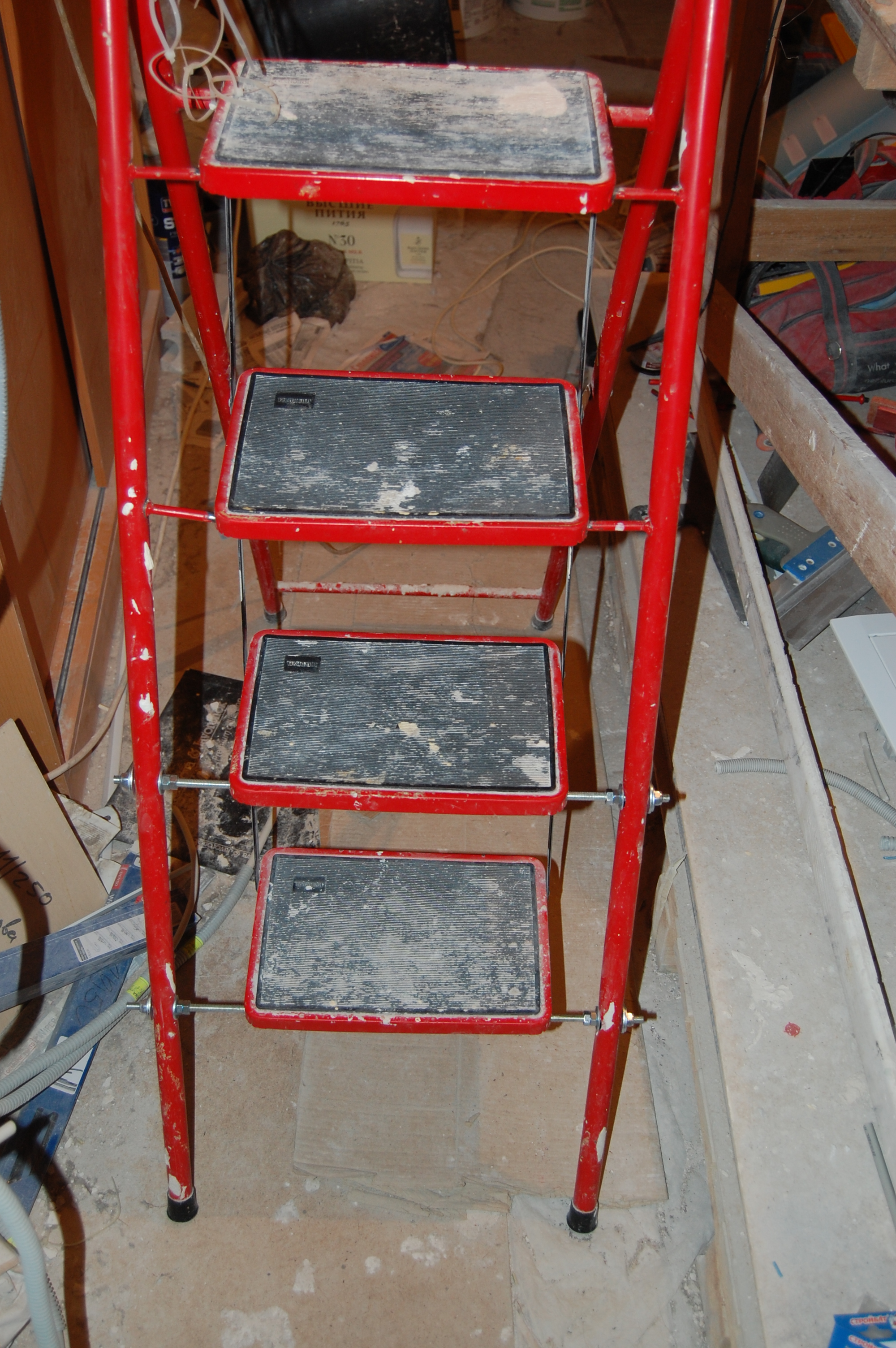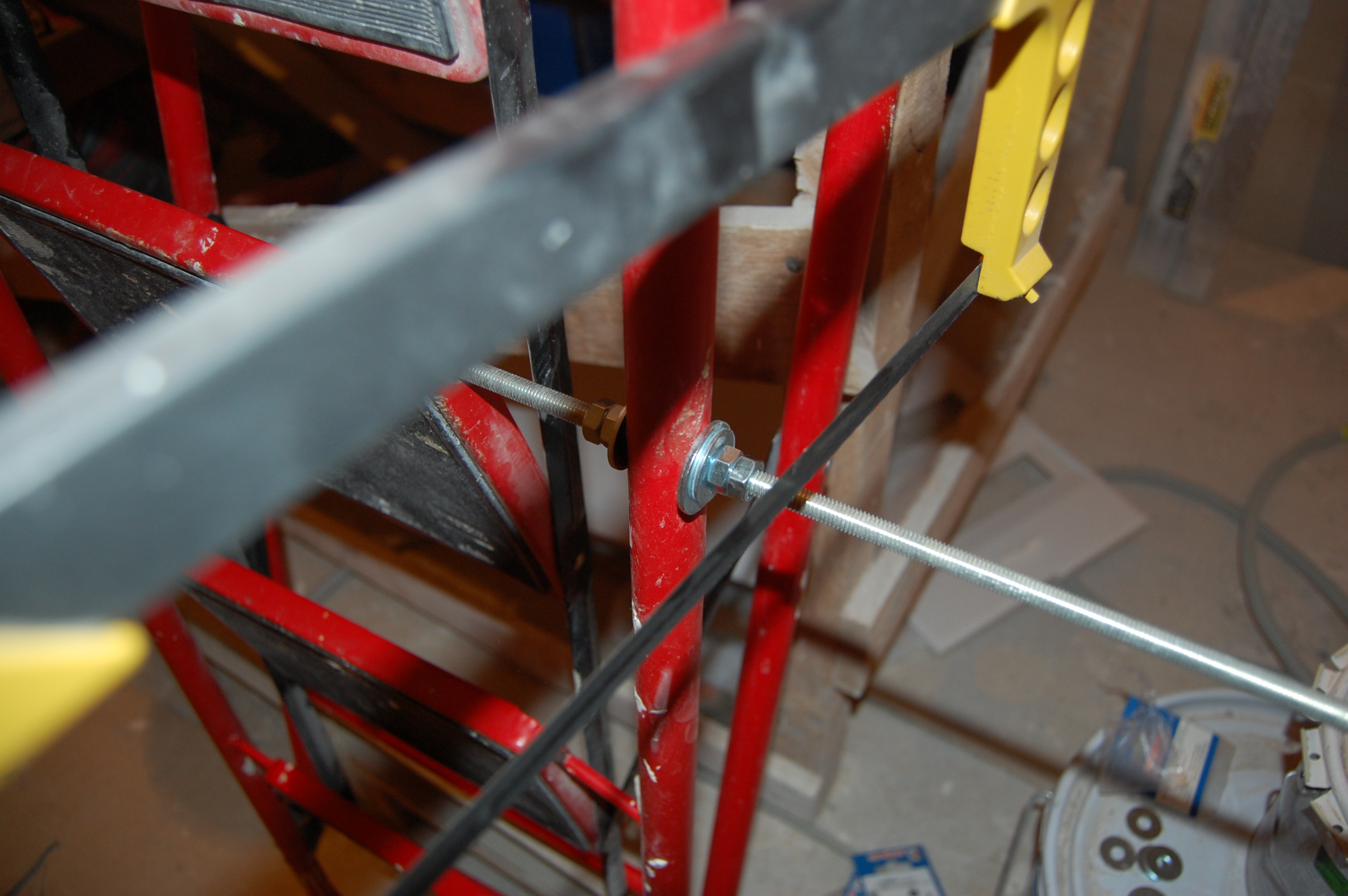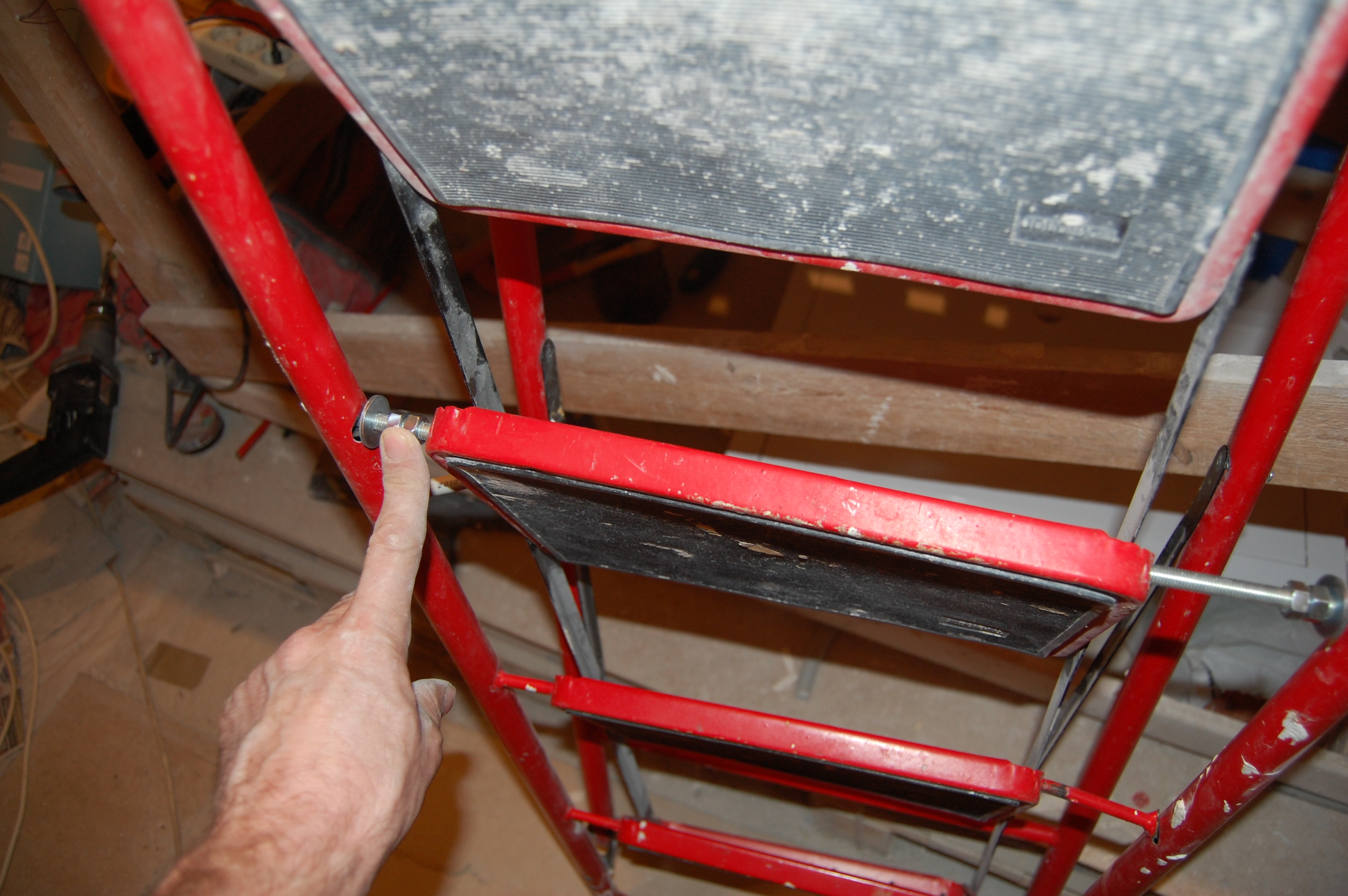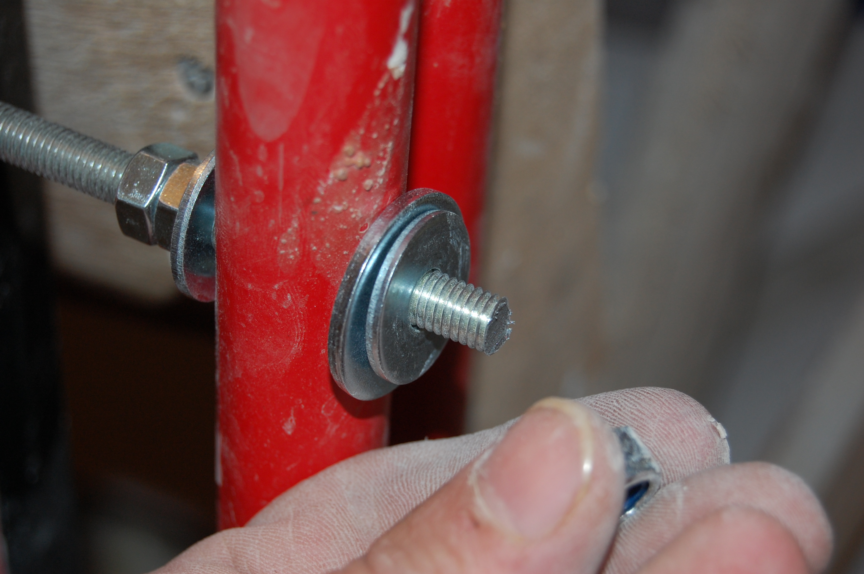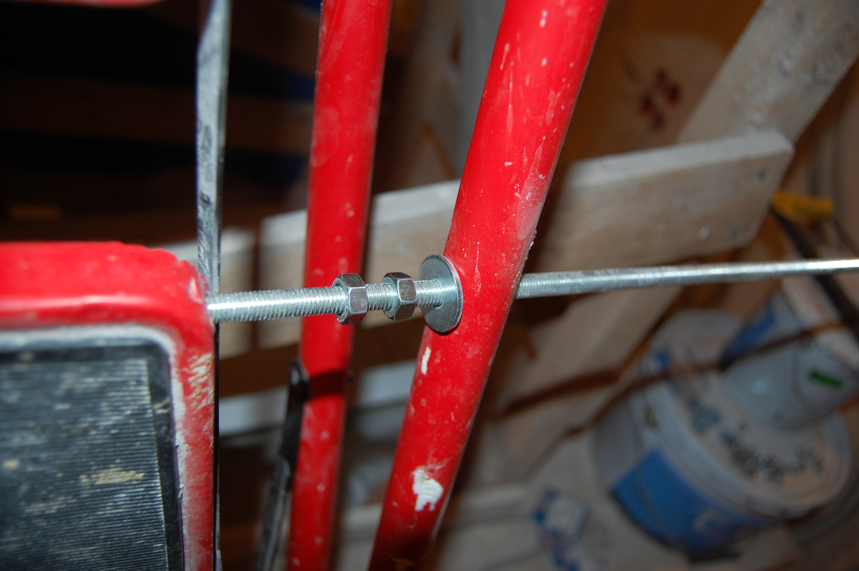 Но манипуляции без стремянки ( старожилы помнят топик посвящённый поломке ) стали неудобны и немобильны. Итак чиним стремянку Вот она моя красавица! (IMG:style_emoticons/default/smile.gif) Чем она удобна и почему я её пёр через границу (IMG:style_emoticons/default/laugh.gif) Ну во-первых, конечно жадность! (IMG:style_emoticons/default/biggrin.gif) Где в Москве купишь стремянку за 800 рублей? А тут всё равно машина пустая шла. Во-вторых, ступеньки. На ступеньку можно стать полной стопой, крутиться не слезая со стремянки на ступеньках не теряя равновесия и не опираясь и не цепляясь ни за что руками. И к тому же на ступеньках прорезиненные накладки - в какой бы обуви не залез, нога не соскользнёт. Но вот приключилась с ней беда - стали отваливаться перекладины Встанешь на такую ступеньку, согнётся по краям оторванная распорка и ... не поднимешься высоко (IMG:style_emoticons/default/laugh.gif) Помнится, когда думал её заварить, Серёга Лан упомянул про шпильки. Не знаю, что он имел ввиду, но наверно я претворил его идею в ... стремянку (IMG:style_emoticons/default/biggrin.gif) Заскочив в Леруа запасся ремкомплектом Поддерживающий ступеньку прут перепилил. Металл сырой - пилится "на ура" Перепилил. Вытащил. С обратной стороны образовавшейся дыры на ноге стремянки делаю отверстие Керню, чтоб сверло не соскальзывало Сверлю В просверленное отверстие на ноге стремянки продеваю шпильку, перед тем как проткнуть шпилькой ступеньку накидываю шайбу и пару гаек С противоположной стороны ступеньки перед тем как проткнуть ногу тоже гайки и шайбу Фиксирую шпильку в нужном положении и конторю её гайками с одной и с другой стороны С внешней стороны оставил хвостик, чтобы так же влезли шайба и две гайки. В принципе снаружи надел потом самоконторящиеся гайки, но что-то они мне не внушили доверия при осмотре, поэтому на всякий пожарный делал хвост под две обычных С другой стороны отпиливаю ( можно ножовкой, можно болгаркой ) лишнюю шпильку ( ну она на следующую ступеньку пойдёт ) Чтобы не тянуть сопротивляющуюся контргайку через полсотни сантиметров свободной шпильки, перед тем как пилить шпильку на неё надо надеть простую гайку, которая при откручивании восстановит резьбу на месте отпила Надеваю на её место самоконторящююся Затягиваю гайки и проверяю работоспособность. Вот стремяночка подставив ступенечку стоит Вот сложилась Со второй отвалившейся ступенькой делаю то же самое и любуюсь (IMG:style_emoticons/default/smile.gif) |