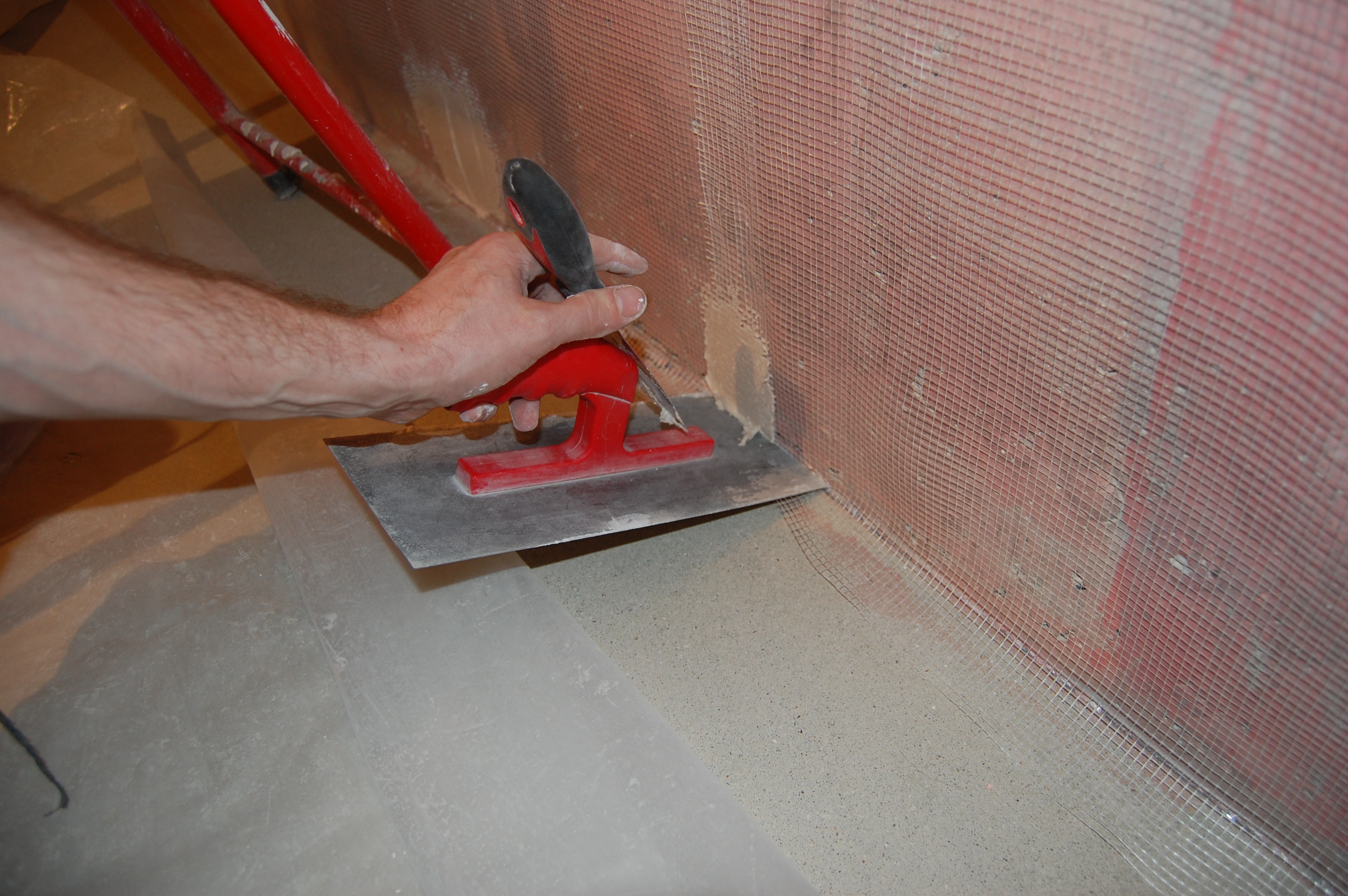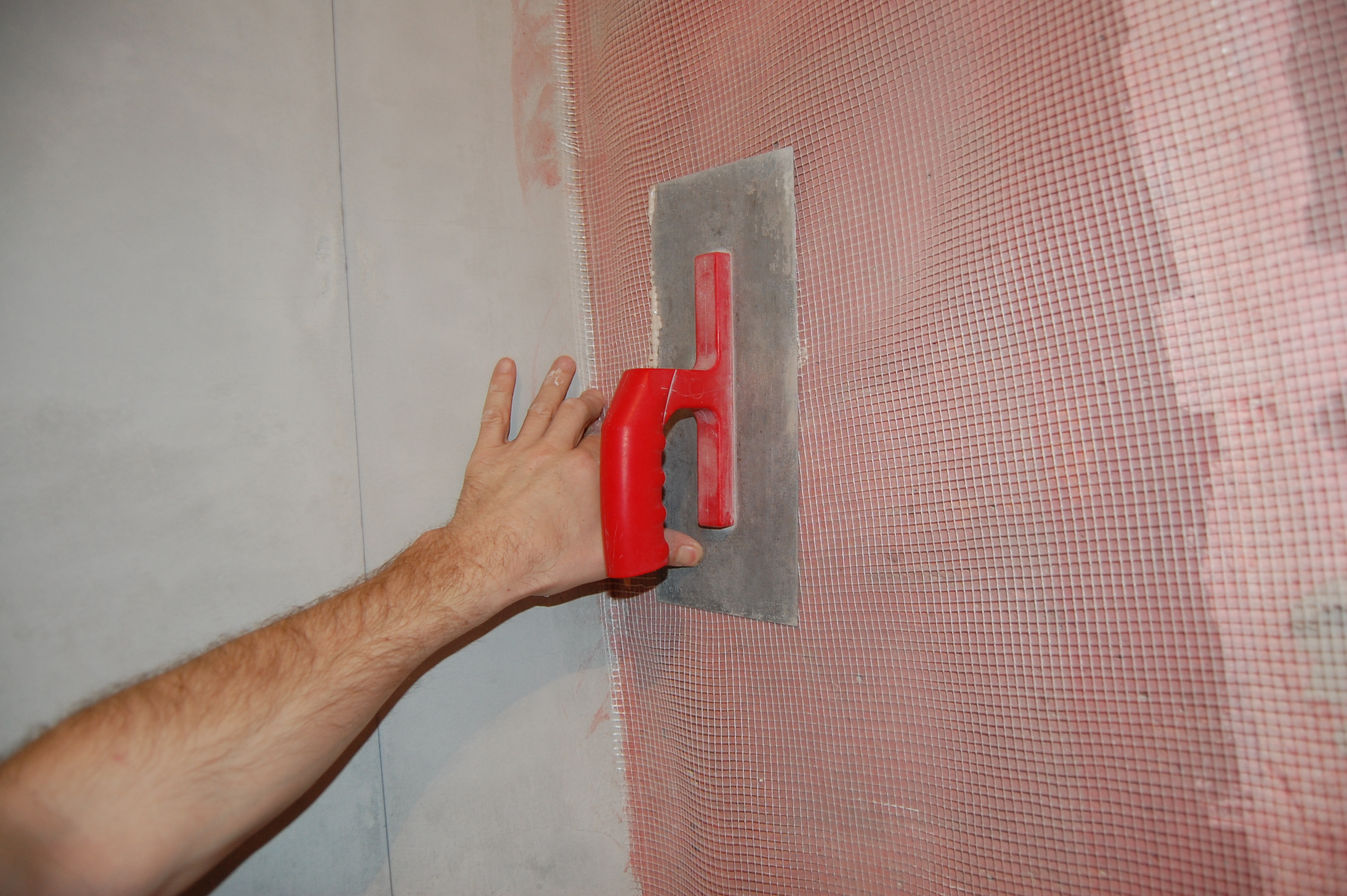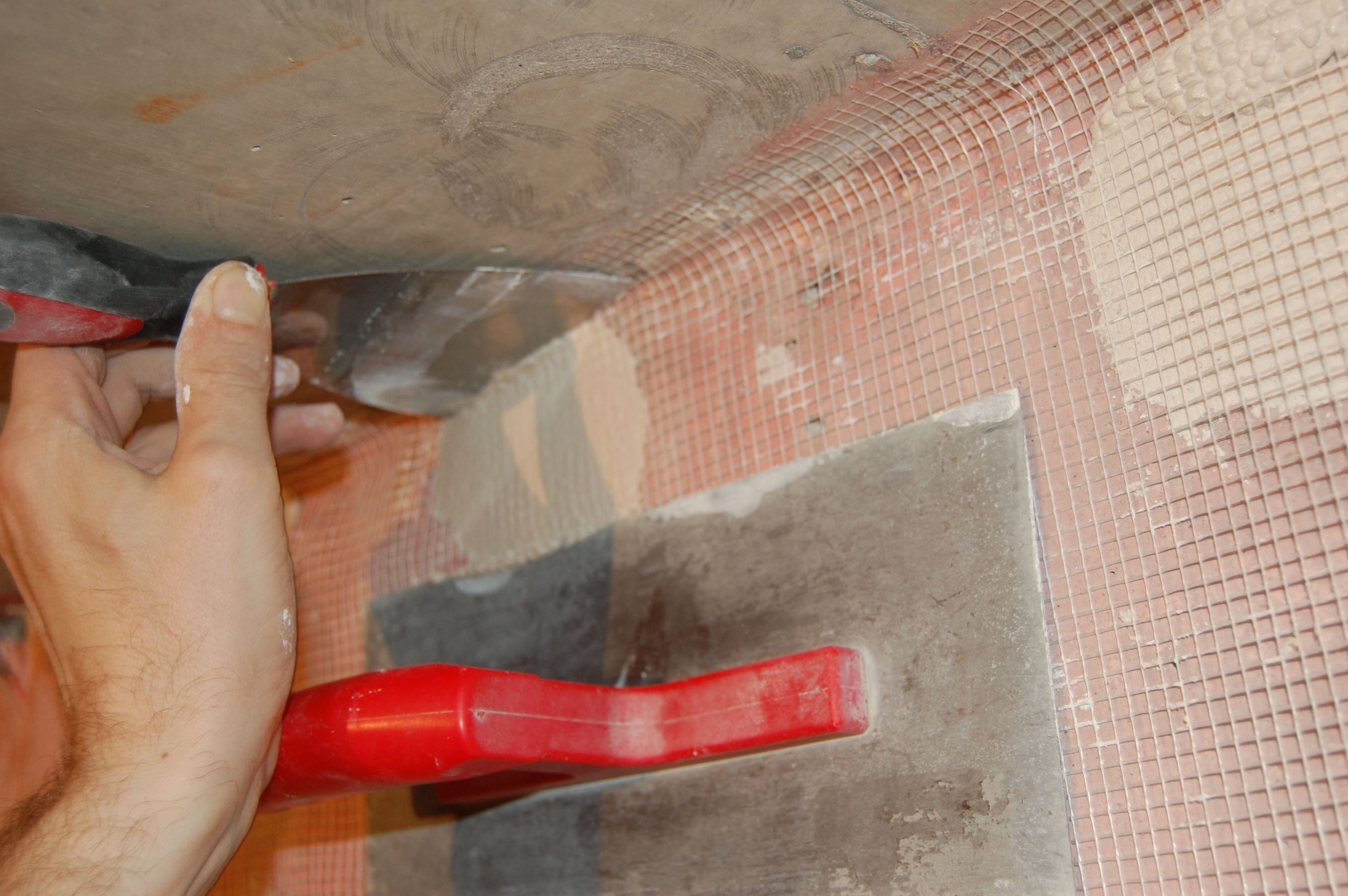 Распластываться раствор будет после накладки второй сетки В середине полотна удобно топить сетку в раствор гладилкой, держа её почти параллельно стене, приподняв тот её край, в сторону движения гладилки, и придерживая сетку с противоположной стороны Постоянно разглаживая сетку лёгкими движениями Спускаемся сверху вниз На пересечении стены и пола складываем внатяг уголком сетку Ну и в принципе аналогично верхнему пересечению примазываем сетку |