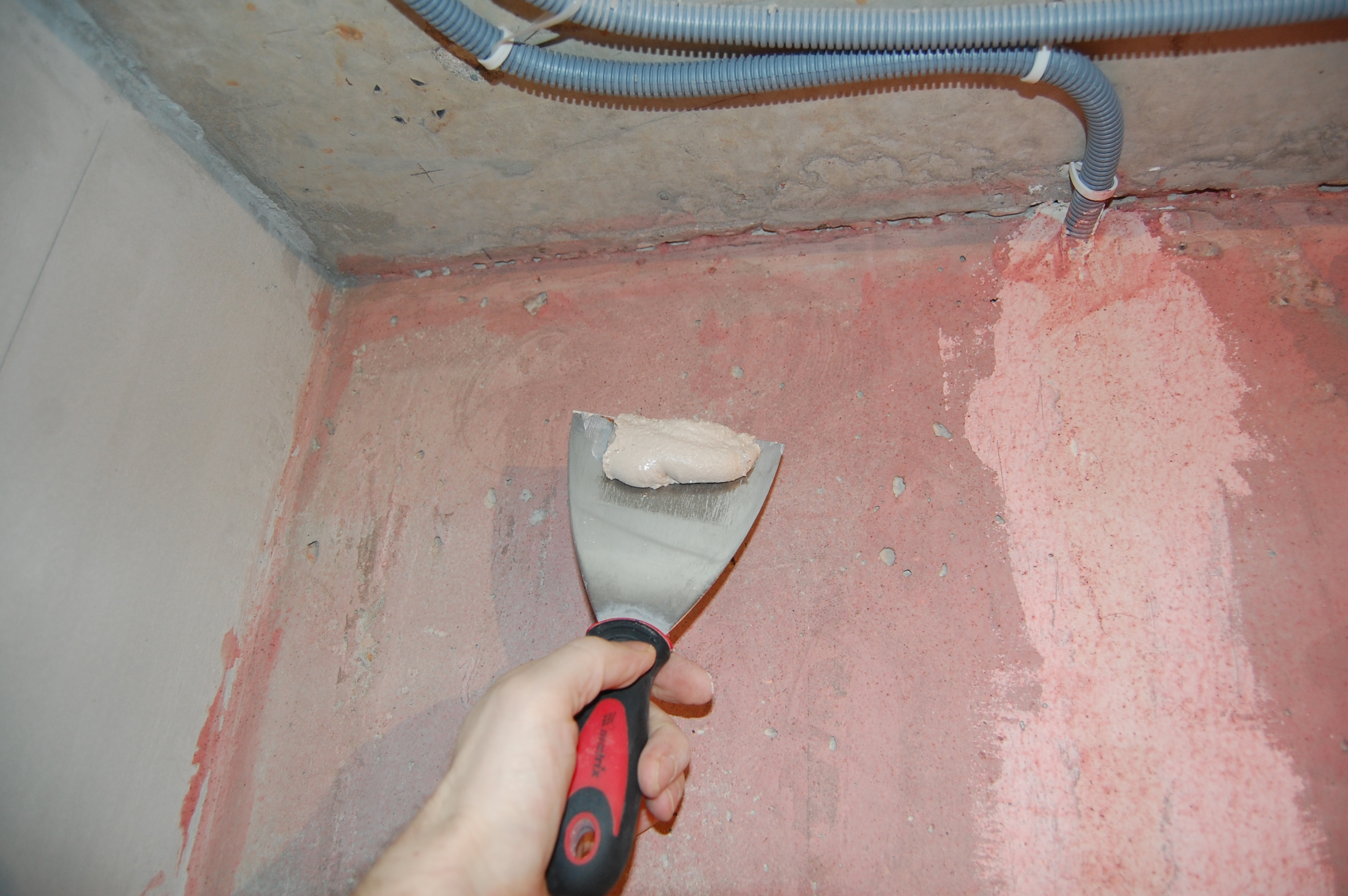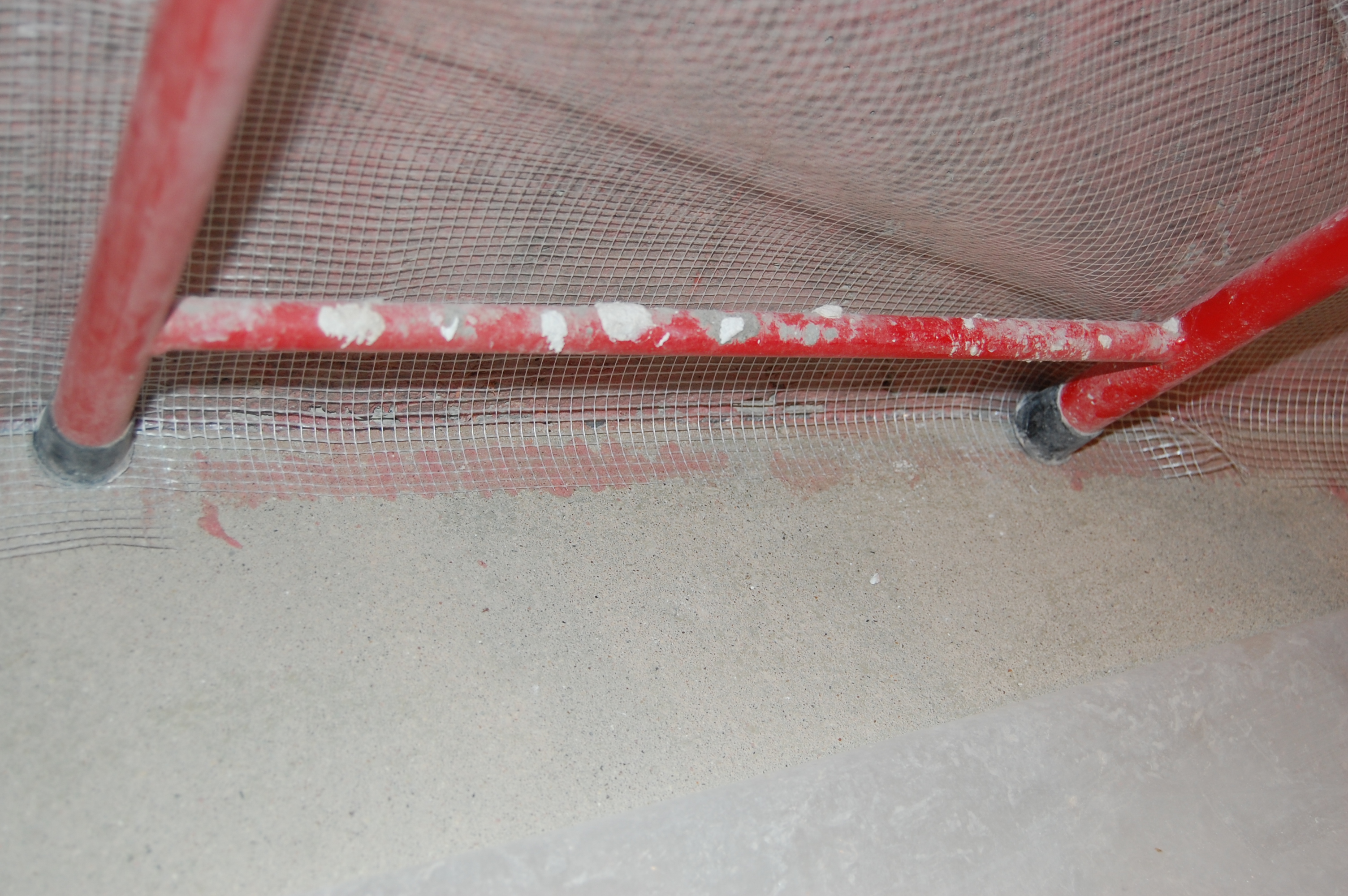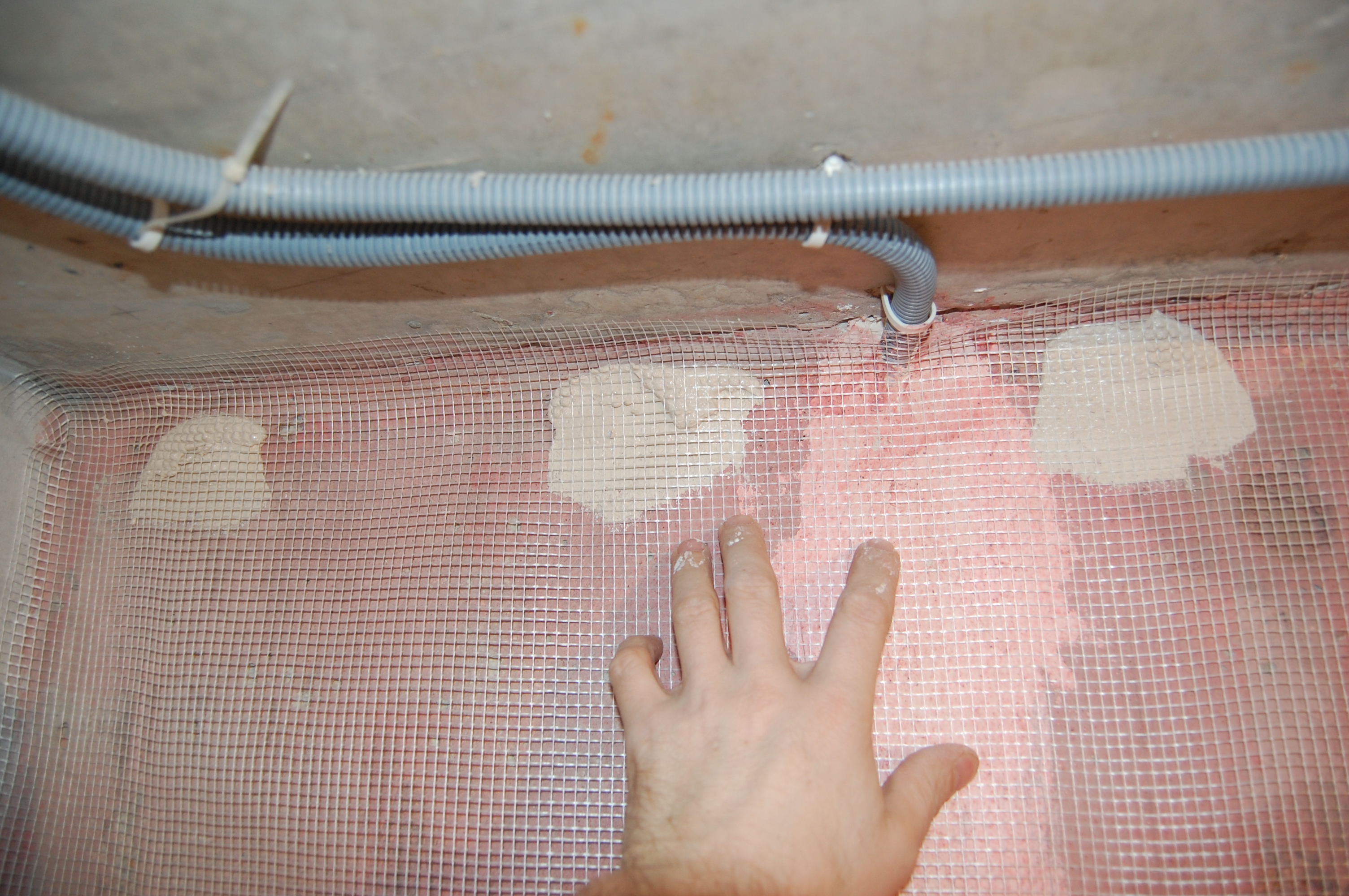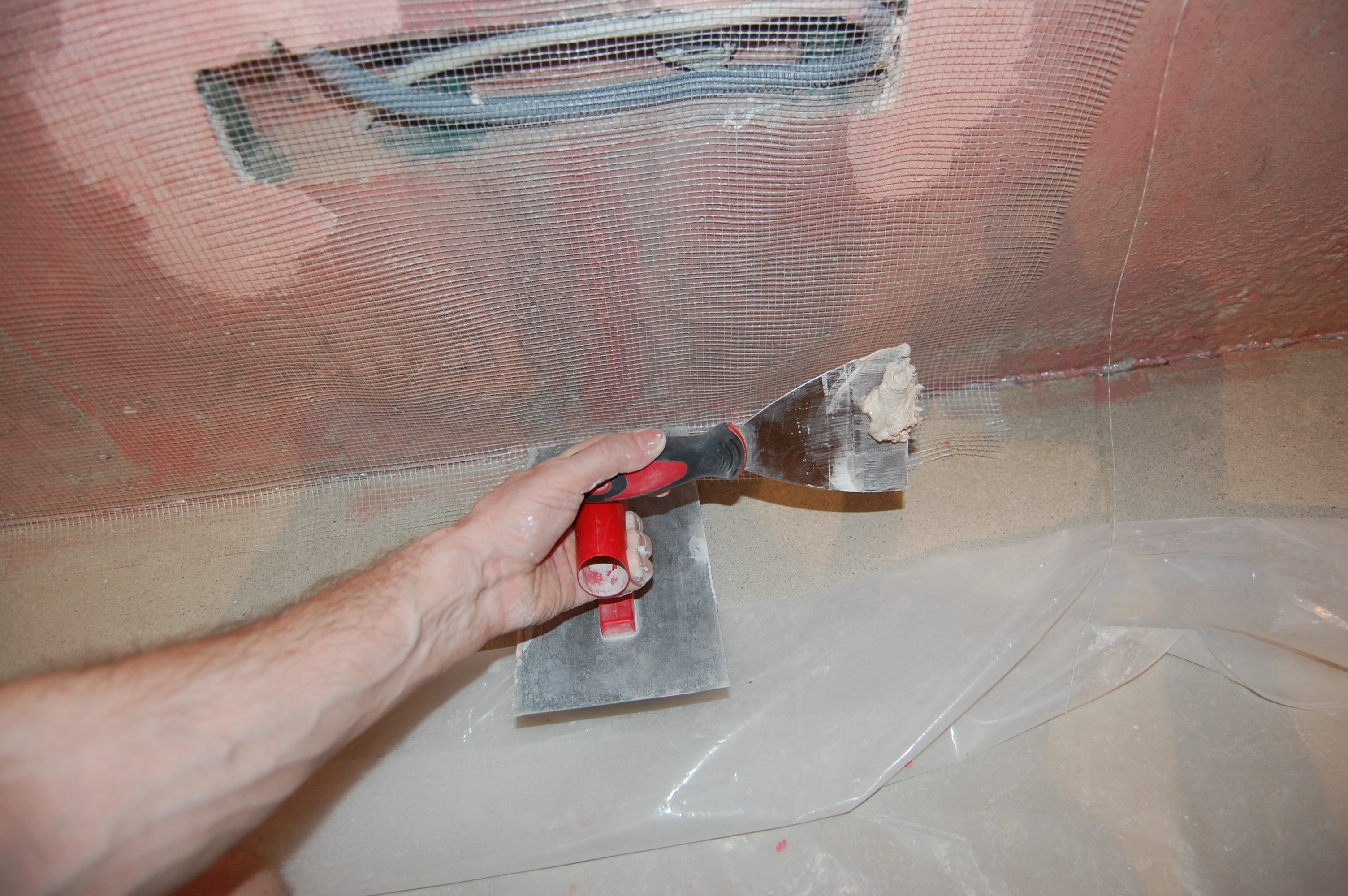 Распластываться раствор будет после накладки второй сетки В середине полотна удобно топить сетку в раствор гладилкой, держа её почти параллельно стене, приподняв тот её край, в сторону движения гладилки, и придерживая сетку с противоположной стороны Постоянно разглаживая сетку лёгкими движениями Спускаемся сверху вниз На пересечении стены и пола складываем внатяг уголком сетку Ну и в принципе аналогично верхнему пересечению примазываем сетку |