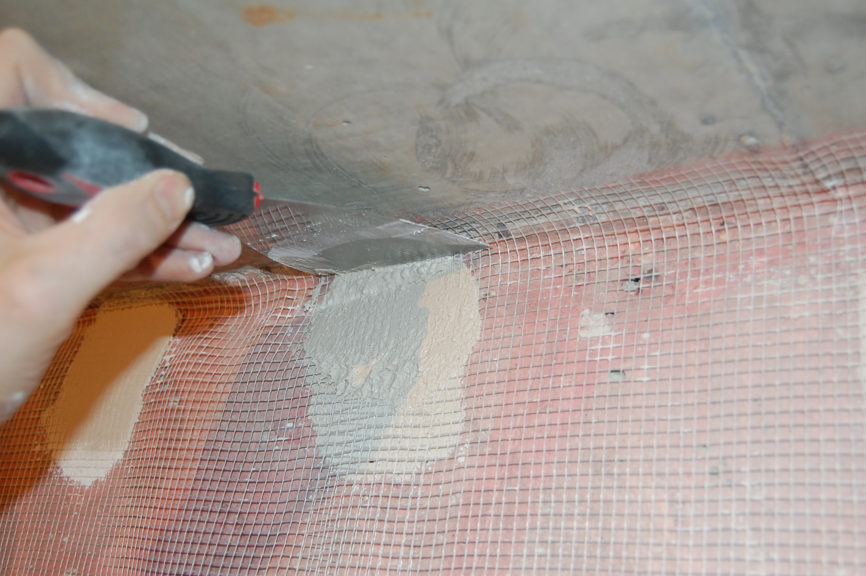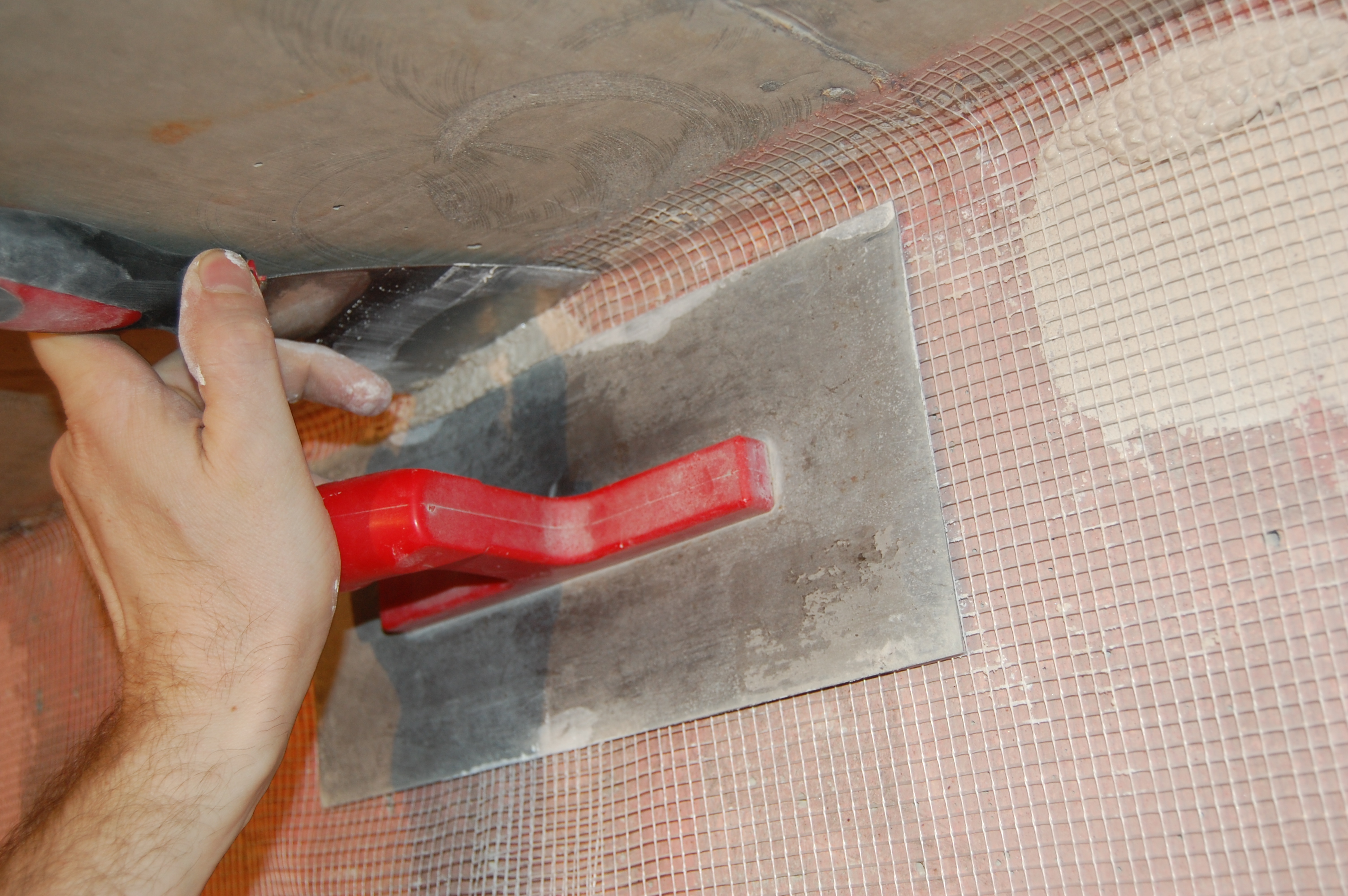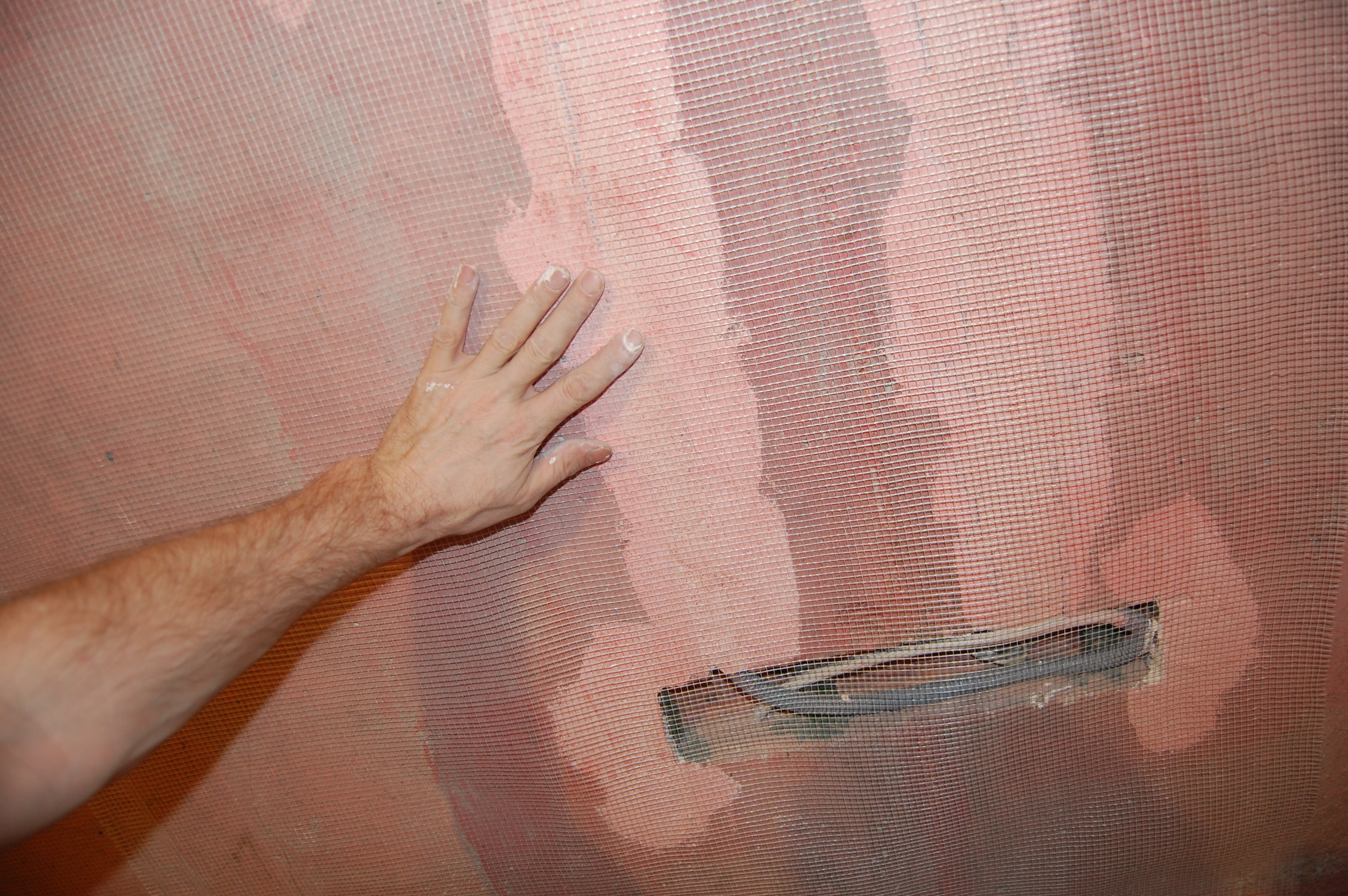 Действительно есть такой способ армирования штукатурки: Если слой штукатурки достаточно толстый, можно нанести первый слой. Полностью просушить его. Приклеить к нему армирующую сетку. Накрыть вторым слоем. Всё дело тут в том, что штукатурные слои между собой сцепляются гораздо крепче, чем штукатурка с основанием. Способ не столько трудоёмкий сколько растянут во времени. Поэтому используется только в случае крайней необходимости. Прямо по ширине рулона на стене ставится метка. Особой точности не требуется. Разводится небольшое кол-во штукатурки Небольшими порциями наносится на стену побольше на верх и реденько по всей остальной полосе полотна не пришлёпывая Вплотную к стенке ставится стремянка на неё кладётся полотно Ножки стремянки, ставятся на сетку, чтобы полотно растянуть ровно, параллельно, без провисов, перекособочиваний Вверх сетка натягивается и примеряется по месту Если что-то мешает плотному прилеганию сетки, то на ней просто делается надрез ( не надо ничего фигурного вырезать! ) Чтобы сетка не стягивалась при примазывании раствором, край сетки шпателем/гладилкой/кельмой прижимается в угол между потолком и стеной Другой шпатель/гладилка/кельма прижимается ниже к шпателю/гладилке/кельме и практически параллельно стене И плотно прижимаясь к стене стягивается вниз |