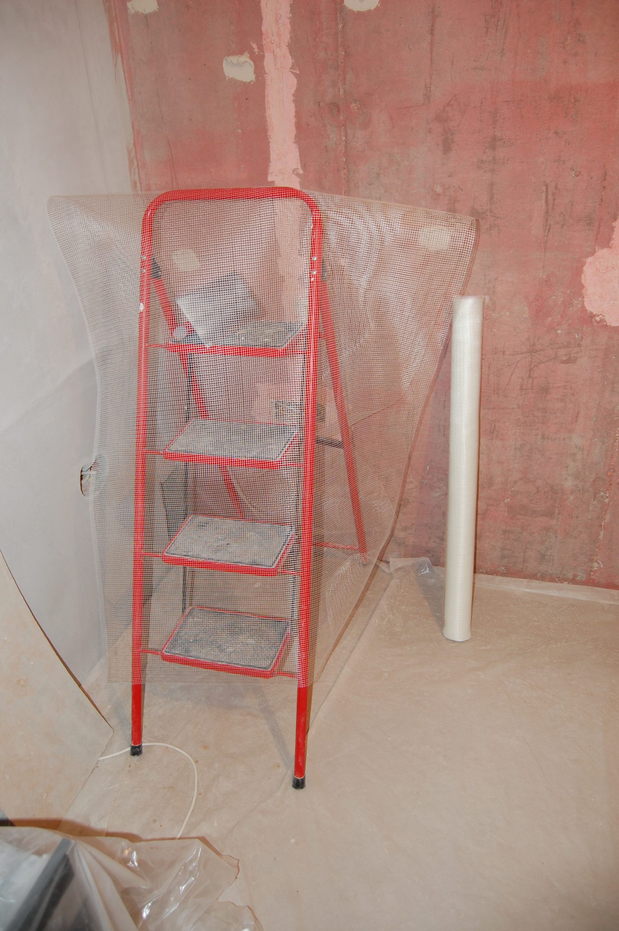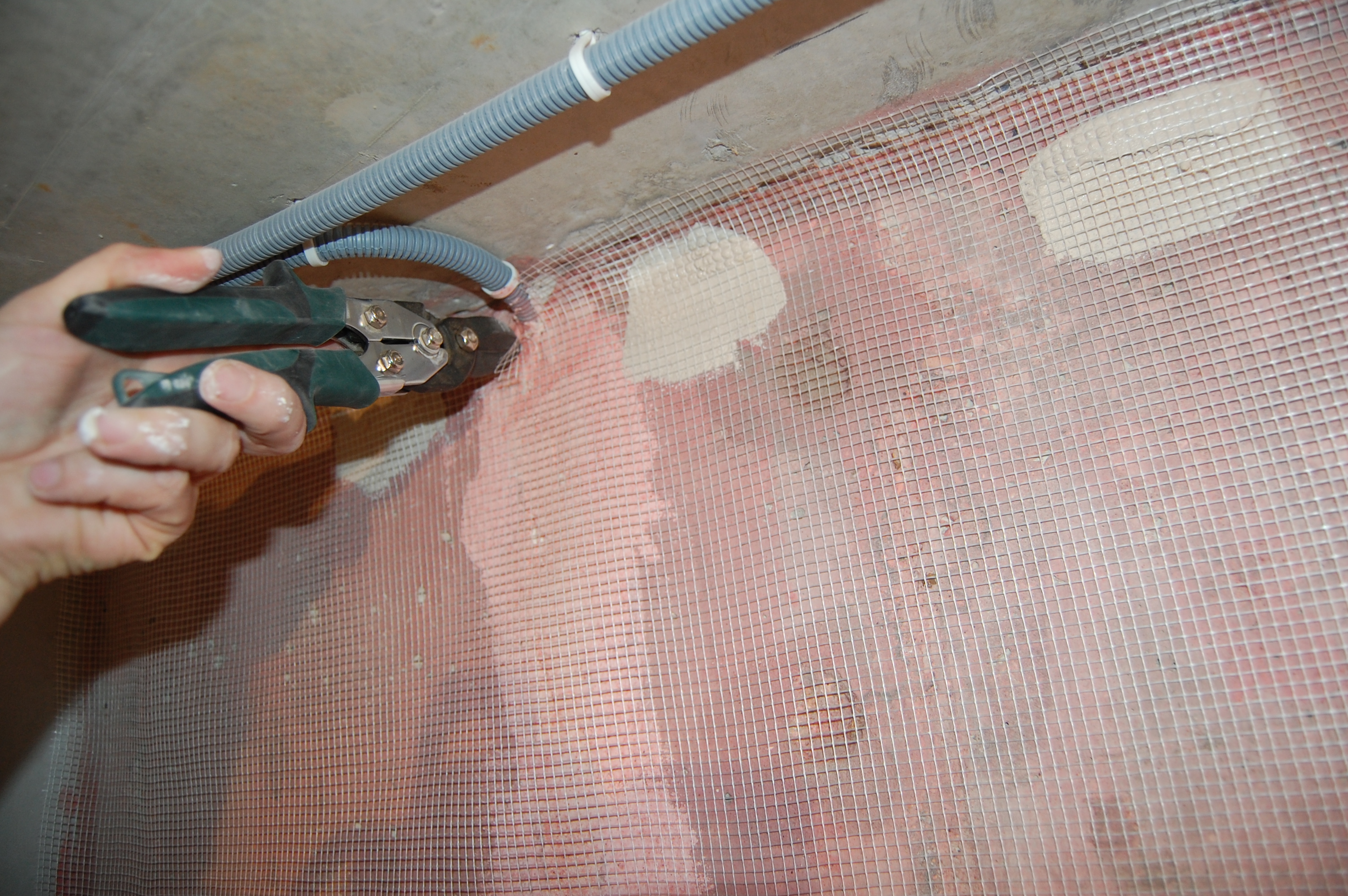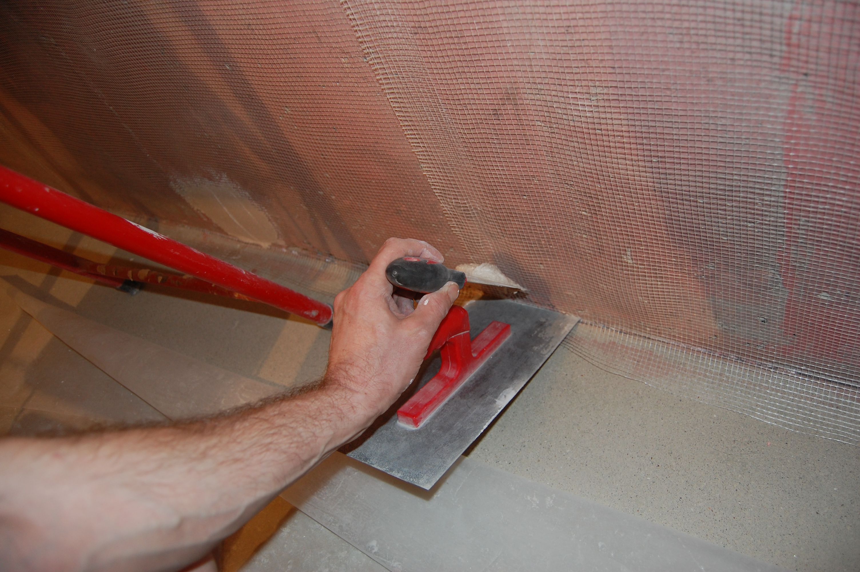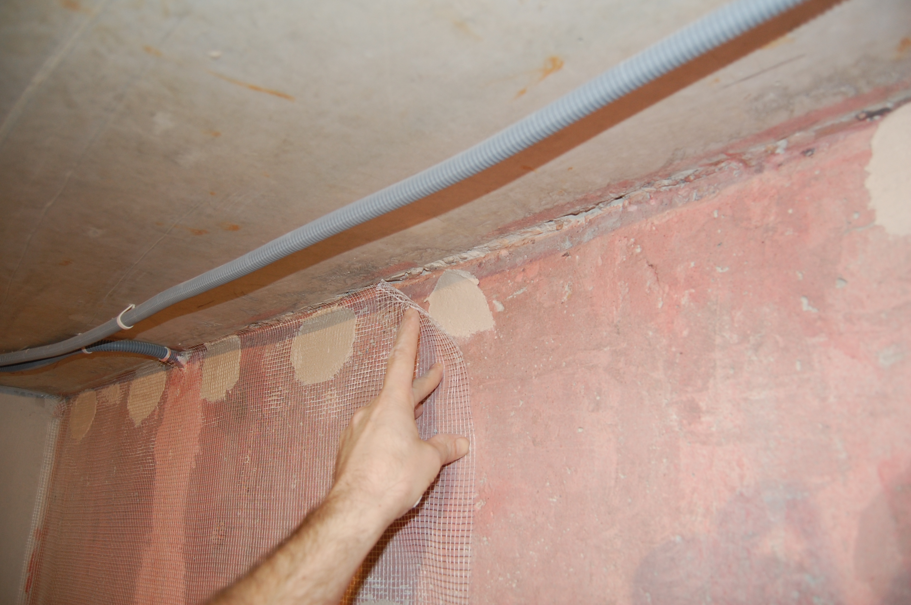 Действительно есть такой способ армирования штукатурки: Если слой штукатурки достаточно толстый, можно нанести первый слой. Полностью просушить его. Приклеить к нему армирующую сетку. Накрыть вторым слоем. Всё дело тут в том, что штукатурные слои между собой сцепляются гораздо крепче, чем штукатурка с основанием. Способ не столько трудоёмкий сколько растянут во времени. Поэтому используется только в случае крайней необходимости. Прямо по ширине рулона на стене ставится метка. Особой точности не требуется. Разводится небольшое кол-во штукатурки Небольшими порциями наносится на стену побольше на верх и реденько по всей остальной полосе полотна не пришлёпывая Вплотную к стенке ставится стремянка на неё кладётся полотно Ножки стремянки, ставятся на сетку, чтобы полотно растянуть ровно, параллельно, без провисов, перекособочиваний Вверх сетка натягивается и примеряется по месту Если что-то мешает плотному прилеганию сетки, то на ней просто делается надрез ( не надо ничего фигурного вырезать! ) Чтобы сетка не стягивалась при примазывании раствором, край сетки шпателем/гладилкой/кельмой прижимается в угол между потолком и стеной Другой шпатель/гладилка/кельма прижимается ниже к шпателю/гладилке/кельме и практически параллельно стене И плотно прижимаясь к стене стягивается вниз |