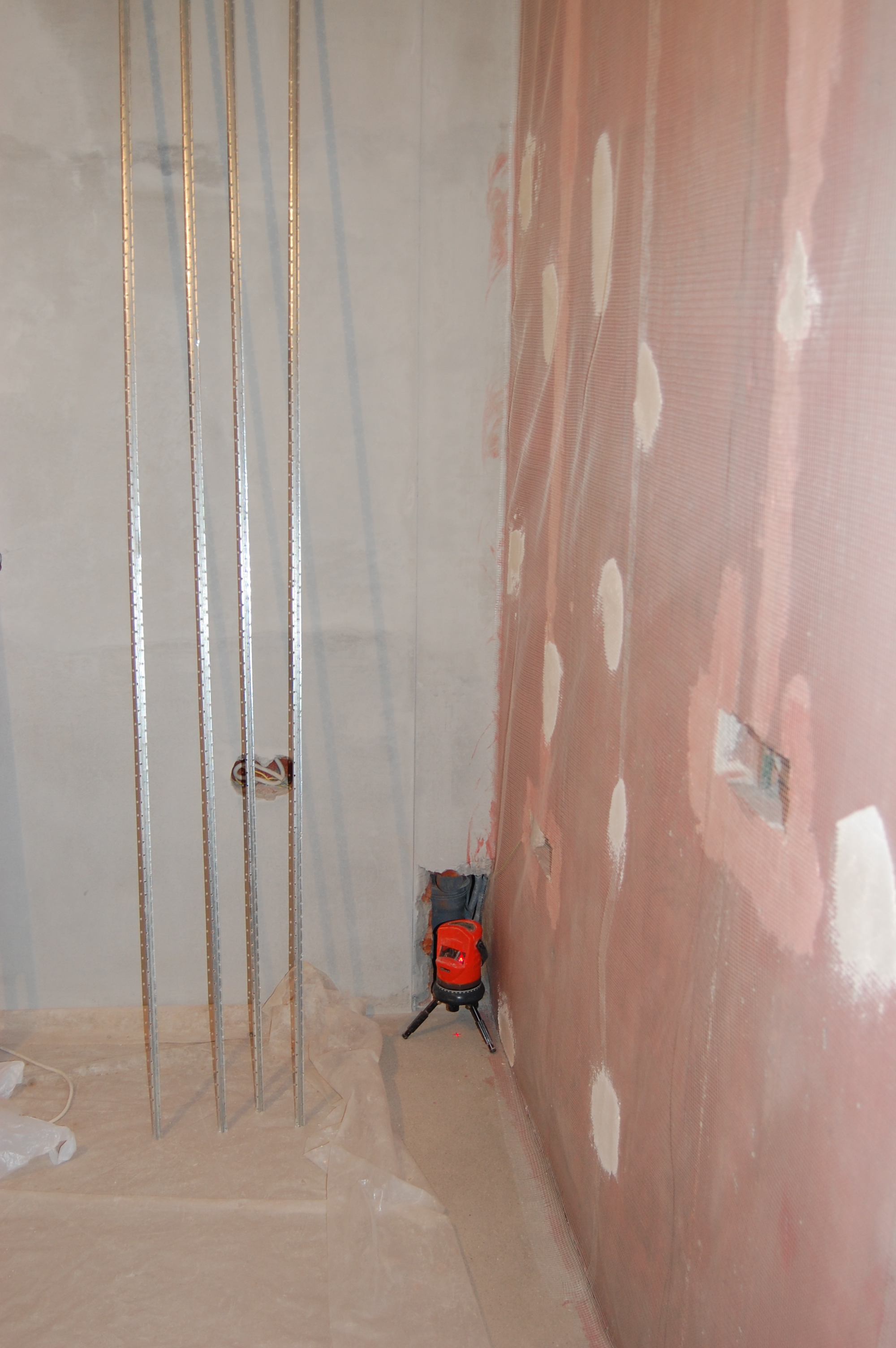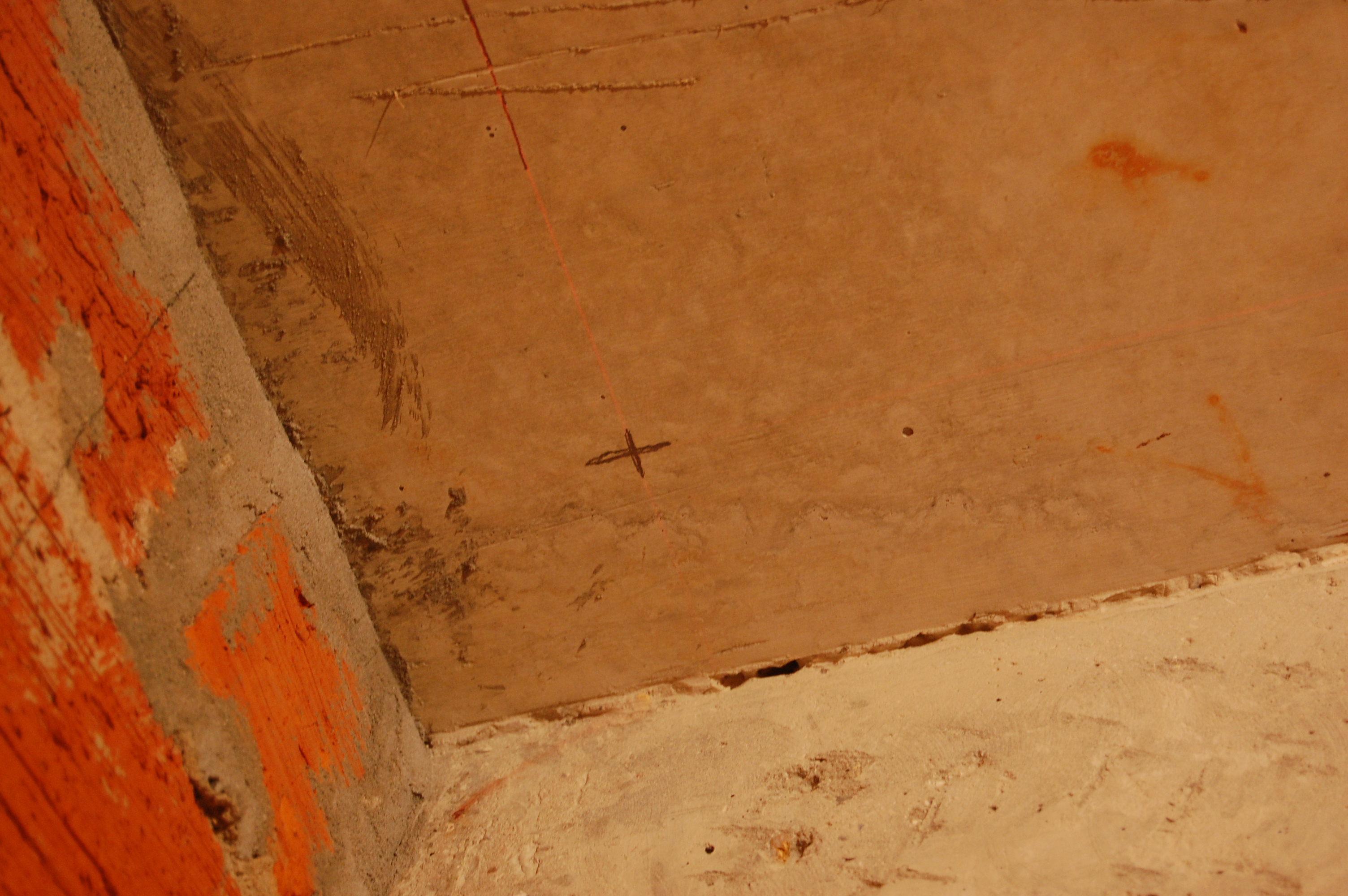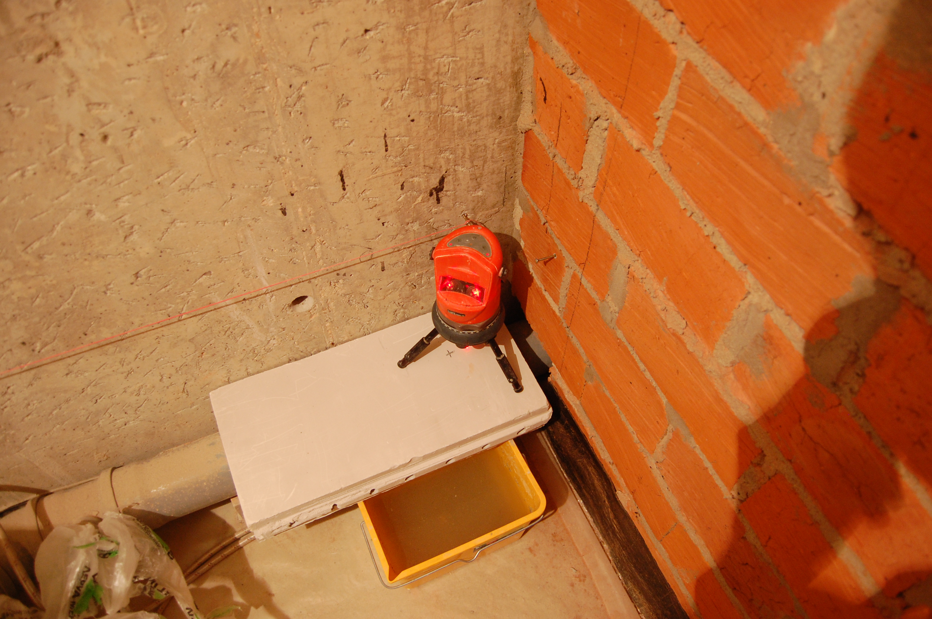 Вот промеряя такой маркой кривизну стены между её поверхностью и лучом лазера, находим самое выступающее, у меня это к сожалению не зафиксировано, но "ноль" марки установлен именно по такой точке, и заглубление остальной стены Вот ещё глубже Для чего всё это нужно? Чтобы не наносить штукатурку слишком толстым слоем, дело и в удобстве работы и в экономии материала, слой штукатурки можно вывести с выпуклостью под ноль ( под свою ответственность (IMG:style_emoticons/default/wink.gif) ), но лучше всё-таки под минимально указанную толщину слоя завода-изготовителя данной штукатурки. Обычно 5 мм. Дело в том, что при уменьшении данной толщины, происходит неправильное отверждение слоя и приклеивание его к поверхности, в связи с преждевременным обезвоживанием смеси. Ну и зернистость смеси влияет на прочность слоя. В результате в общем-то идёт отступление от правил установки маяков, т.к. здесь маяк устанавливается не там где положено, а в то место, которое по своей глубине позволяет это сделать. Оно не обязательно должно быть самым глубоким. Вот здесь видно, что расстояние между опорной площадкой марки и стеной позволяет установить маяк. Когда помещение совсем кривое иногда приходится елозить лазером в поиске оптимальной поверхности штукатурки и с другими соображениями, а не так, чтобы сэкономить. Когда лазеру наконец найдено подходящее место, то так как он у меня не плоский, по которому можно сразу "под шпатель" установить маяки, а обычный круглый отстоящий от стены на приличное расстояние, сразу отмечаем его положение в пространстве Точка под ним Имейте ввиду, что в связи с шероховатостью поверхности, на которой установлен лазер, крестик под ним я рисую не как обычно перечёркиванием, а опуская жало карандаша в точку лазера и от неё, т.е. от центра крестика, к краям. Крестик будет неровный, зато точный (IMG:style_emoticons/default/cool.gif) Точка пересечения двух вертикалей в моём лазере над ним Несколько штрихов по потолку удаляясь от лазера Ну и на противоположной стене Вся эта разметка нужна, не только потому, что можно не успеть поставить все маяки по стене по каким либо причинам: неопытность, прервали срочным делом..., но и потому, что, опять повторяю, лазер отстоит от стены, за один раз "просвечивается" только две стены И чтобы уйти на третью стену под прямым углом, лазер надо будет установить у противоположной стены встречным курсом ( здесь вот не на панель перекрытия, а на искусственно созданную площадку, естественно предварительно выровненную в горизонт по уровню когда один из лучей устанавливается по нанесённым меткам на потолке, а второй уходит на ещё "неохваченную" стену Естественно вся разметка повторяется и по ней замыкаем уже прямоугольник на четвёртой стене. |