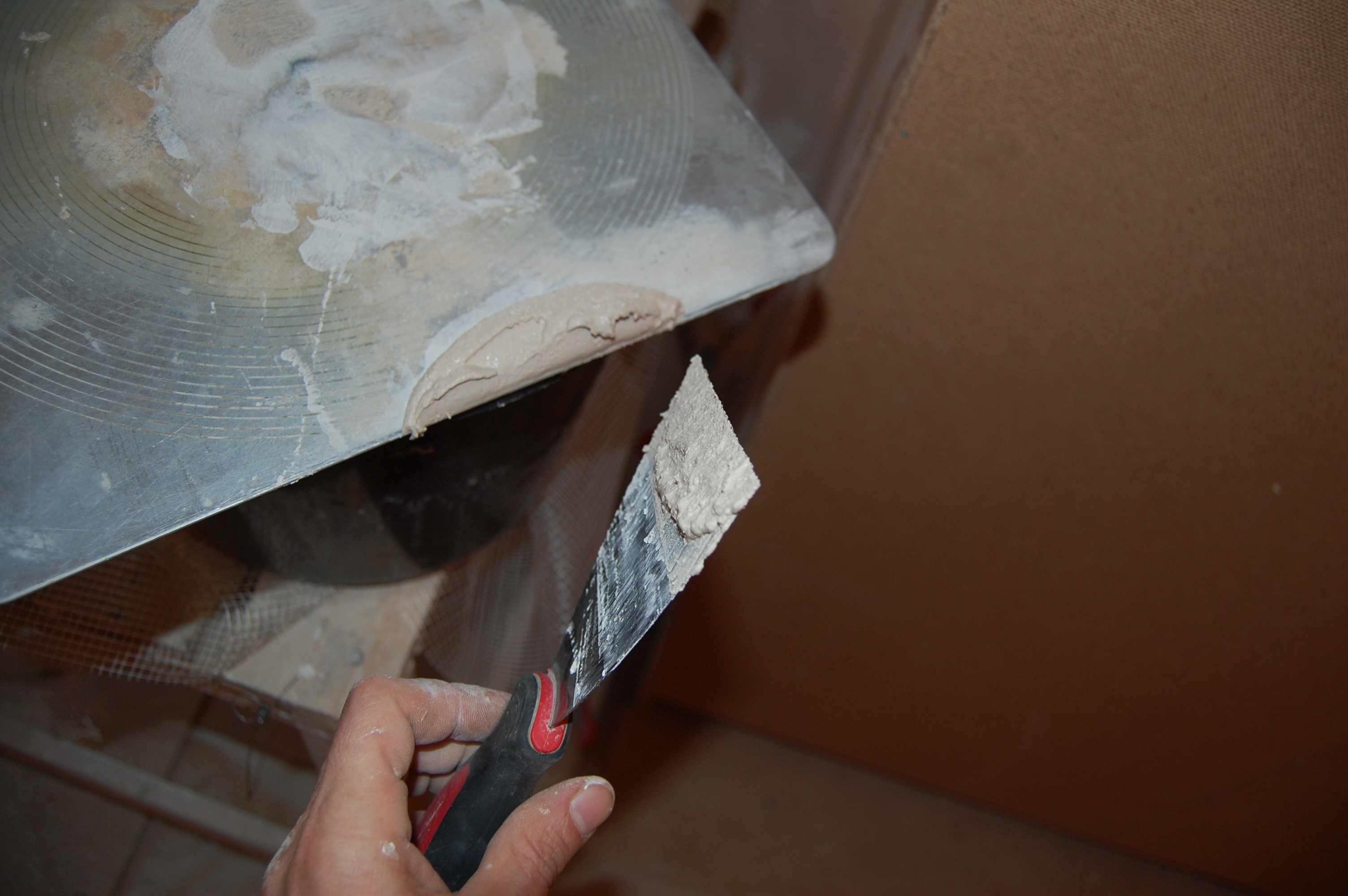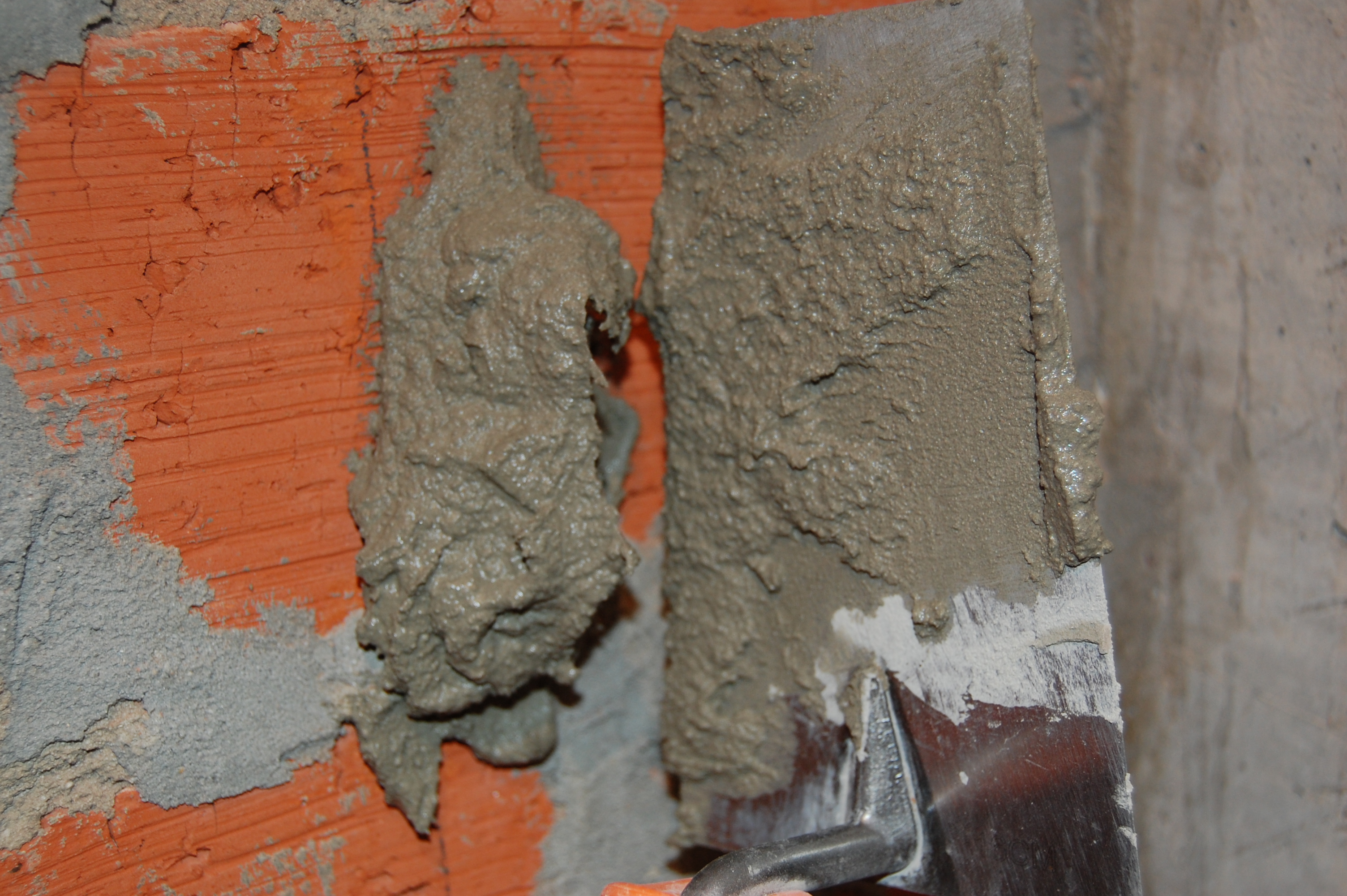 Для того, чтобы прикрепить маяк к стене на неё надо прилепить горку/шишку/кучку/... штукатурки. В обычных условиях при нанесении на стену штукатурку либо намазывают на стену, но тогда мы рельефного выступа не получим. Либо набрасывают достаточно увесистыми шлепками, но тогда штукатурка тоже плющится в лепёшку и опять не имеем выступа нужной высоты. Поэтому необходимо стряхнуть необходимый объём штукатурки на стену на намеченную для маяка линию очень аккуратно.