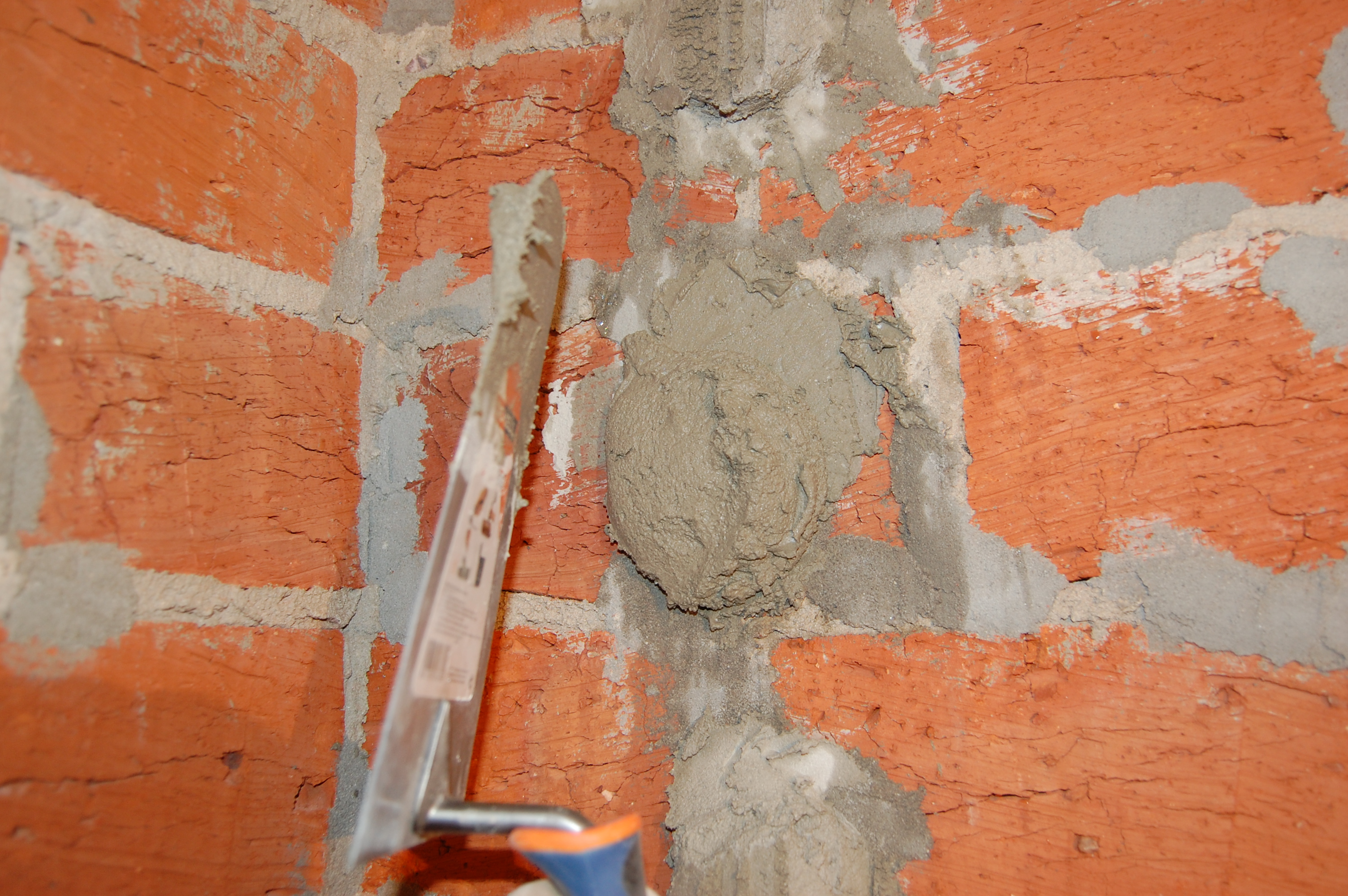 Продолжение Установка маяков Продолжим чуть-чуть. Различие на фотках в том, что на первой фотке раствор под маяк стряхнут кельмой прямо на кирпич, а на второй на специально подготовленную (IMG:style_emoticons/default/cool.gif) , по русски это звучит - намазанную (IMG:style_emoticons/default/laugh.gif) , площадку Почему я так начал делать? В процессе удаления маяков, ковыряния штукатурки под разные нужды, мной было замечено, что там где не удалось накинуть штукатурку со звуком "Чпок-Шлёп-Бум" на поверхность, а это происходит в тех местах где не развернуться/не замахнуться, или, например, в данной ситуации нельзя накинуть штукатурку сильно, ибо нужный нам для установки маяка холмик от сильного броска расплющится и превратится в лепёшку, так в этих местах штукатурка отслаивается от стены очень охотно. Современные штукатурки, в отличии от классической ЦПС, легко позволяют себя намазывать на стену. И вот когда на стене уже намазан слой штукатурки, то к нему сверху, мокрым по мокрому, штукатурка прилипает намного охотнее и гораздо прочнее, чем к голой стене. Что собственно и видно на тех фотках: Там где штукатурка накинута на голую стену она как-будто соединяется со стеной капиллярами, а на подготовленный кусочек ложится плотно. |