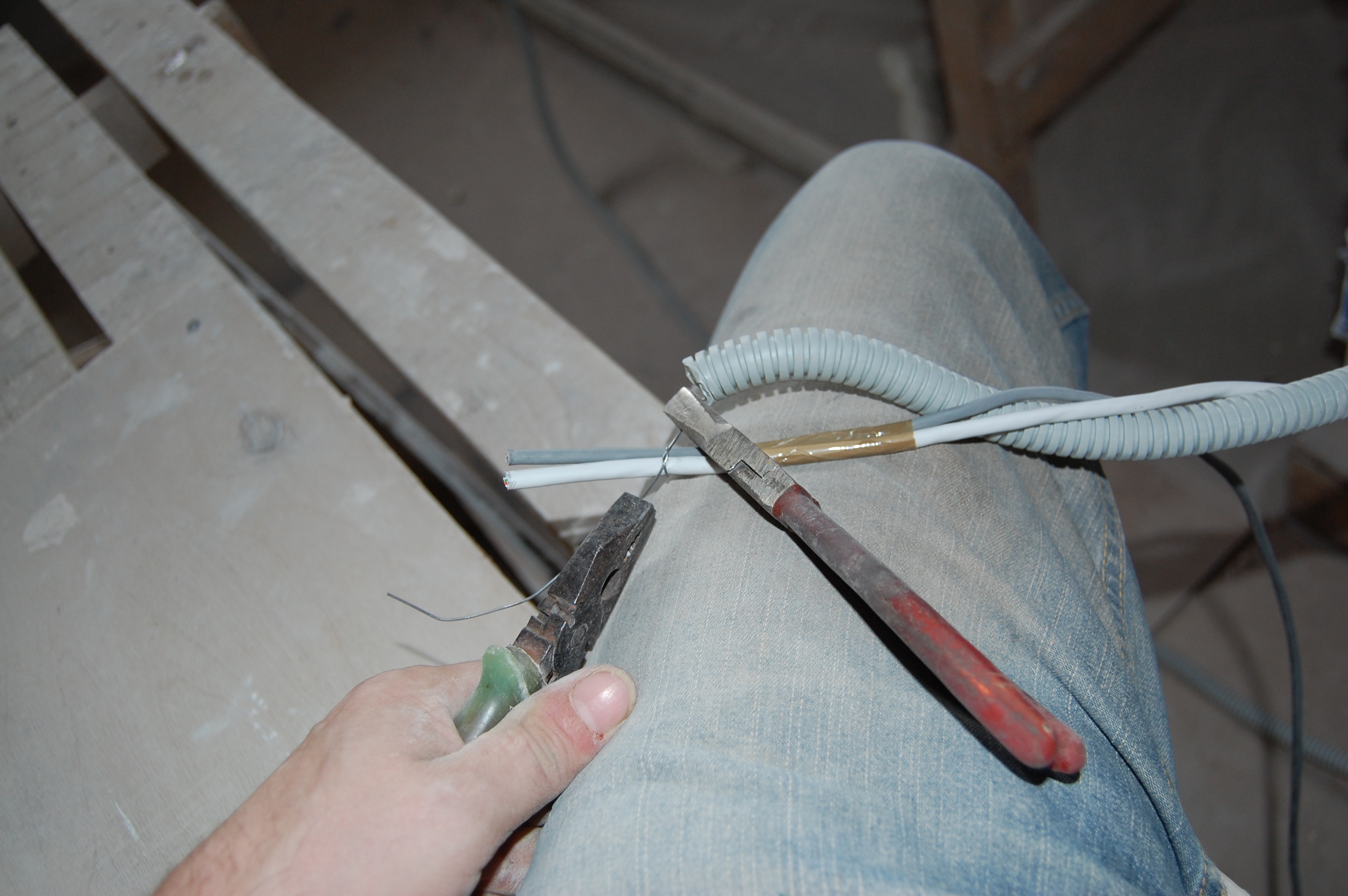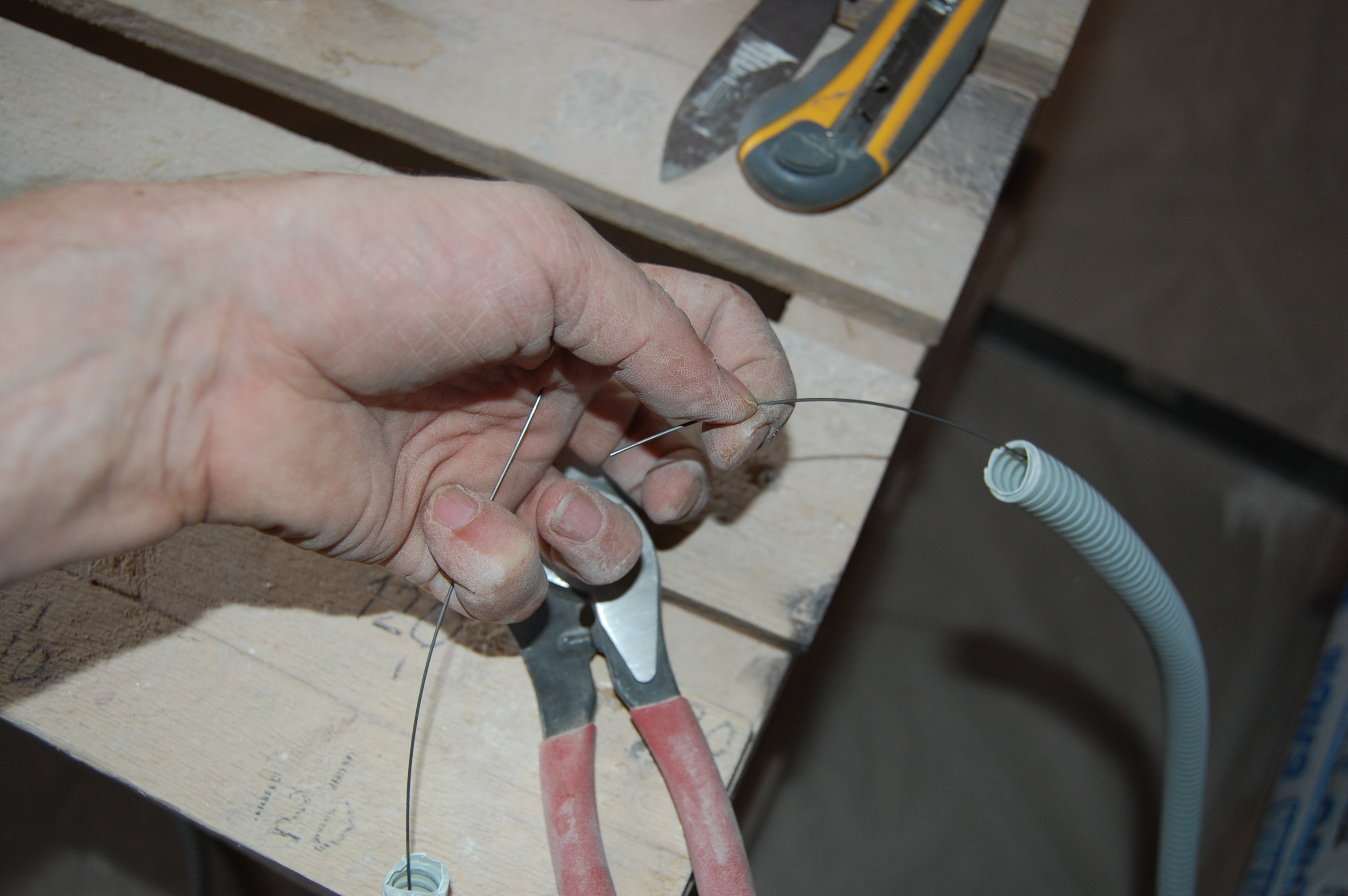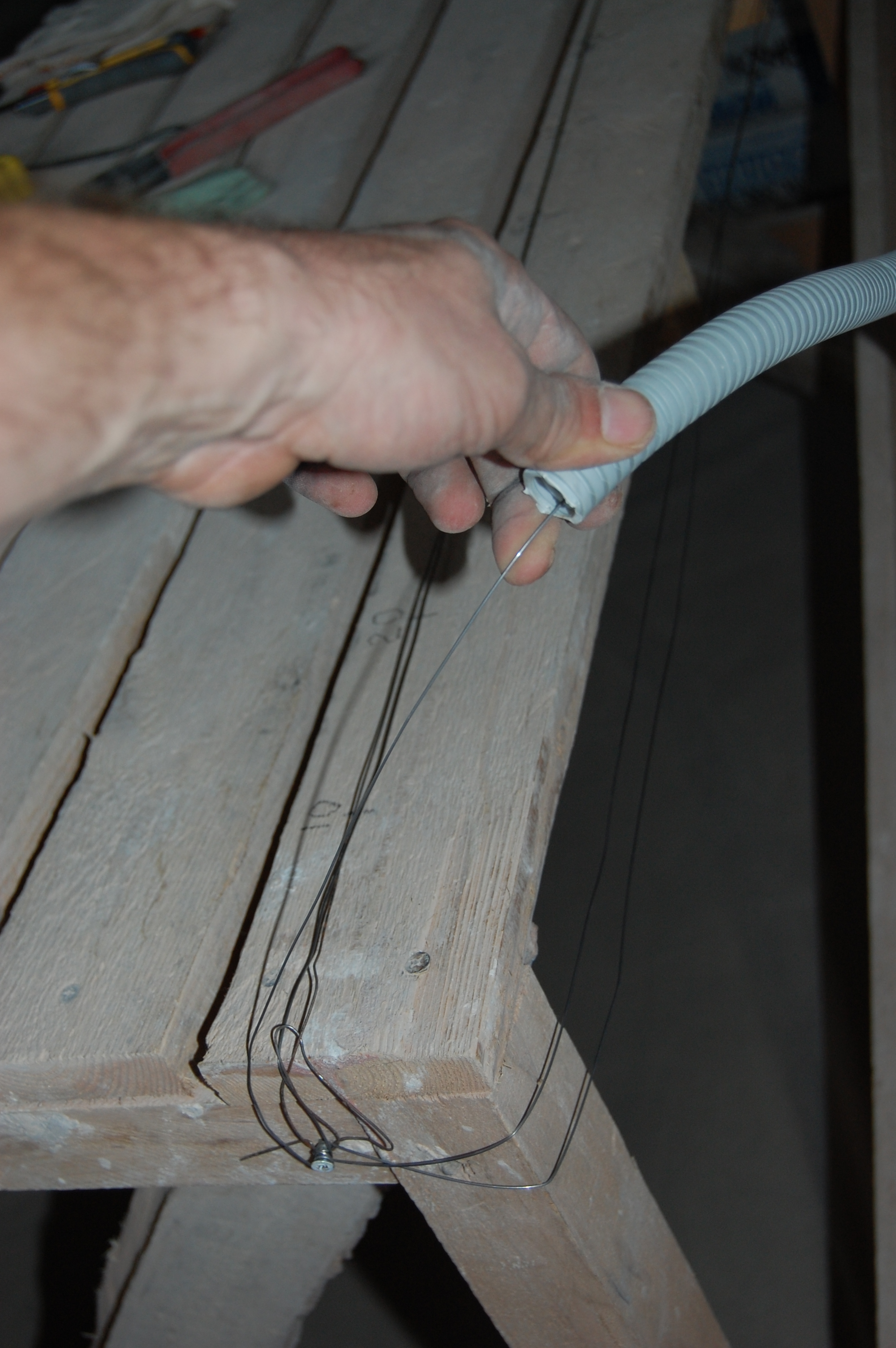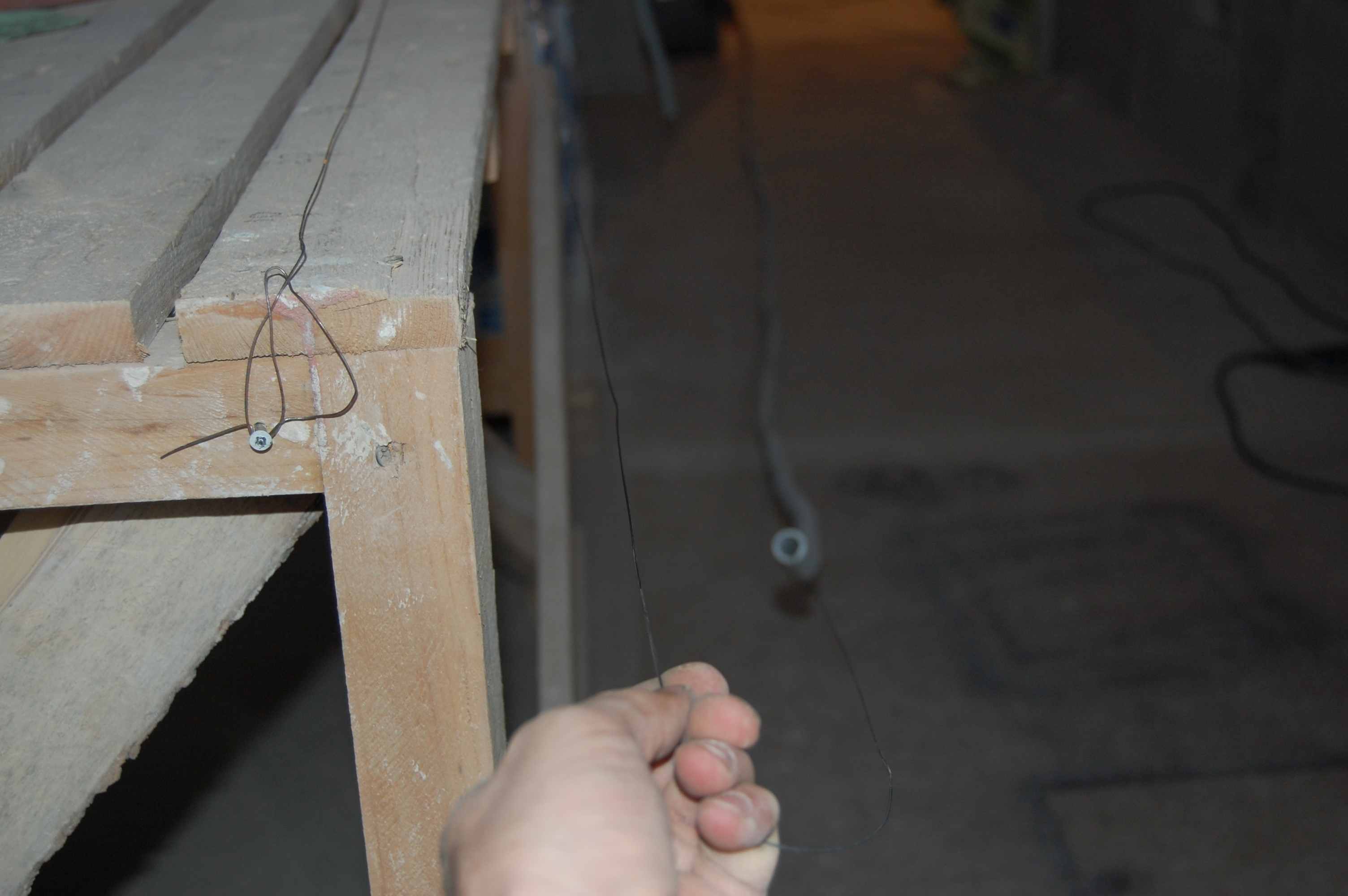 Если приходилось заталкивать кабеля длиннее, то сделал на шуруп в мерном (IMG:style_emoticons/default/biggrin.gif) козле из той же струны для протяжки колечко. Так чтобы оно приходилось прямо по пазу между досками