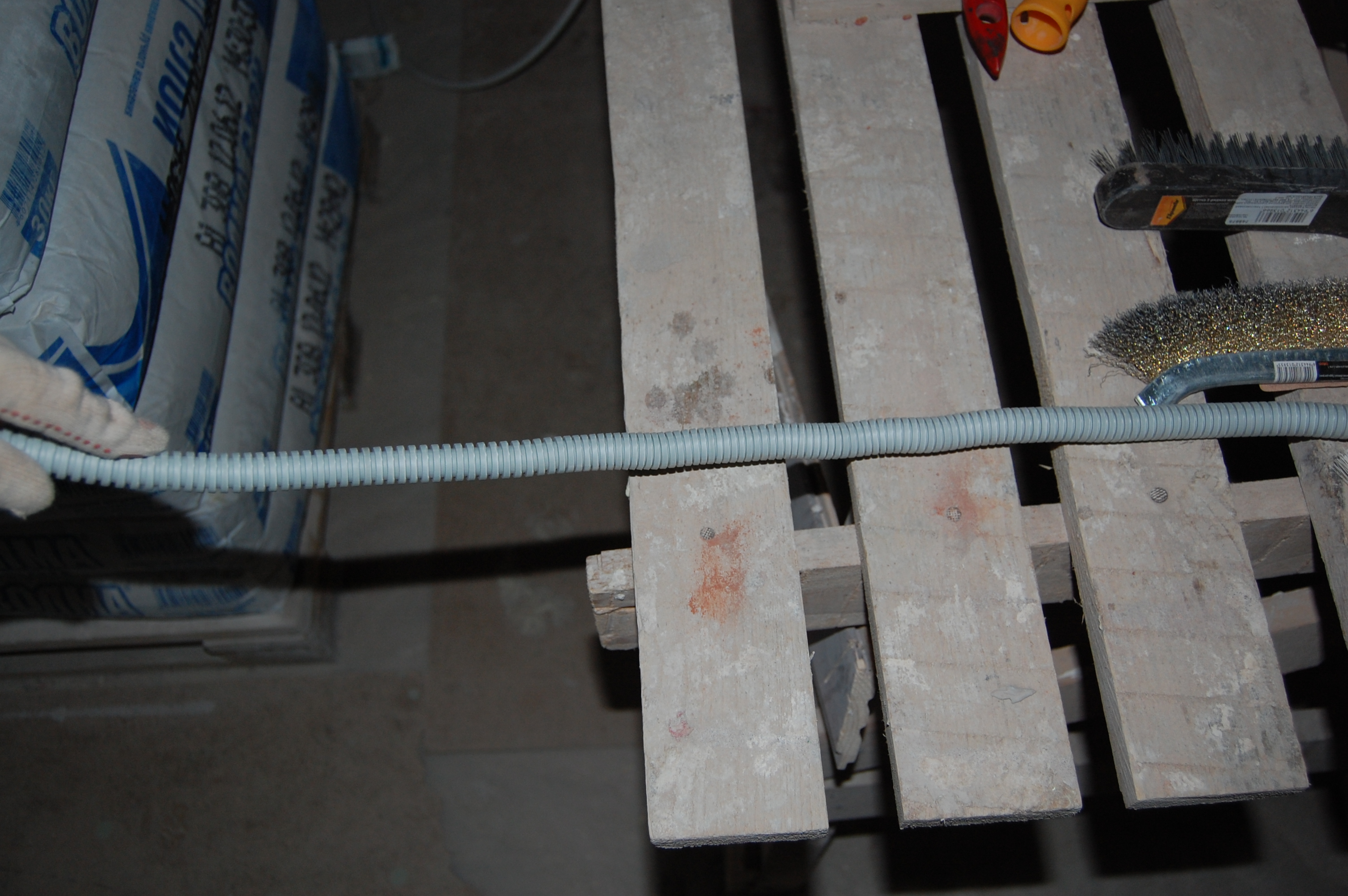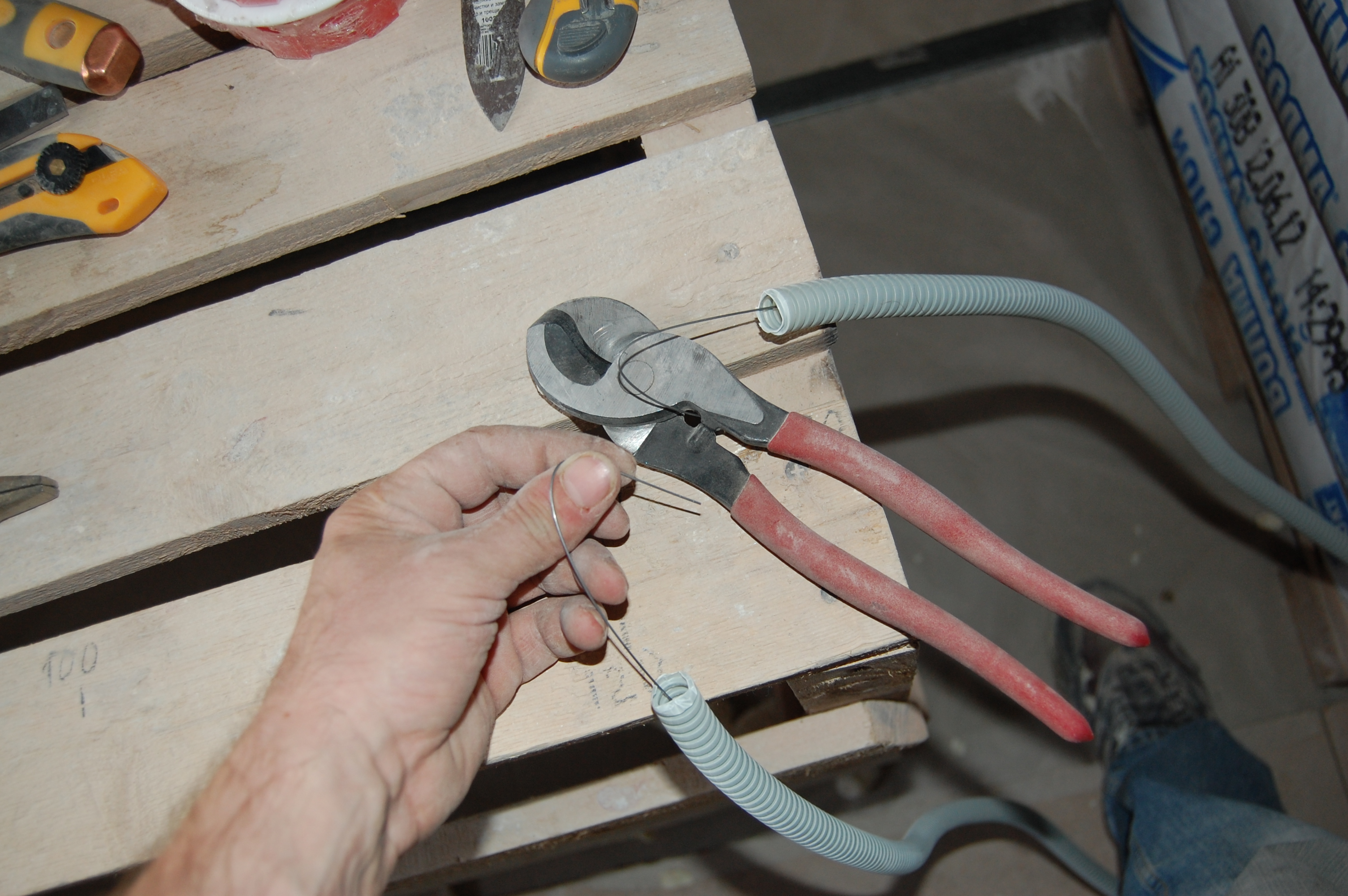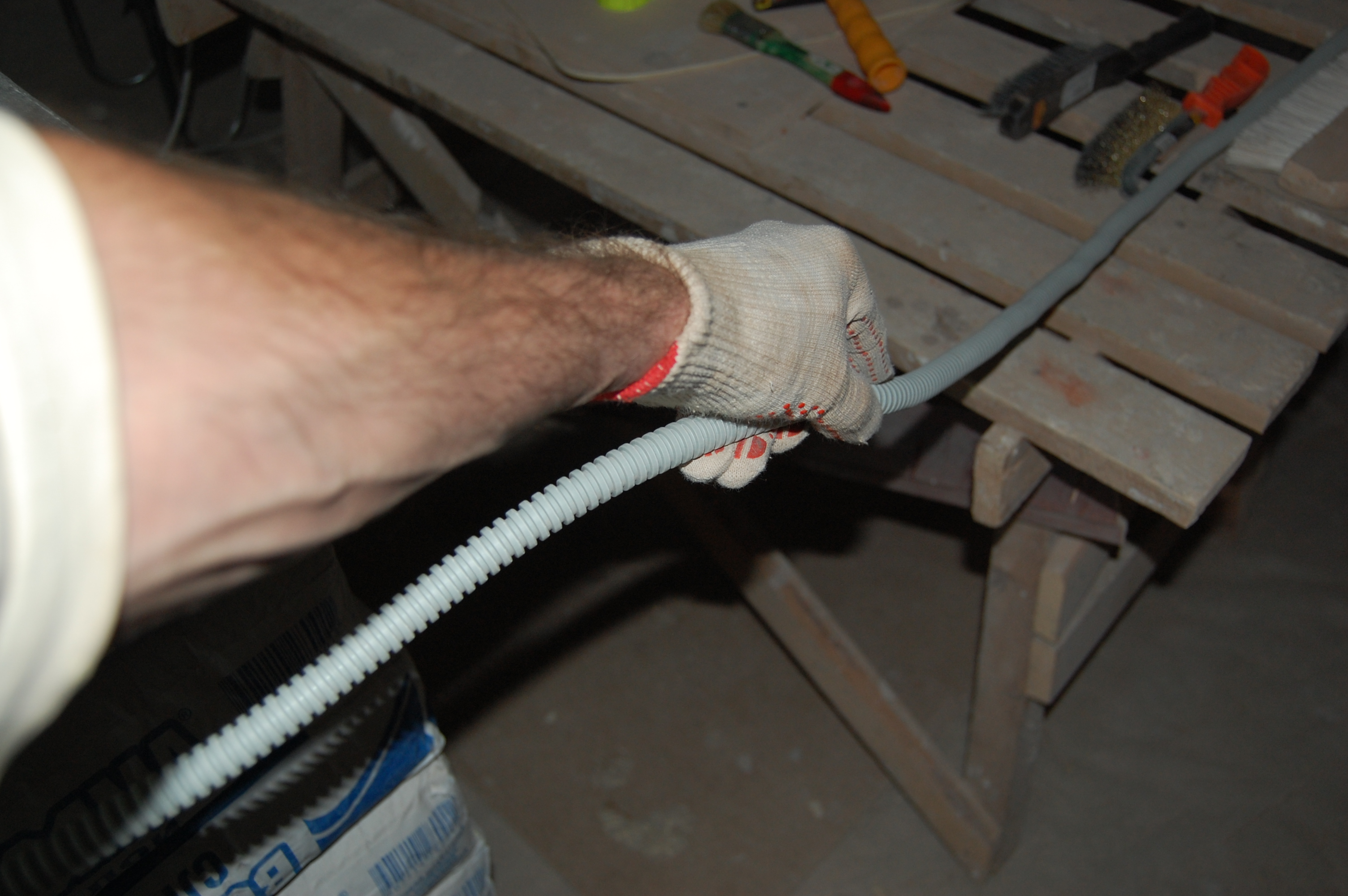 Итак Упаковка кабеля/кабелей в гофру. До начала этого процесса, я был наивно уверен, что раз в гофре присутствует протяжка ( проволока ), то кабель привязывается к её концу и затягивается в гофру. На практике оказалось всё совсем наоборот, т.е кабель-то всё-таки крепится к проволоке, но вот только гофра натягивается на кабель. (IMG:http://s16.rimg.info/0b80d7fd075465f17e877ac0d9af0e54.gif) Собственно вот что понадобилось для прокладки внутриквартирных сетей Больной вопрос как отмерить в квартире на ограниченном пространстве нужное кол-во метров кабеля или гофры я решил не рулеткой или метром и с выездом на природу, как рекомендуют "спецы" на некоторых форумах, а увиденным мной впервые способом в бутиках (IMG:style_emoticons/default/rofl.gif) ткани на Афганских базарах, т.е. попросту разметкой доски строительного помоста, в щели которого очень удобно для выпрямления укладывать толстый кабель, на 100-мм отрезки Сверх необходимой длины от точки А до точки Б, я постепенно вышел на прибавку сверх промерянного расстояния от первоначальных экономных 20 см до 35-40, которые позволяли, имея по 17-20 см концу с каждой стороны, свободно ими манипулировать при разного типа соединениях, не тратя дополнительного времени на усилия вырастить третью руку чтобы удержать внатяг "разбегающиеся" провода. Провод на куски резал специально приобретённым кабелерезом, который делал это на "клац" и иногда использовался для удержания струны протяжки от ныряния в гофру Гофру я отмерял как раз по измеренному расстоянию, резал обыкновенным строительным ножом, а протяжку перекусывал тем же кабелерезом не забывая при этом не выпускать концы струн протяжки ни на секунду из рук и загибая их концы чтобы они не унырнули в гофру |