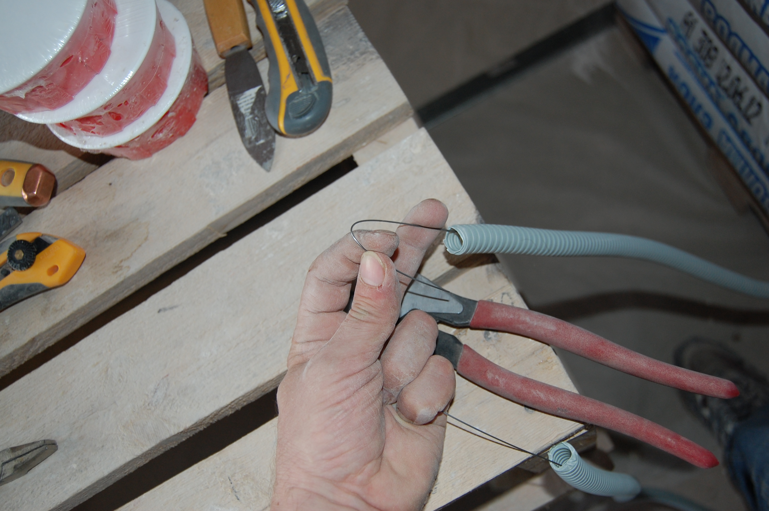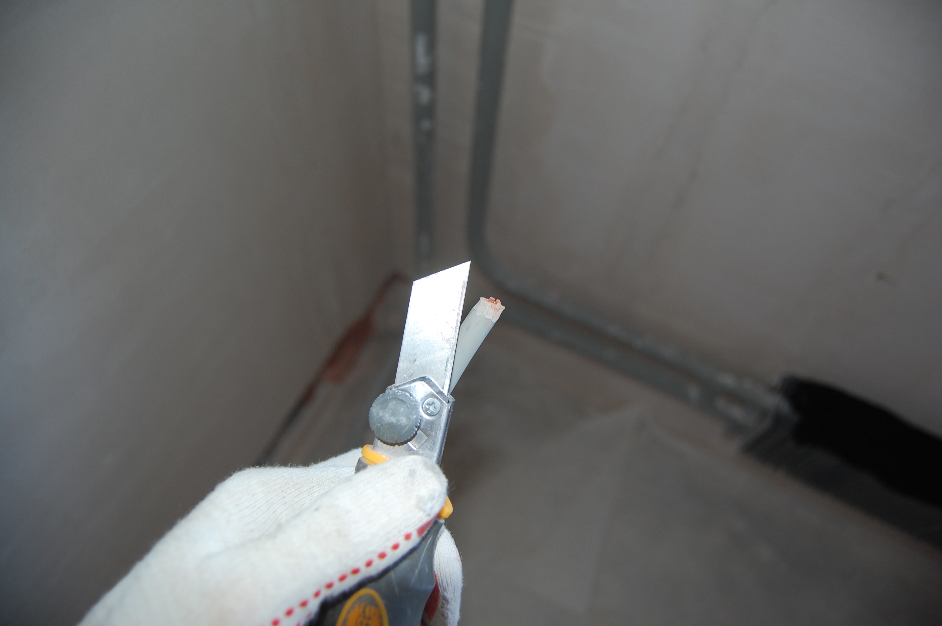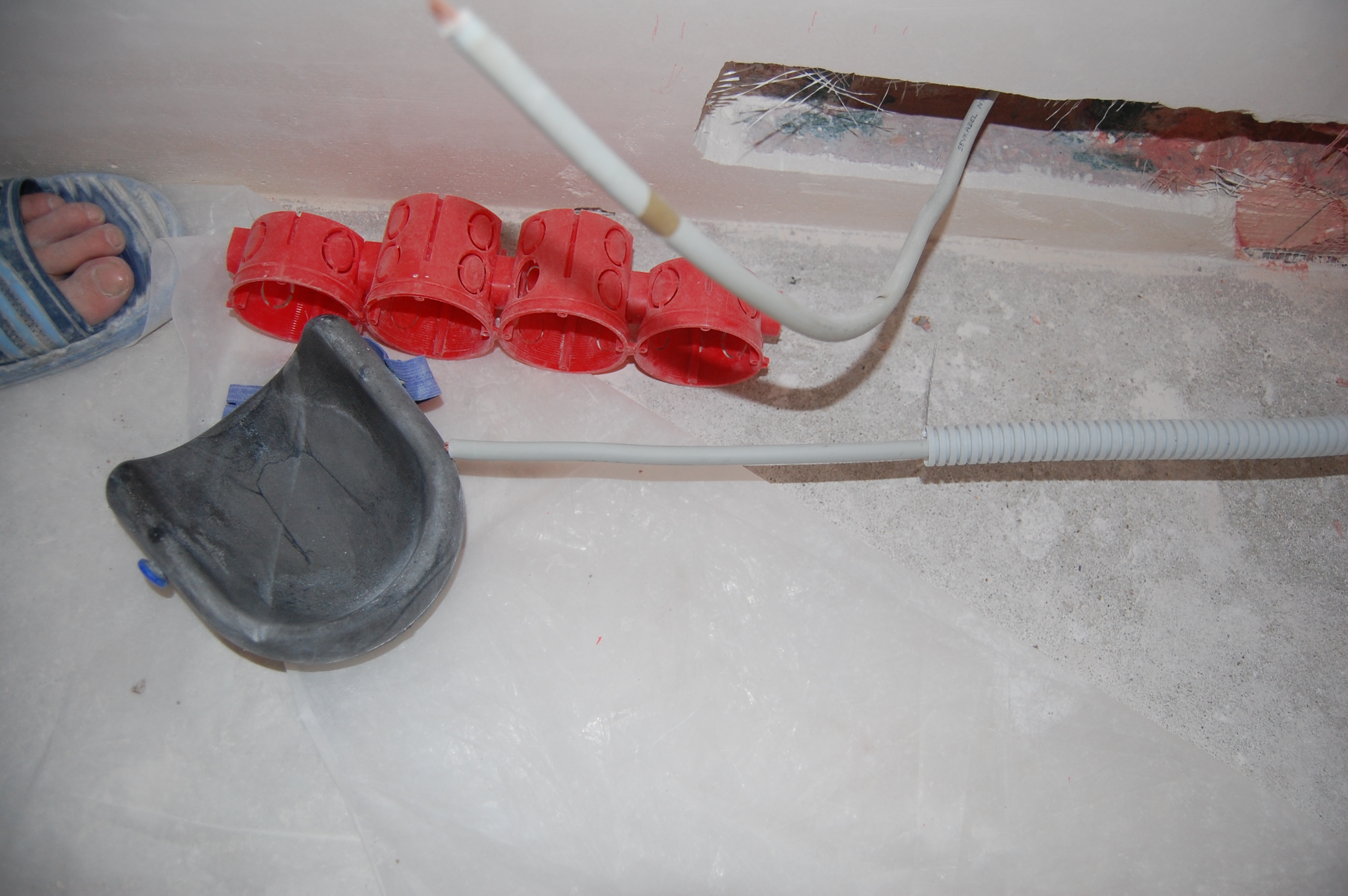 Итак Упаковка кабеля/кабелей в гофру. До начала этого процесса, я был наивно уверен, что раз в гофре присутствует протяжка ( проволока ), то кабель привязывается к её концу и затягивается в гофру. На практике оказалось всё совсем наоборот, т.е кабель-то всё-таки крепится к проволоке, но вот только гофра натягивается на кабель. (IMG:http://s16.rimg.info/0b80d7fd075465f17e877ac0d9af0e54.gif) Собственно вот что понадобилось для прокладки внутриквартирных сетей Больной вопрос как отмерить в квартире на ограниченном пространстве нужное кол-во метров кабеля или гофры я решил не рулеткой или метром и с выездом на природу, как рекомендуют "спецы" на некоторых форумах, а увиденным мной впервые способом в бутиках (IMG:style_emoticons/default/rofl.gif) ткани на Афганских базарах, т.е. попросту разметкой доски строительного помоста, в щели которого очень удобно для выпрямления укладывать толстый кабель, на 100-мм отрезки Сверх необходимой длины от точки А до точки Б, я постепенно вышел на прибавку сверх промерянного расстояния от первоначальных экономных 20 см до 35-40, которые позволяли, имея по 17-20 см концу с каждой стороны, свободно ими манипулировать при разного типа соединениях, не тратя дополнительного времени на усилия вырастить третью руку чтобы удержать внатяг "разбегающиеся" провода. Провод на куски резал специально приобретённым кабелерезом, который делал это на "клац" и иногда использовался для удержания струны протяжки от ныряния в гофру Гофру я отмерял как раз по измеренному расстоянию, резал обыкновенным строительным ножом, а протяжку перекусывал тем же кабелерезом не забывая при этом не выпускать концы струн протяжки ни на секунду из рук и загибая их концы чтобы они не унырнули в гофру |