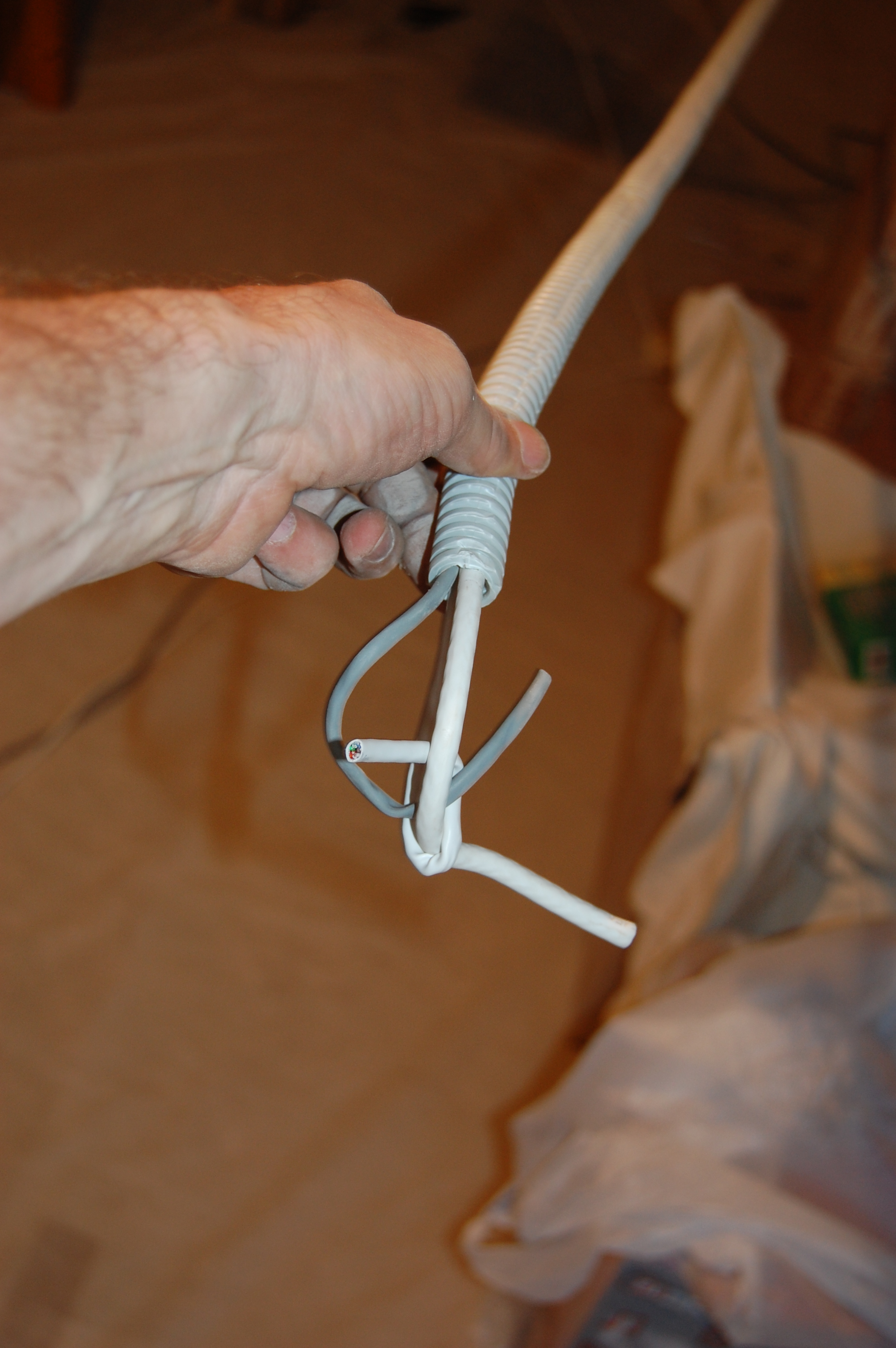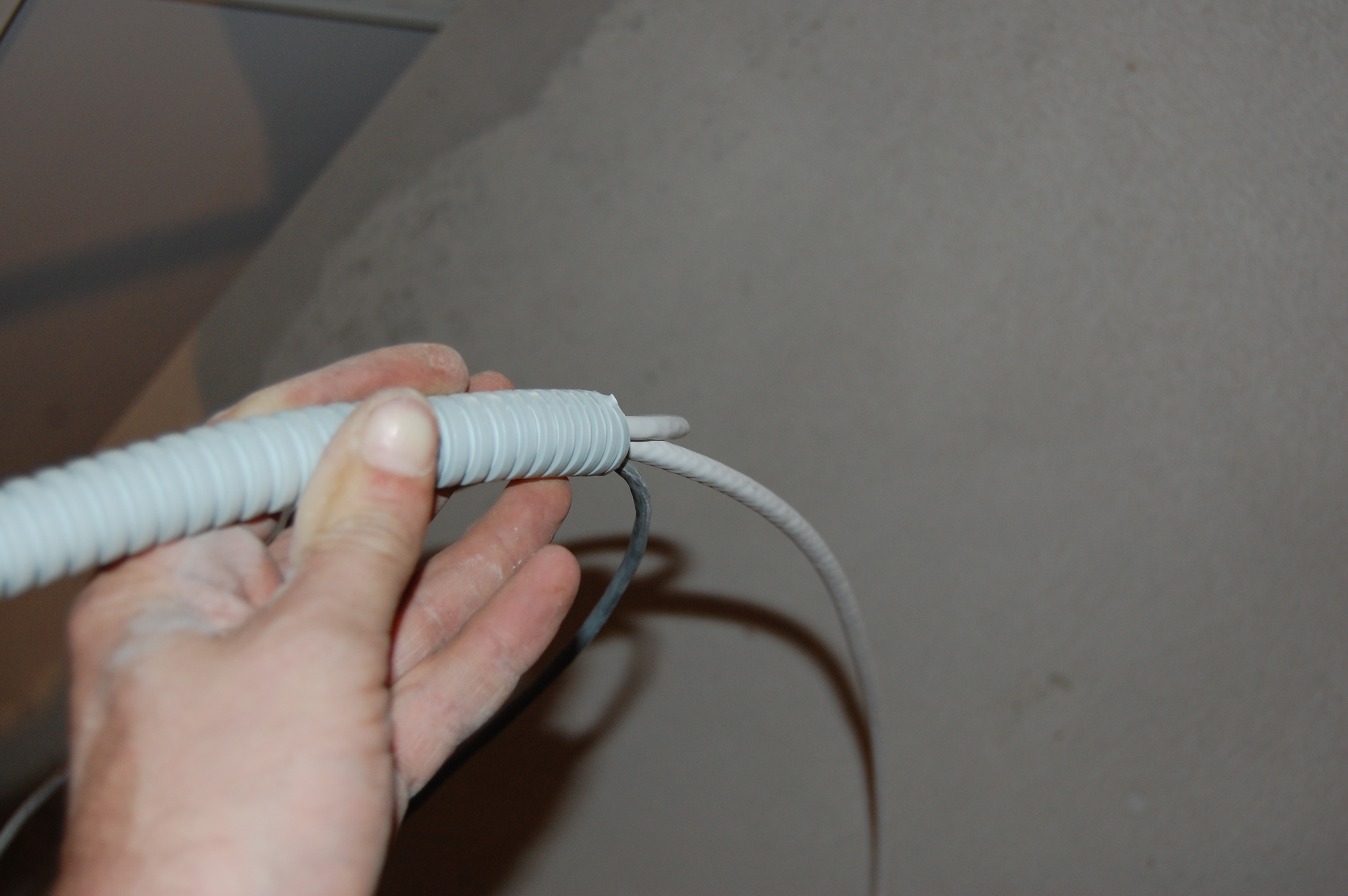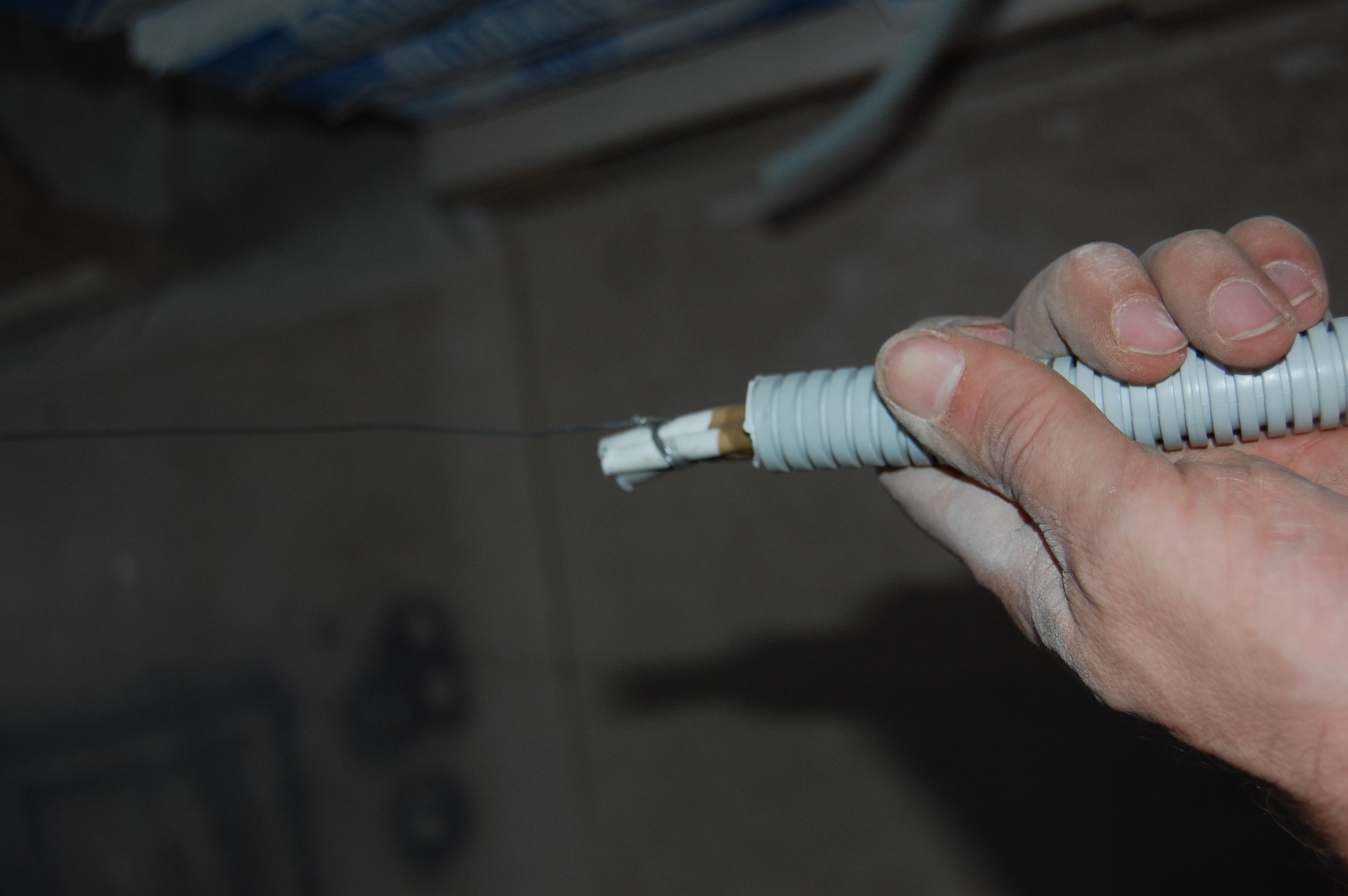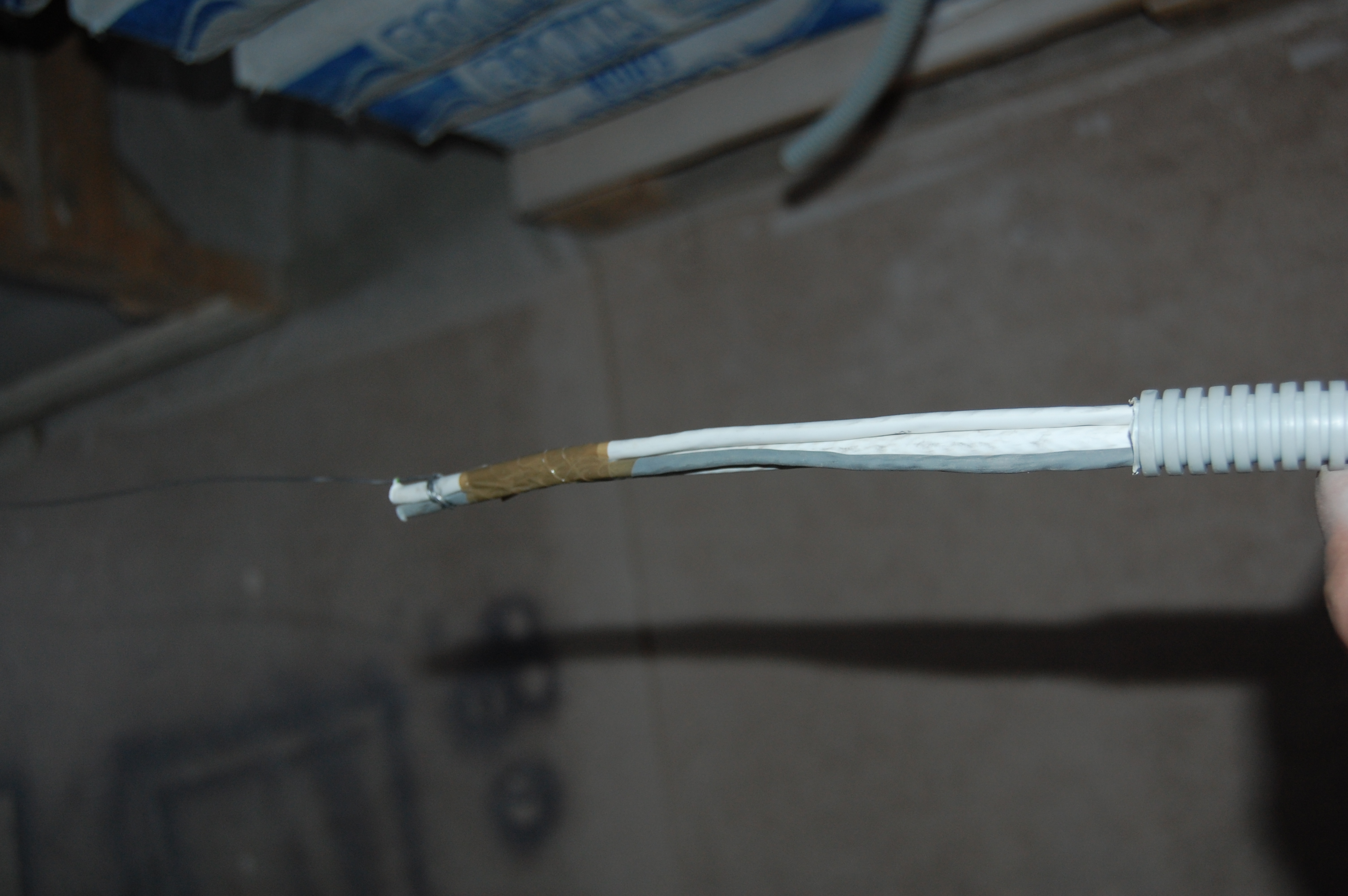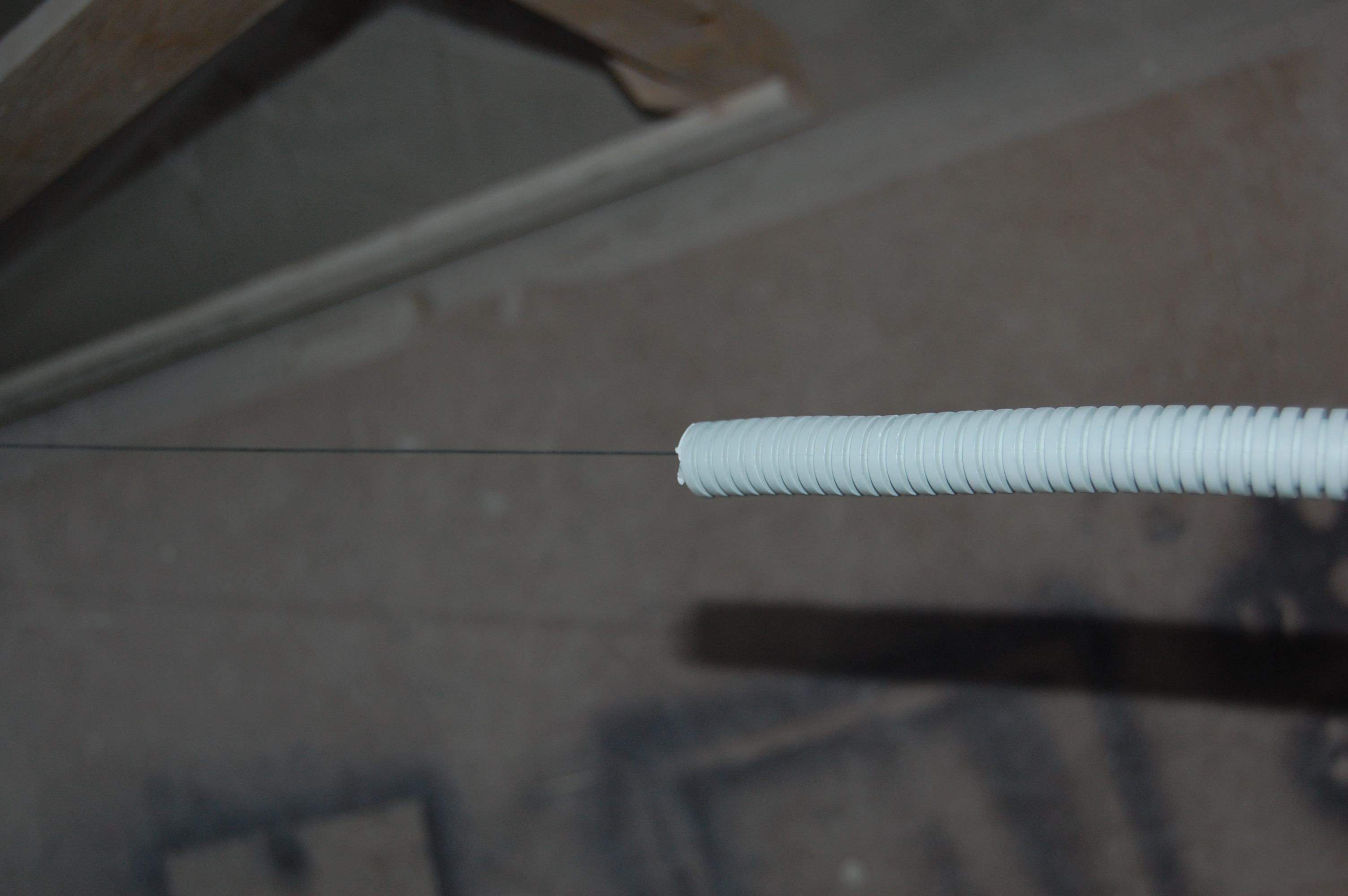 Попытки привязать его к струне оборачивались мёртвым заеданием в гофре. Поэтому поступил по другому. Просто заточил кабель наподобие карандаша Дальше вставил кабель в гофру, постаравшись как можно ровнее распрямить его И метра 2-2,5 он проталкивается без проблем В данном случае даже в гофру уже проложенную сквозь стену ( шёпотом: из кухни на лоджию ) |