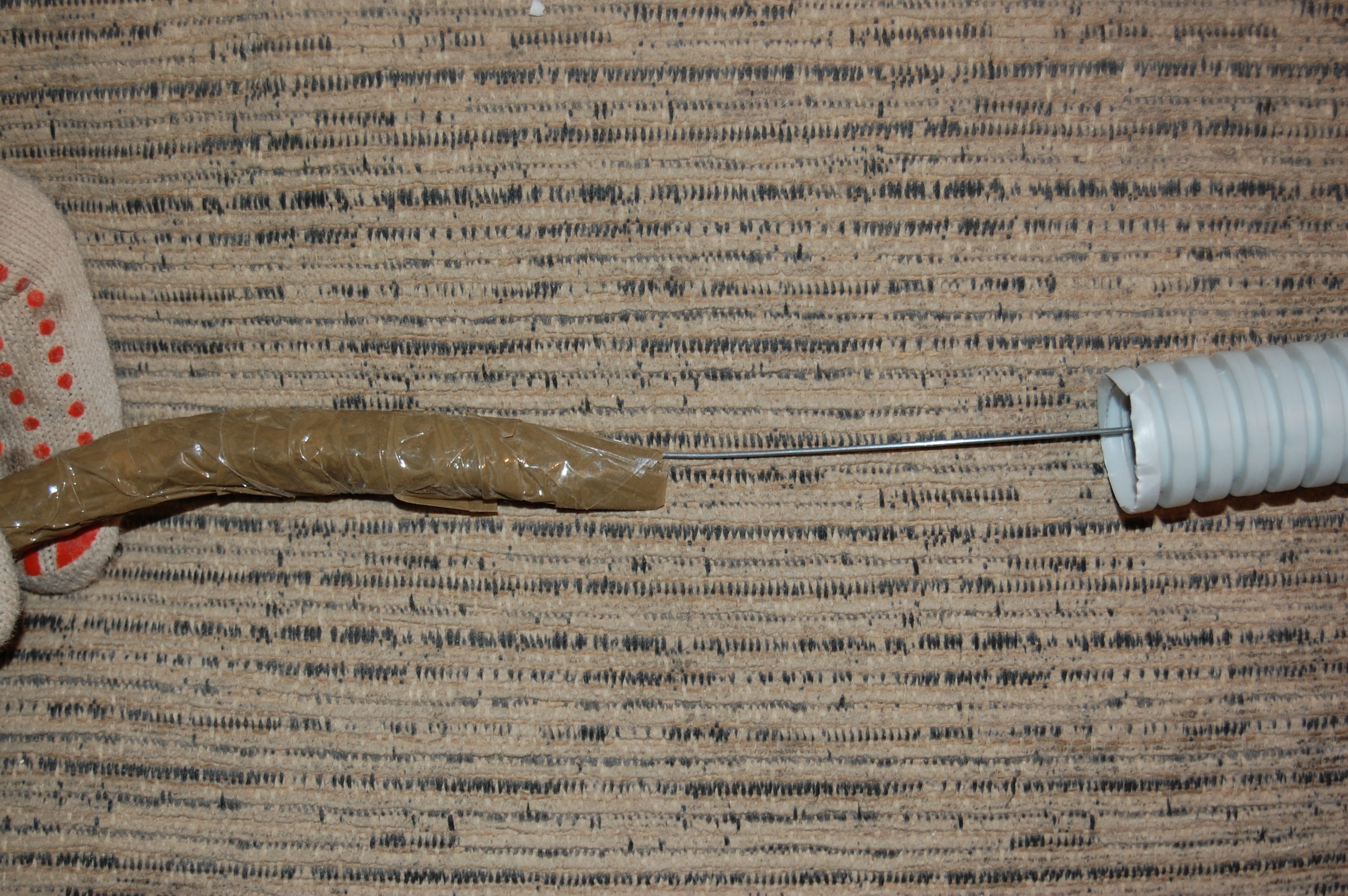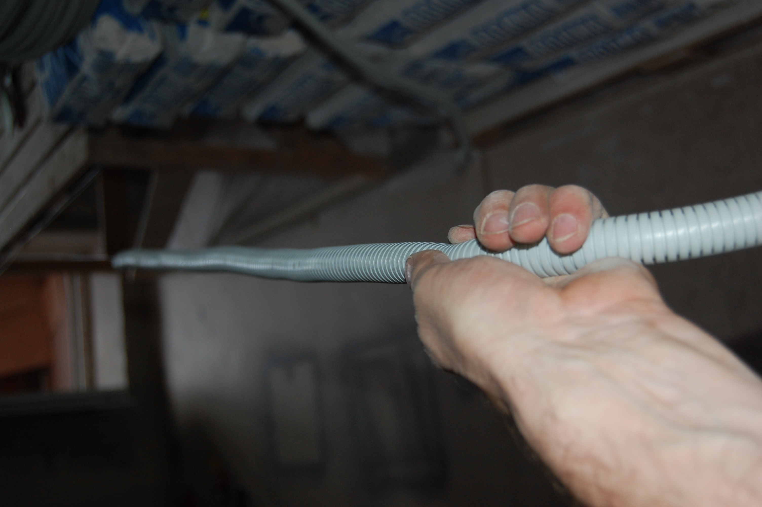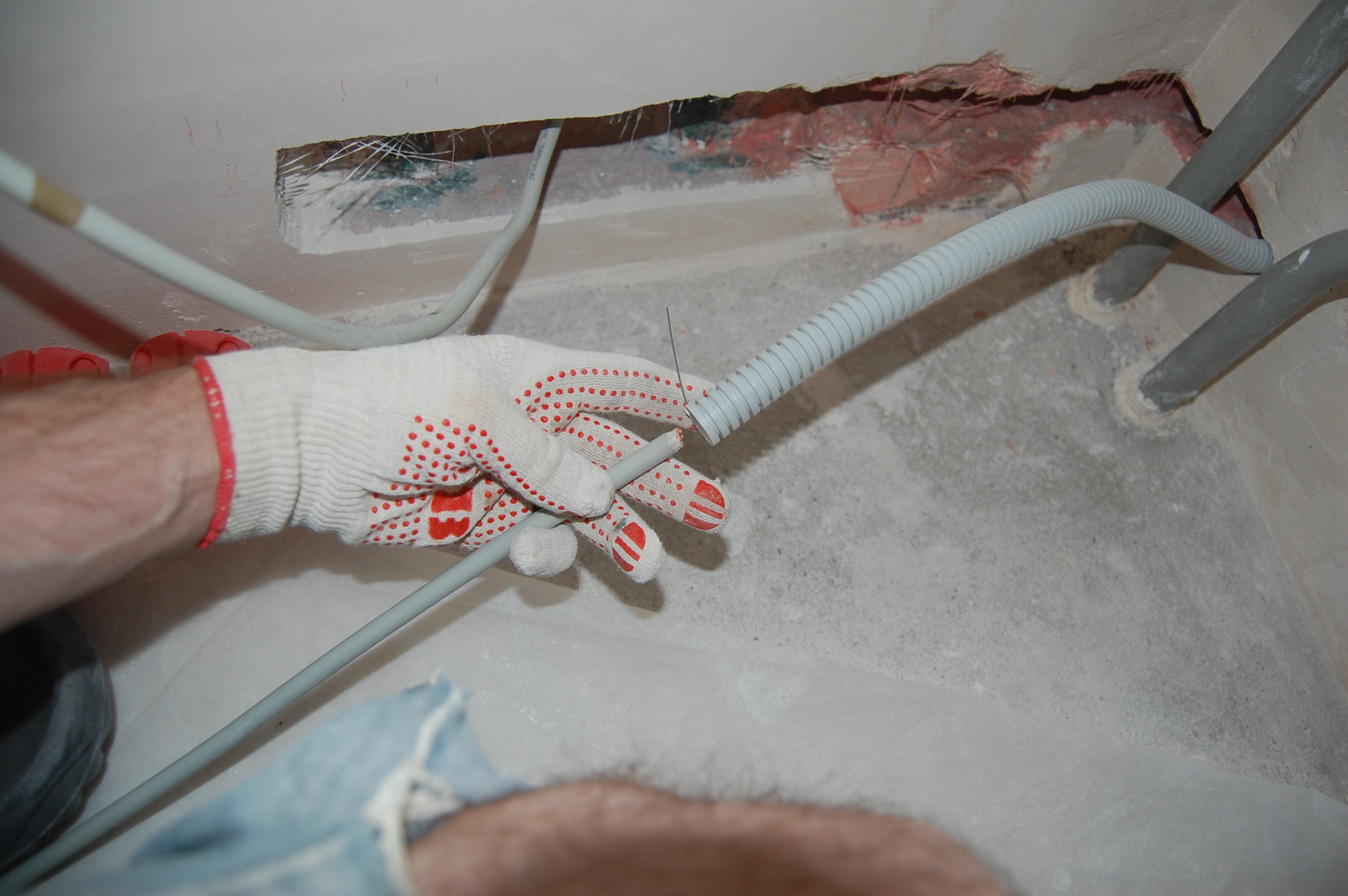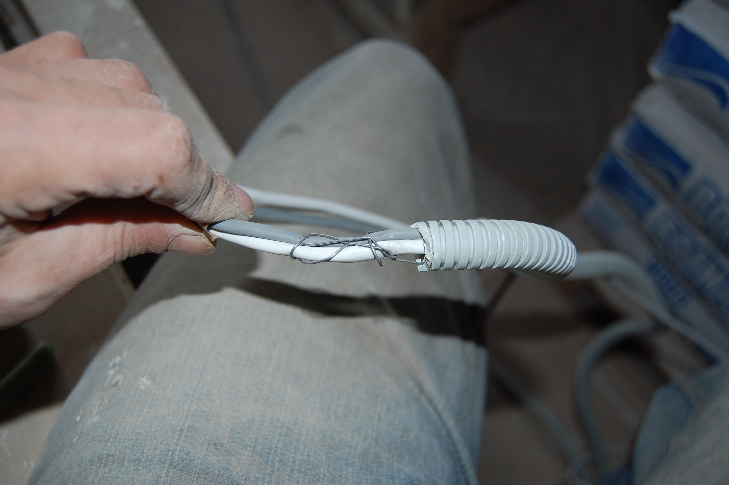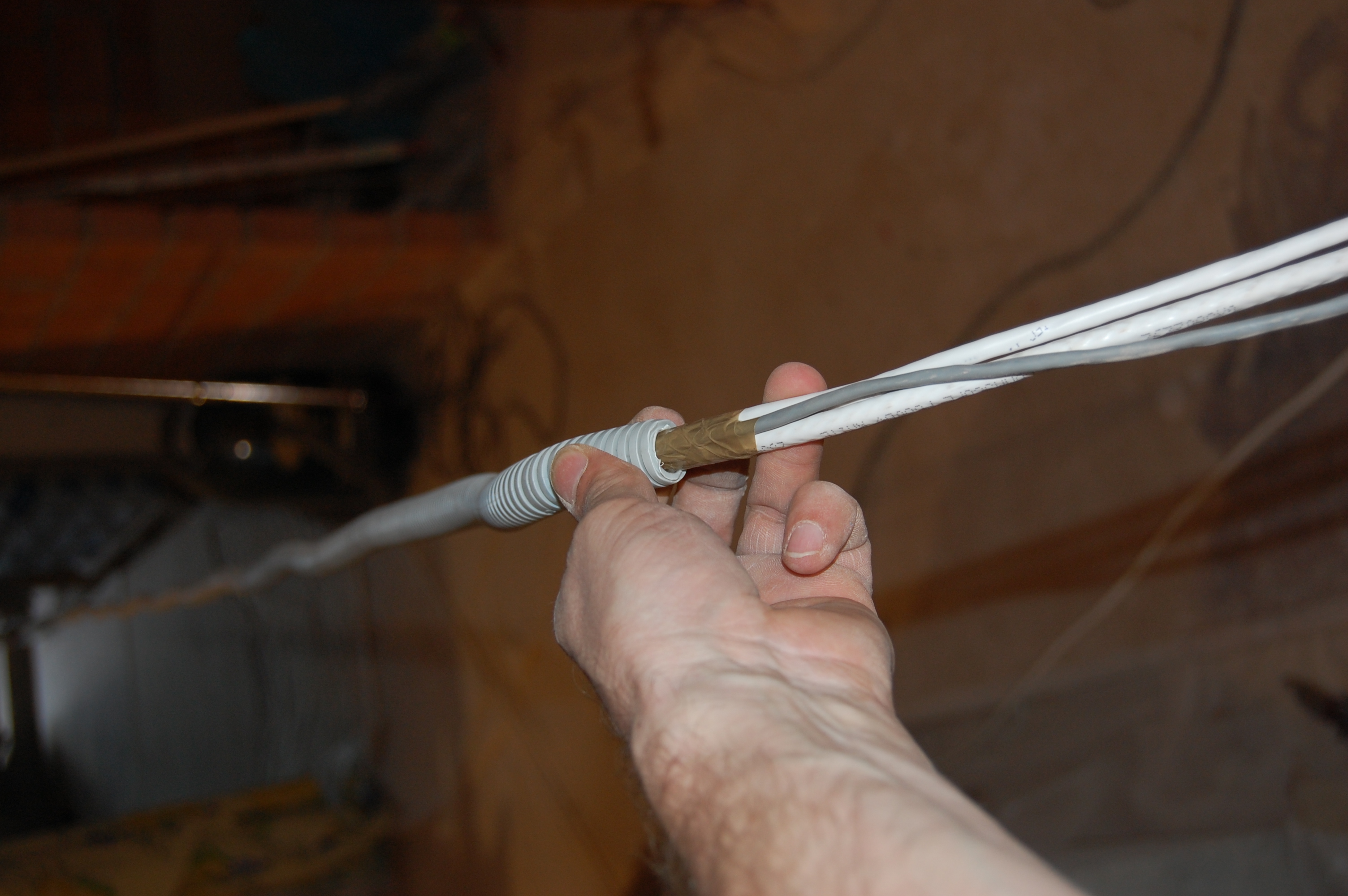 Попытки привязать его к струне оборачивались мёртвым заеданием в гофре. Поэтому поступил по другому. Просто заточил кабель наподобие карандаша Дальше вставил кабель в гофру, постаравшись как можно ровнее распрямить его И метра 2-2,5 он проталкивается без проблем В данном случае даже в гофру уже проложенную сквозь стену ( шёпотом: из кухни на лоджию ) |