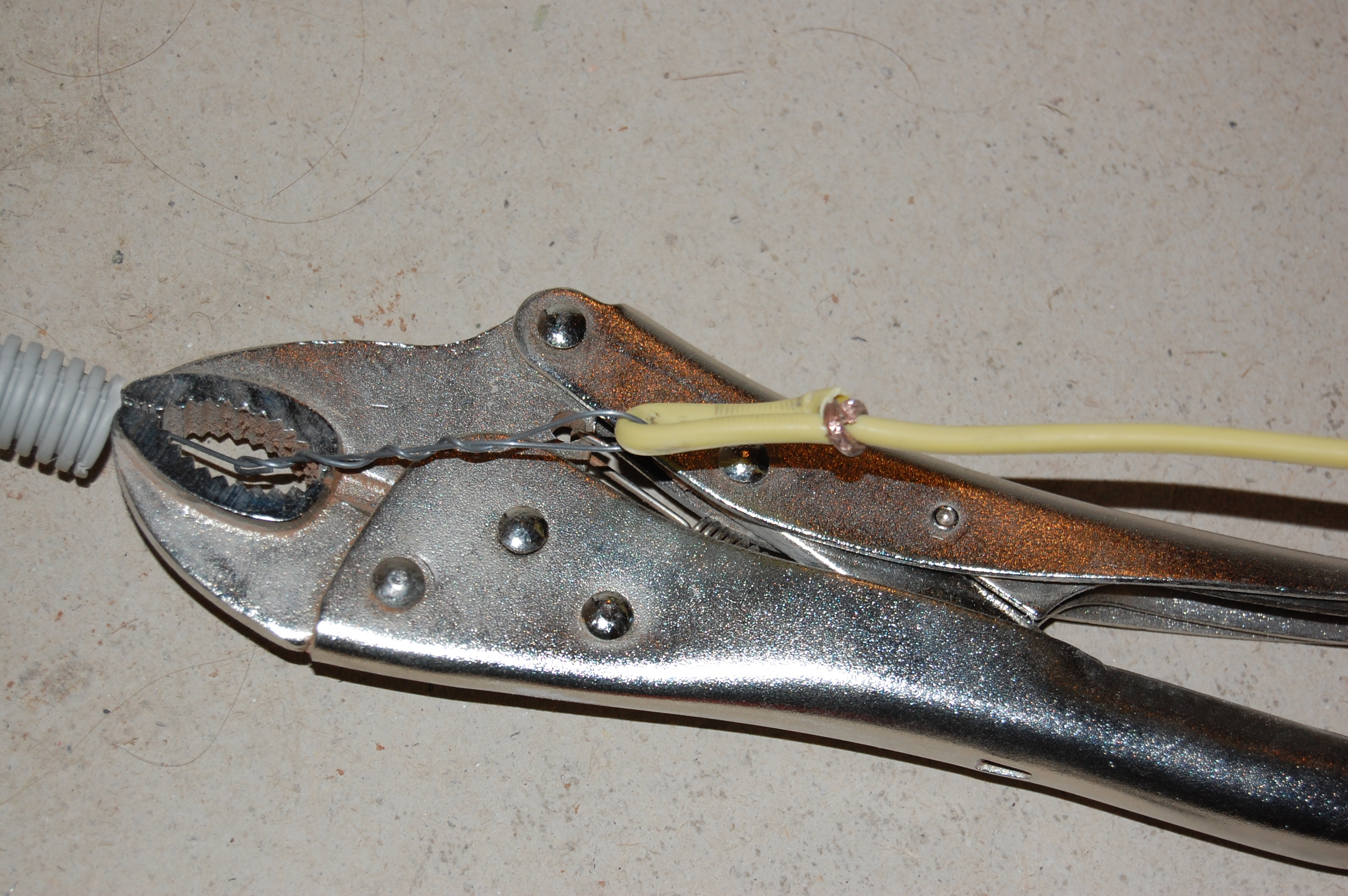 После того как гофру можно выпустить из рук на рабочей гофре на одном конце "проводки" завязываю кольцо Другой конец проводки тщательно так чтобы узел в гофру проходил обматывается-завязывается вокруг "пучка" проводов, которые должны быть затянуты в гофру Для того, чтобы струна не вырывалась из рук во время обвязки использую вот такой зажим Но он, конец (IMG:style_emoticons/default/laugh.gif) , гад цепляется внутри за рёбра, упирается, в следствии этого тяжело протягивается и гофру рвёт, и методом математического анализа, индукции, дедукции и научного втыка я под завершение этих работ стал делать по простому Пролетать стало просто на ура. Нерабочий, оставшийся свободным, конец связки проводов, чтоб он не улетел в гофру, красиво завязываем вот так или хотя бы так Далее всё совсем просто. Колечко проводки надеваем на саморез предварительно вкрученный в этот же "мерный стол" Пучок проводов направляем в отверстие гофры Аккуратно тянем, растягивая гофру и натягивая её на провода Проходя по всей длине гофры от хвоста к началу и обратно |