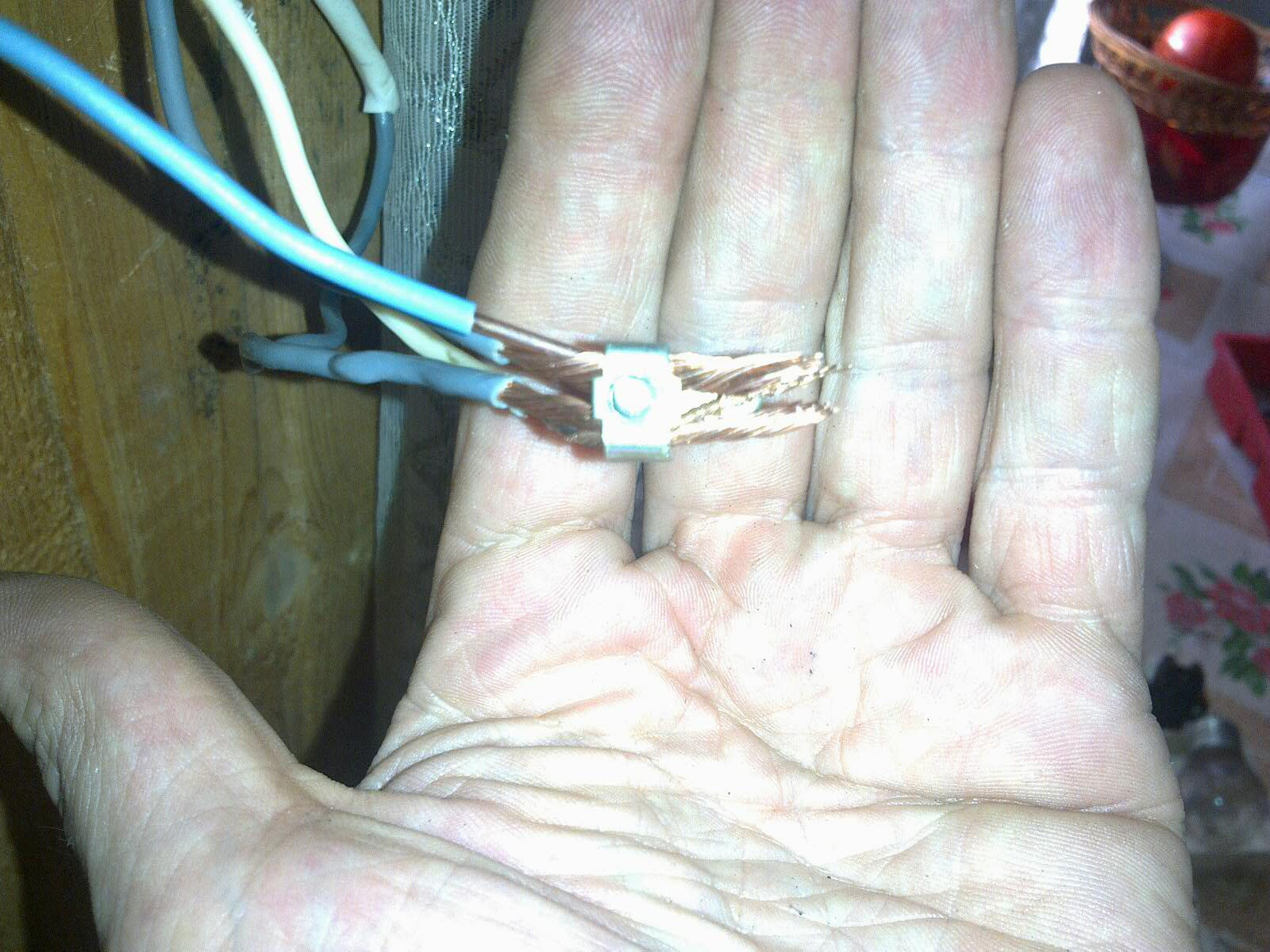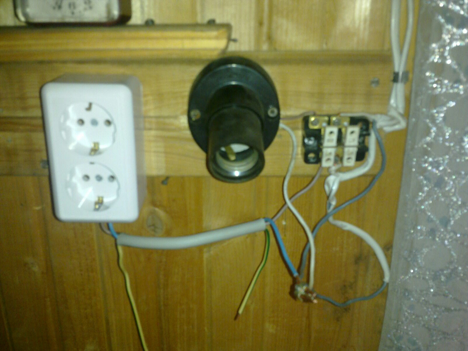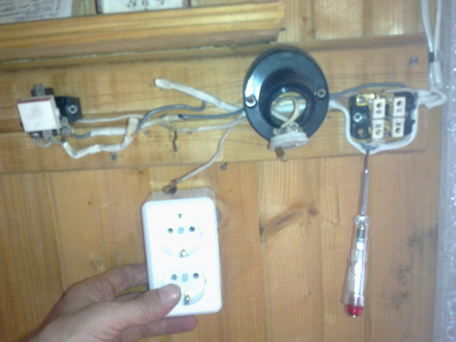 Приехал я за своими родителями на дачу. Мама говорит розетка для электрочайника сгорела. Полез смотреть. От схемы разводки офуел. Розетка была в том месте, где я новую держу: Я минут двадцать, ей-ей, не только затылок чесал, прежде чем дошло, как оно задумано: Правый двухклавишник на верхний свет и патрон "бра" (IMG:style_emoticons/default/laugh.gif) А розетка включалась через левый выключатель. Но вот зачем весь остальной ноль через него протянули - так и не понял. В машине давно валялся кусок провода 3х2,5 и пробник уже года как два в сумке лежит. В общем все запаралелил из того что нашёл: Так как клеммников с собой, понятное дело, не было, а скрутить одножилку с многожилками дело дохлое, из снятой то ли розетки, то ли выключателя вынул одну контактную группу и использовал как зажим: Чо профессиональные электрики скажут? //Чайку на дорожку попили (IMG:style_emoticons/default/biggrin.gif) |
