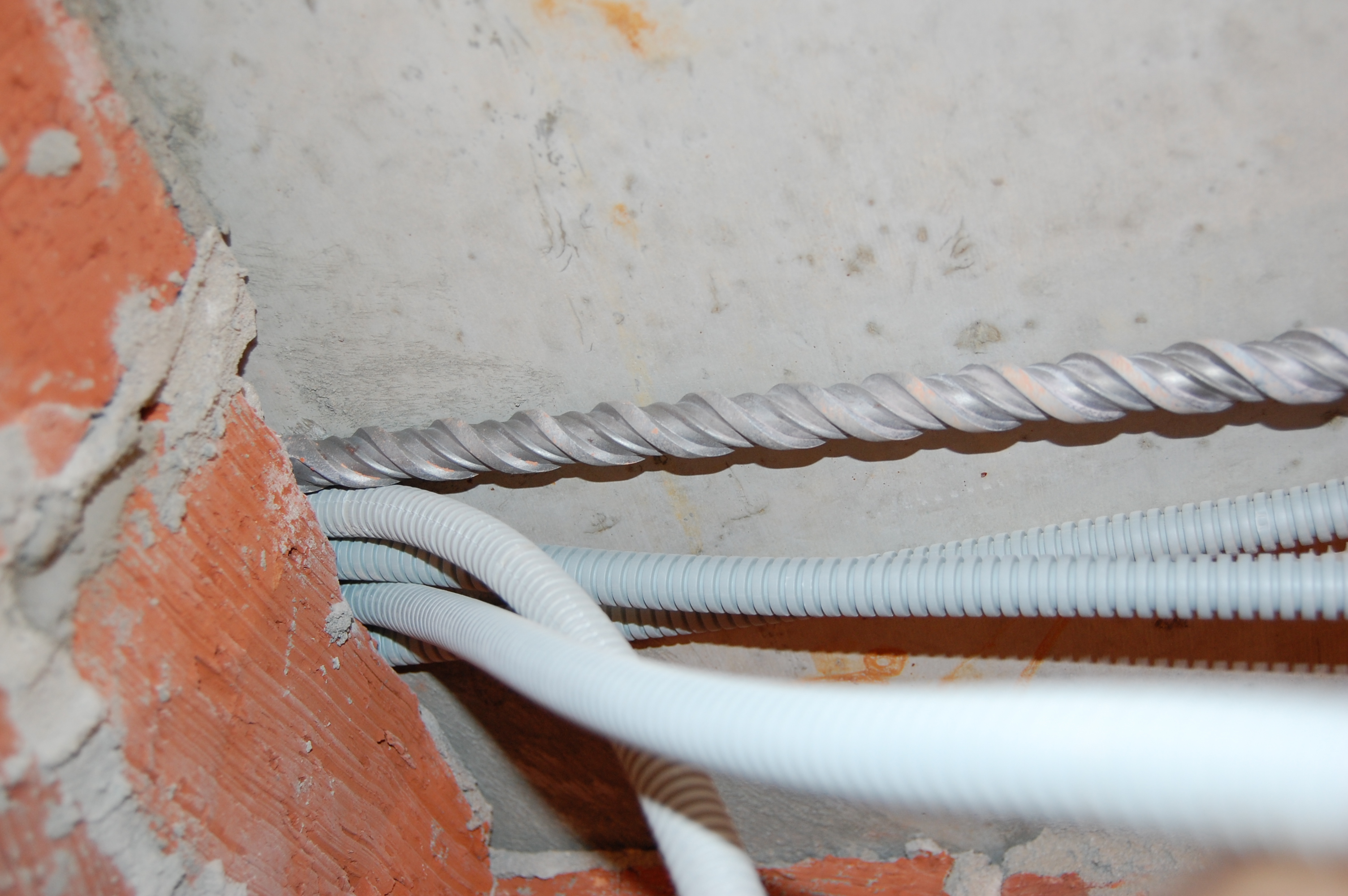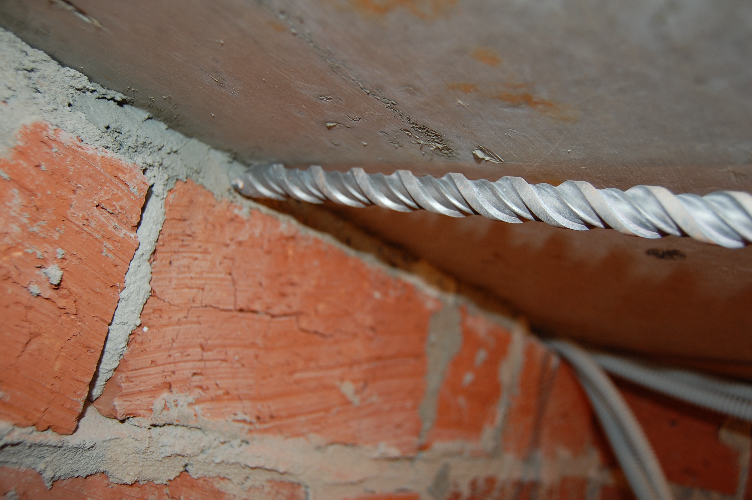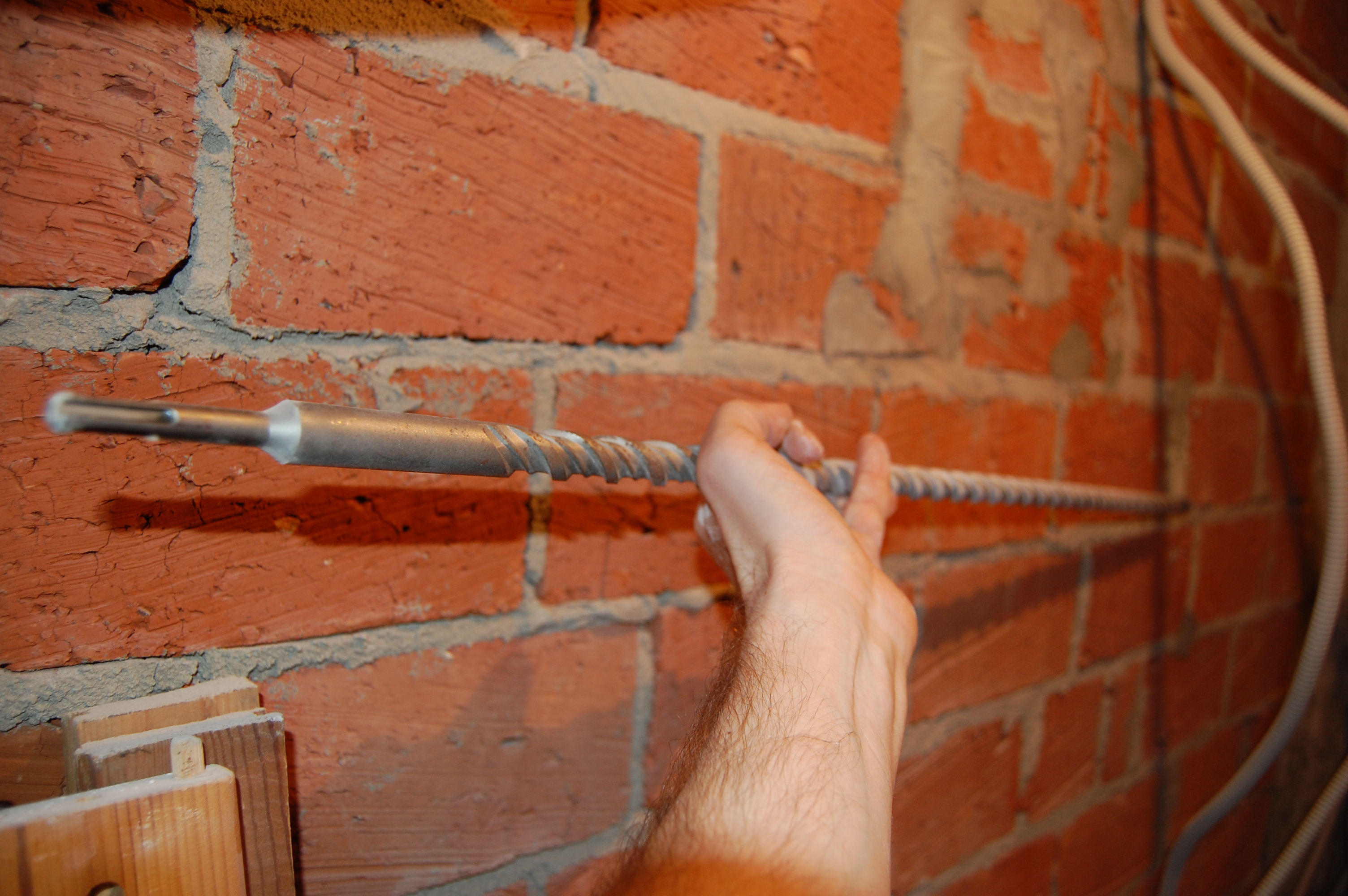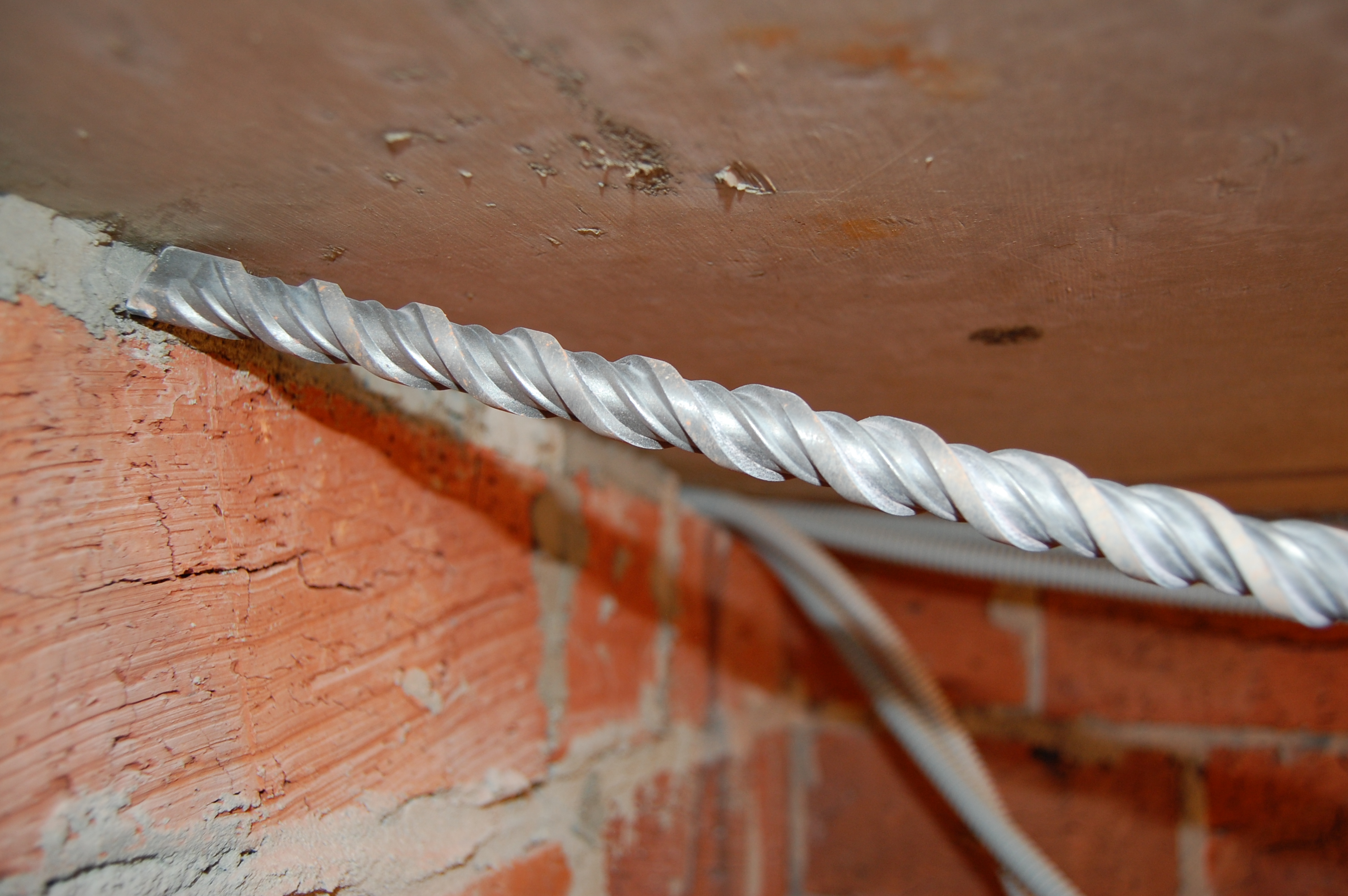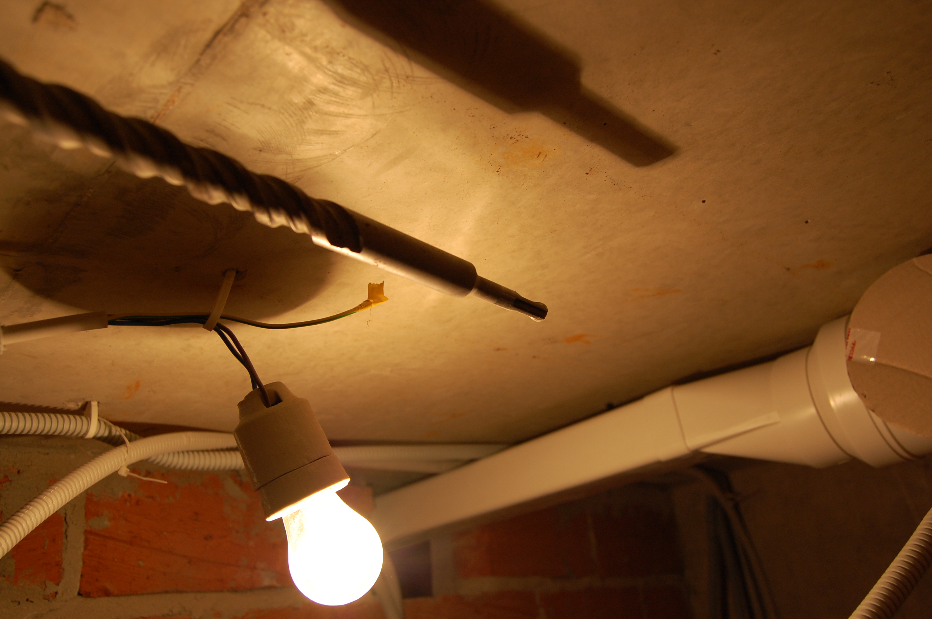 Естественно, что при прокладке кабель "проходит" сквозь стены. Когда стена кирпичная или бетонная - бур нужного диаметра и перфоратор в руки и под самой потолочной плитой бьём отверстия: Но есть нюанс (IMG:style_emoticons/default/biggrin.gif) : Чем длиннее бур тем легче это сделать. Если бур длинный, то его угол вхождения в стену, который задаёт высота/толщина висящего на его конце перфоратора, позволяет ему как бы скользить вдоль потолочной плиты. Вот его нос А вот хвост, на котором должен висеть перфоратор. Обращаем внимание на расстояние между хвостом и потолком А вот имитация работы короткого бура. Нос. Смотрим угол между буром и потолком. Хвост При таком угле работы, бур будет не скользить вдоль плиты, а постоянно пытаться "подгрызть" её. Что не радует сам бур и в десятки!!!! раз удлиняет процесс, так как бур постоянно клинит и мотает во все стороны. |