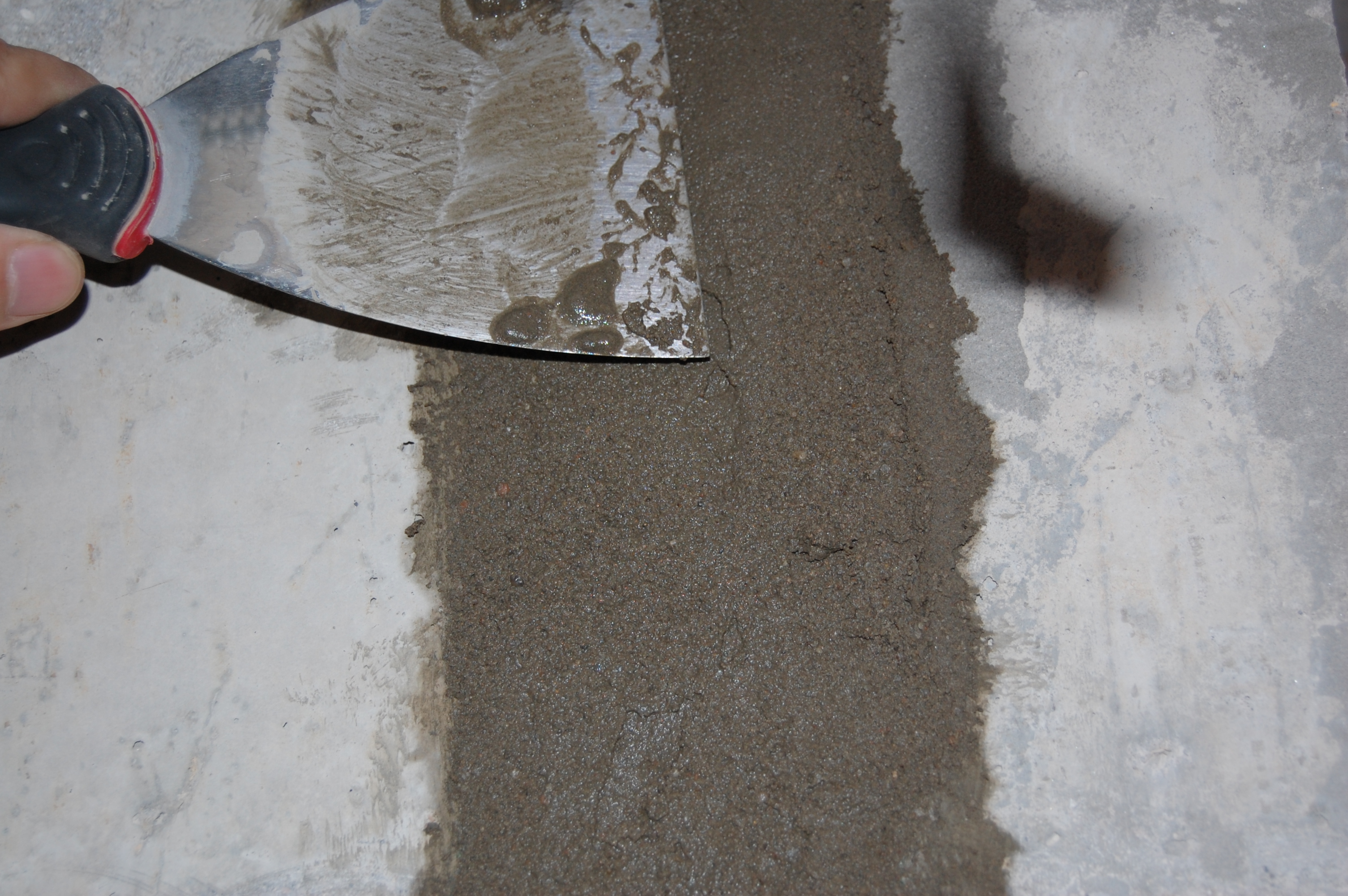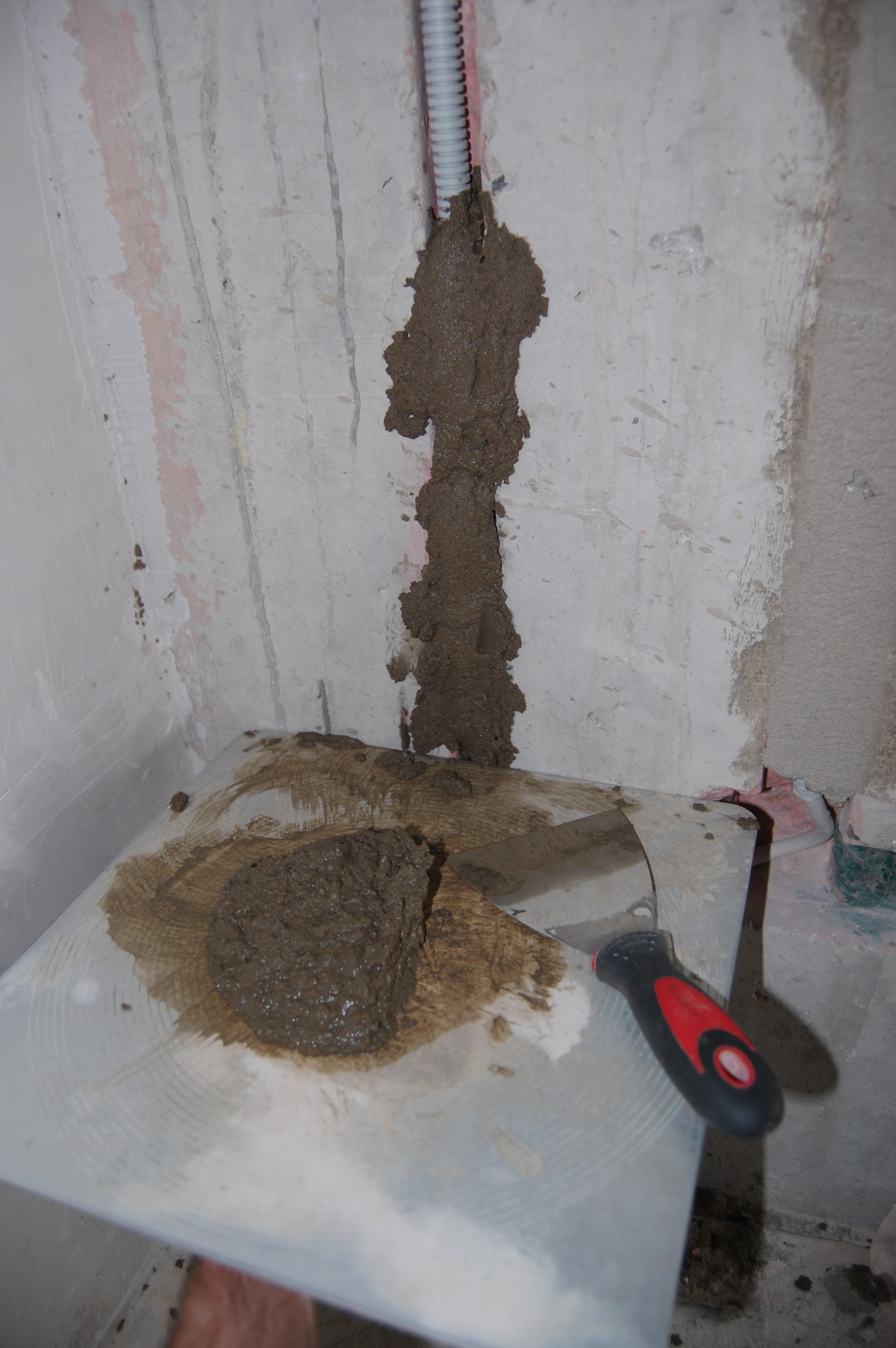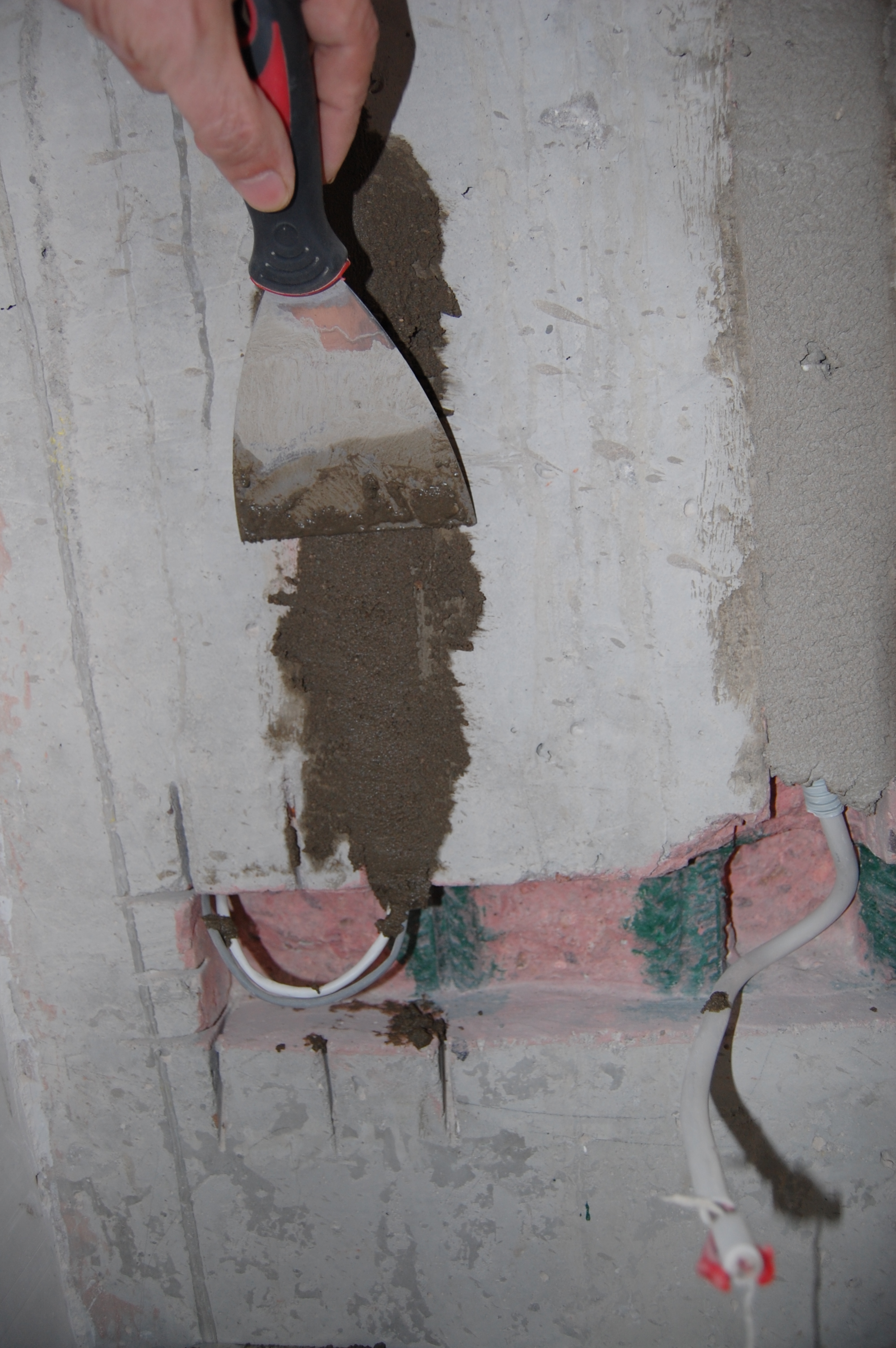 Ну здесь нет ничего хитрого. Эту операцию лучше проводить сразу же вслед за грунтовкой штроб и укладки в них кабеля, чтобы дно штробы и сама гофра не запылились. Да и то, я, чтобы дополнительно обеспылить поверхность сбрызгивал гофру со штробой из обыкновенного бытового пульвелизатора Для замазывания штроб, так как раствор уходит под оштукатуриваемую поверхность, можно использовать любые остатки: цементно-песчанных смесей, гипсовой штукатурки, клей от пазогребневых плит и блоков, плиточный клей ... Единственное, чего я на всякий случай придерживался, так это замазал штробы на стенах выходящих на улицу ЦПС, а на внутренние уже действительно, что оставалось ненужным для дальнейшего использования. Единственное, что не годится для данной работы - это пескобетон и остатки смеси от стяжки пола. Т.к. они крупнозернистые и плохонько прилипают к поверхности. На кончик 100-мм шпателя набираем смесь и с силой метко вбрасываю её в штробу И ещё. И ещё (IMG:style_emoticons/default/laugh.gif) Чтобы смесь не ссыпалась на пол, как видно на фотке перекрываю штробу штукатурным соколом Набрасывется смесь недлинными участками, чтобы основание, на которое набрасывается смесь, не успело высосать воду из раствора до его вмазывания в штробу. "Вмазку" смеси в штробу произвожу сильно нажимая на шпатель и уминая смесь в разных направлениях Вот так выглядит штроба замазанная гипсовой штукатуркой без покрытия "Бетон-контактом" и под ним А вот ЦПС |