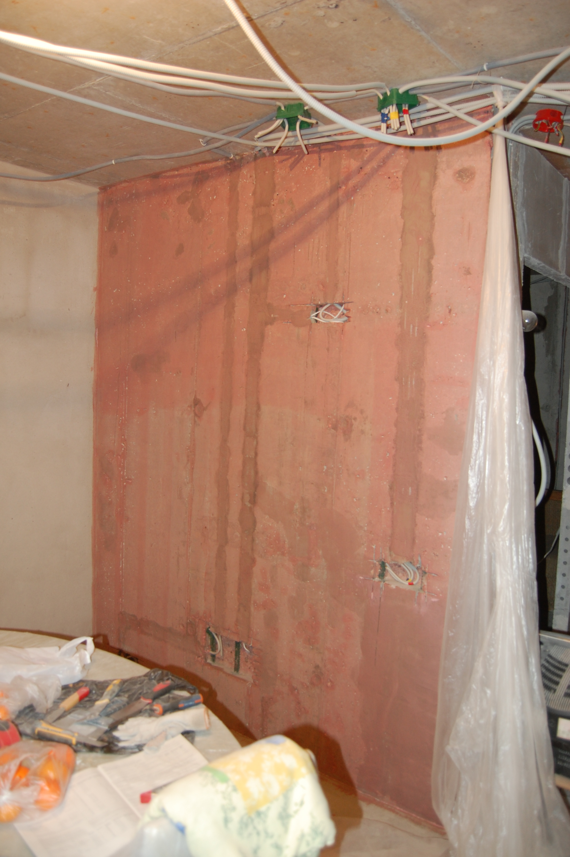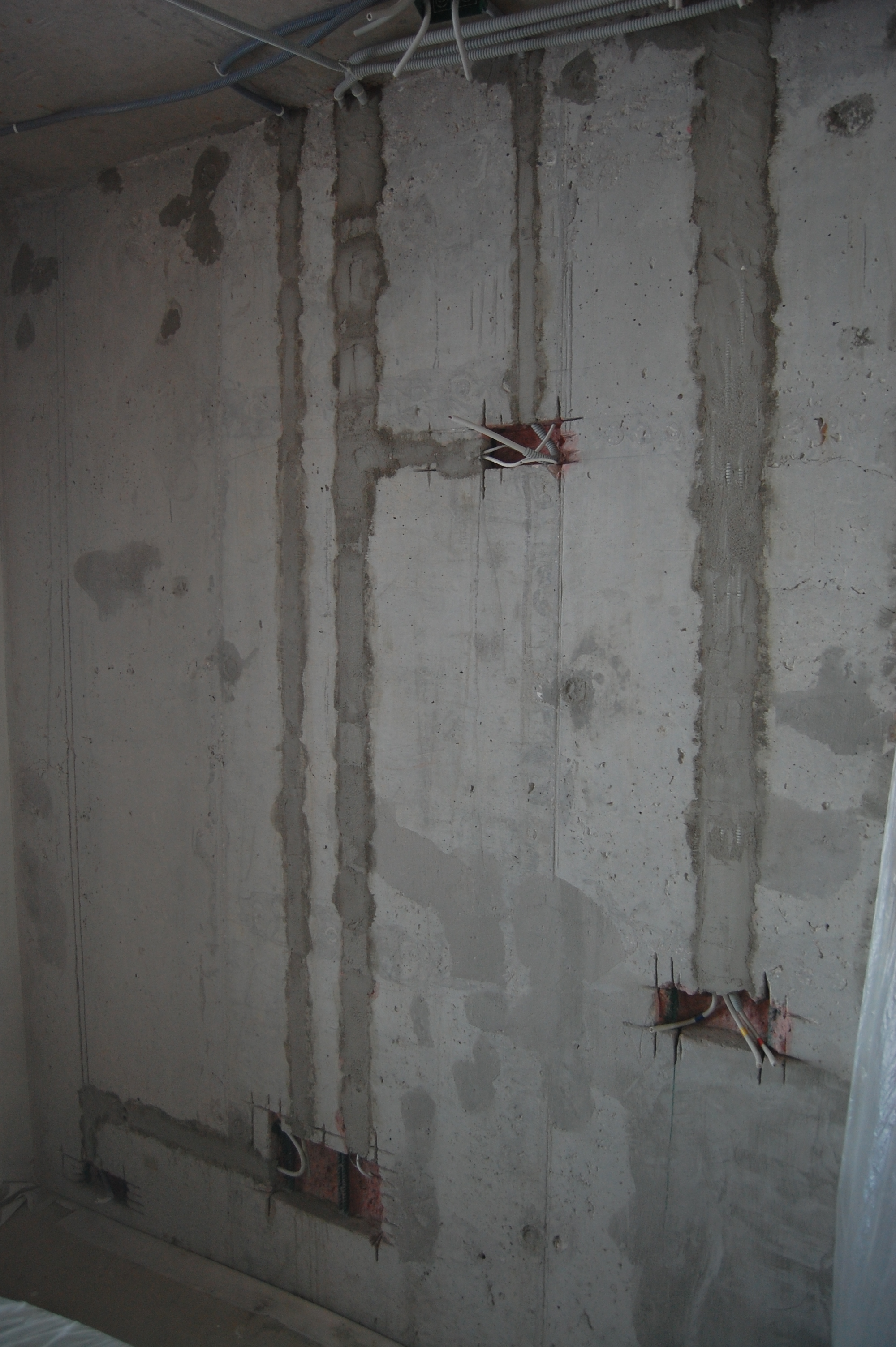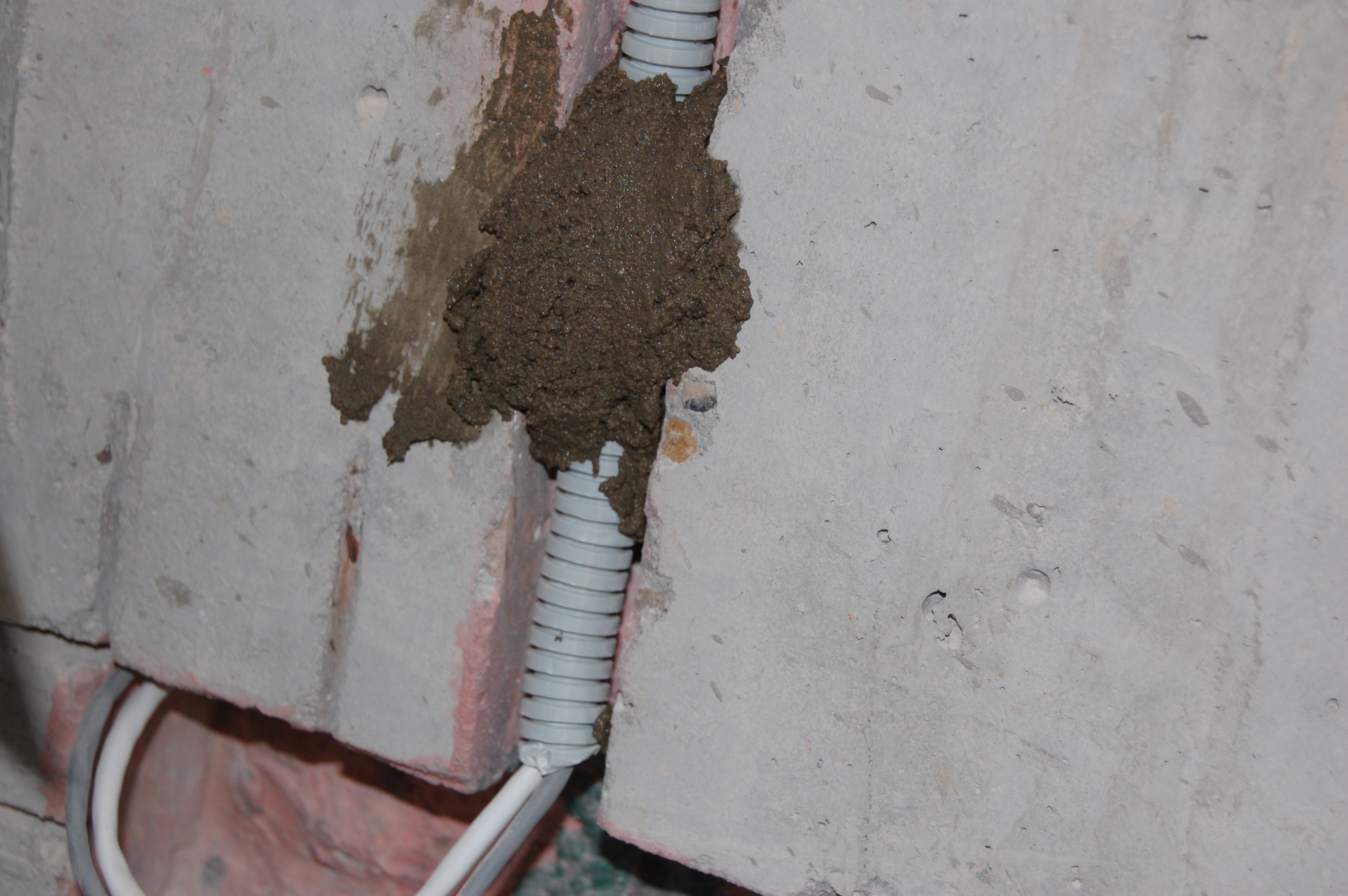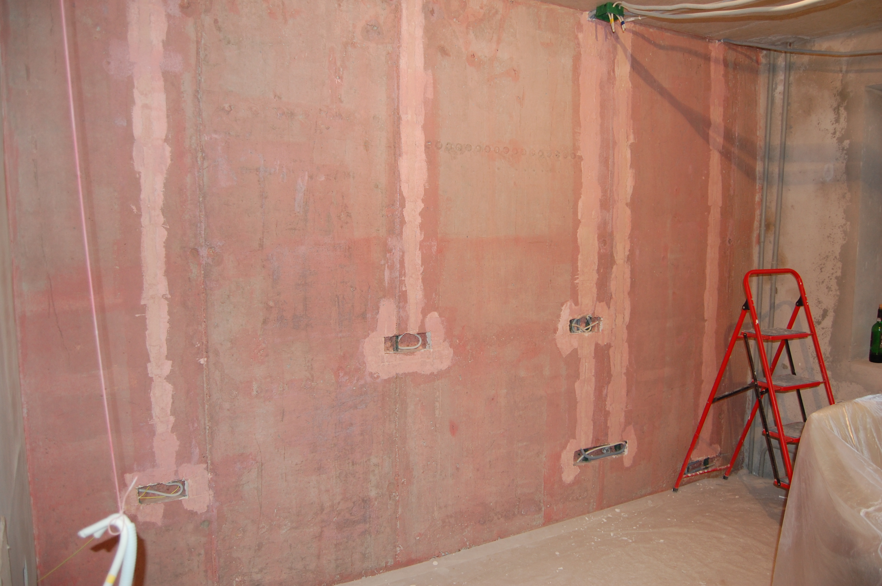 Ну здесь нет ничего хитрого. Эту операцию лучше проводить сразу же вслед за грунтовкой штроб и укладки в них кабеля, чтобы дно штробы и сама гофра не запылились. Да и то, я, чтобы дополнительно обеспылить поверхность сбрызгивал гофру со штробой из обыкновенного бытового пульвелизатора Для замазывания штроб, так как раствор уходит под оштукатуриваемую поверхность, можно использовать любые остатки: цементно-песчанных смесей, гипсовой штукатурки, клей от пазогребневых плит и блоков, плиточный клей ... Единственное, чего я на всякий случай придерживался, так это замазал штробы на стенах выходящих на улицу ЦПС, а на внутренние уже действительно, что оставалось ненужным для дальнейшего использования. Единственное, что не годится для данной работы - это пескобетон и остатки смеси от стяжки пола. Т.к. они крупнозернистые и плохонько прилипают к поверхности. На кончик 100-мм шпателя набираем смесь и с силой метко вбрасываю её в штробу И ещё. И ещё (IMG:style_emoticons/default/laugh.gif) Чтобы смесь не ссыпалась на пол, как видно на фотке перекрываю штробу штукатурным соколом Набрасывется смесь недлинными участками, чтобы основание, на которое набрасывается смесь, не успело высосать воду из раствора до его вмазывания в штробу. "Вмазку" смеси в штробу произвожу сильно нажимая на шпатель и уминая смесь в разных направлениях Вот так выглядит штроба замазанная гипсовой штукатуркой без покрытия "Бетон-контактом" и под ним А вот ЦПС |