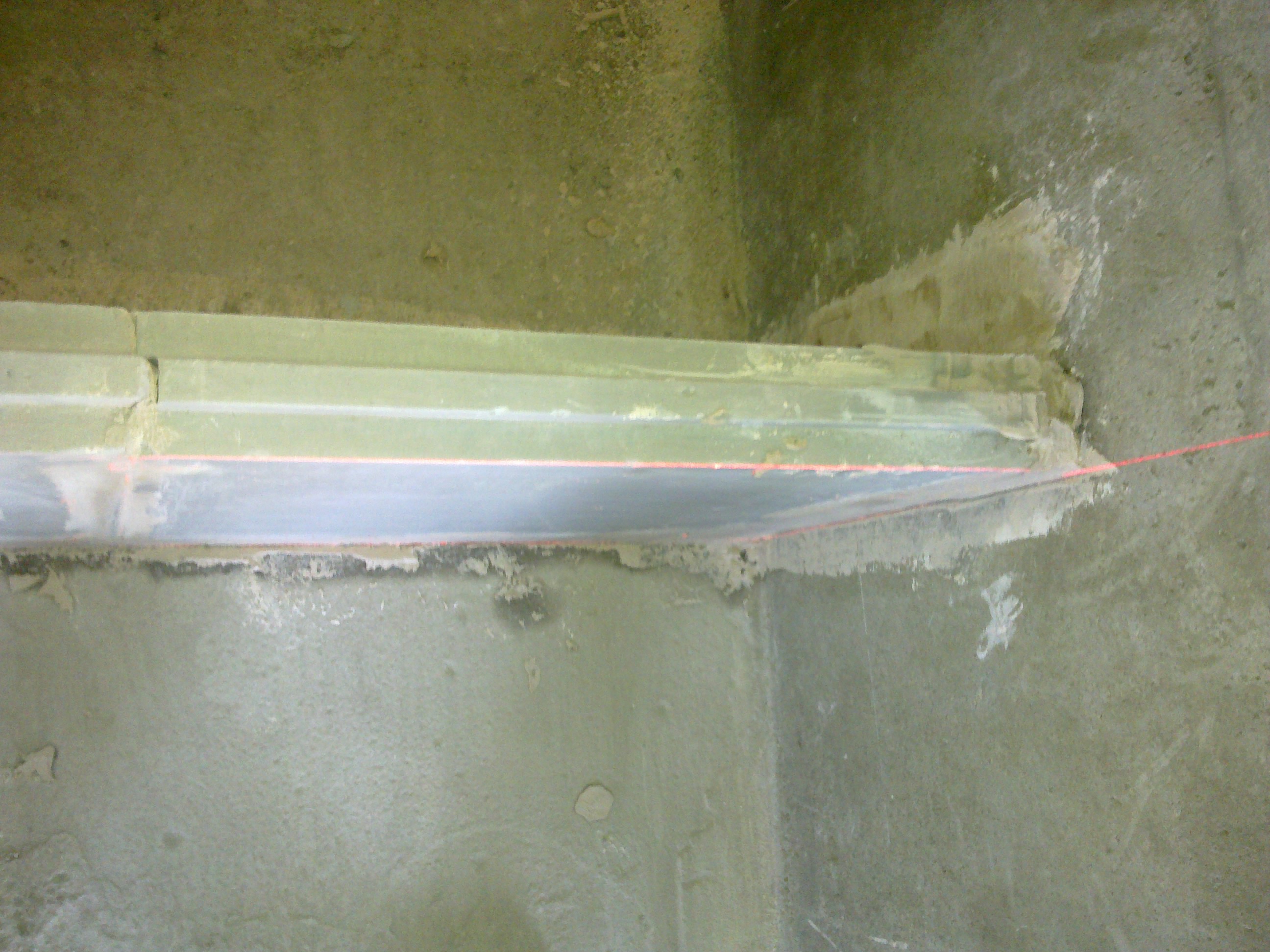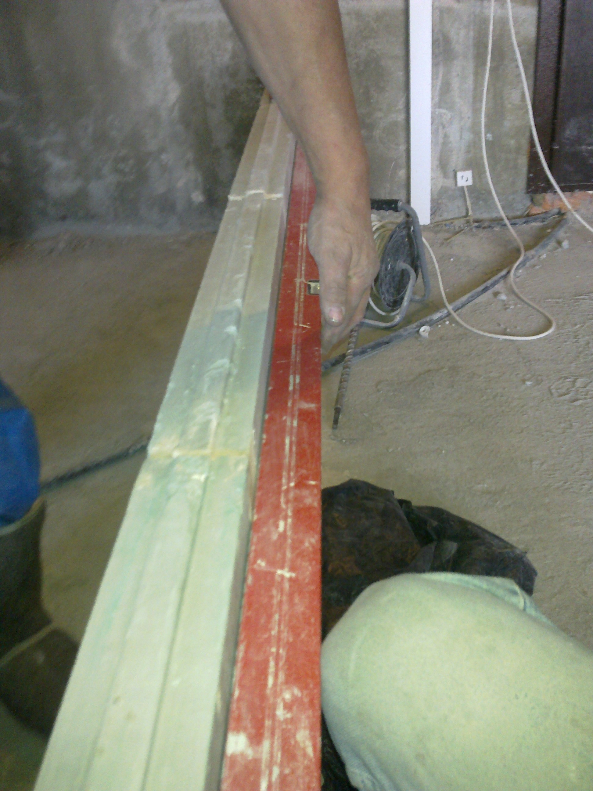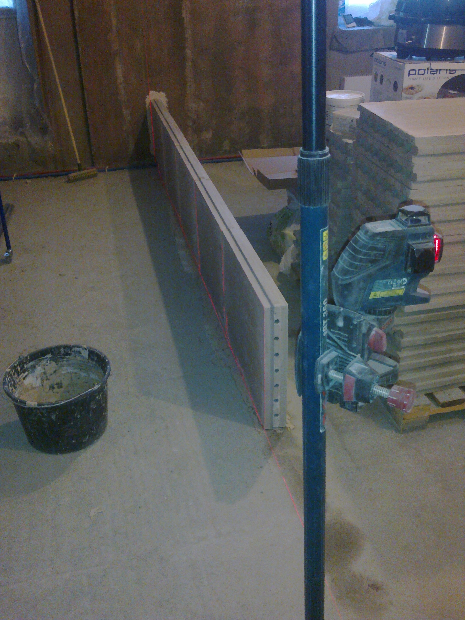 Когда "насобачишься", то можно и от лазера. Как например здесь: Три блока на лазер, два от него, обозначив дверной проём, и за перпендикулярной перегородкой ещё не установлены огрызки для встроенного шкафа В принципе лазер такая штука, что хоть сверху. По барабану Ради прикола решили проверить плоскость ряда уровнем. И выяснили что уровень кривой (IMG:style_emoticons/default/laugh.gif) |