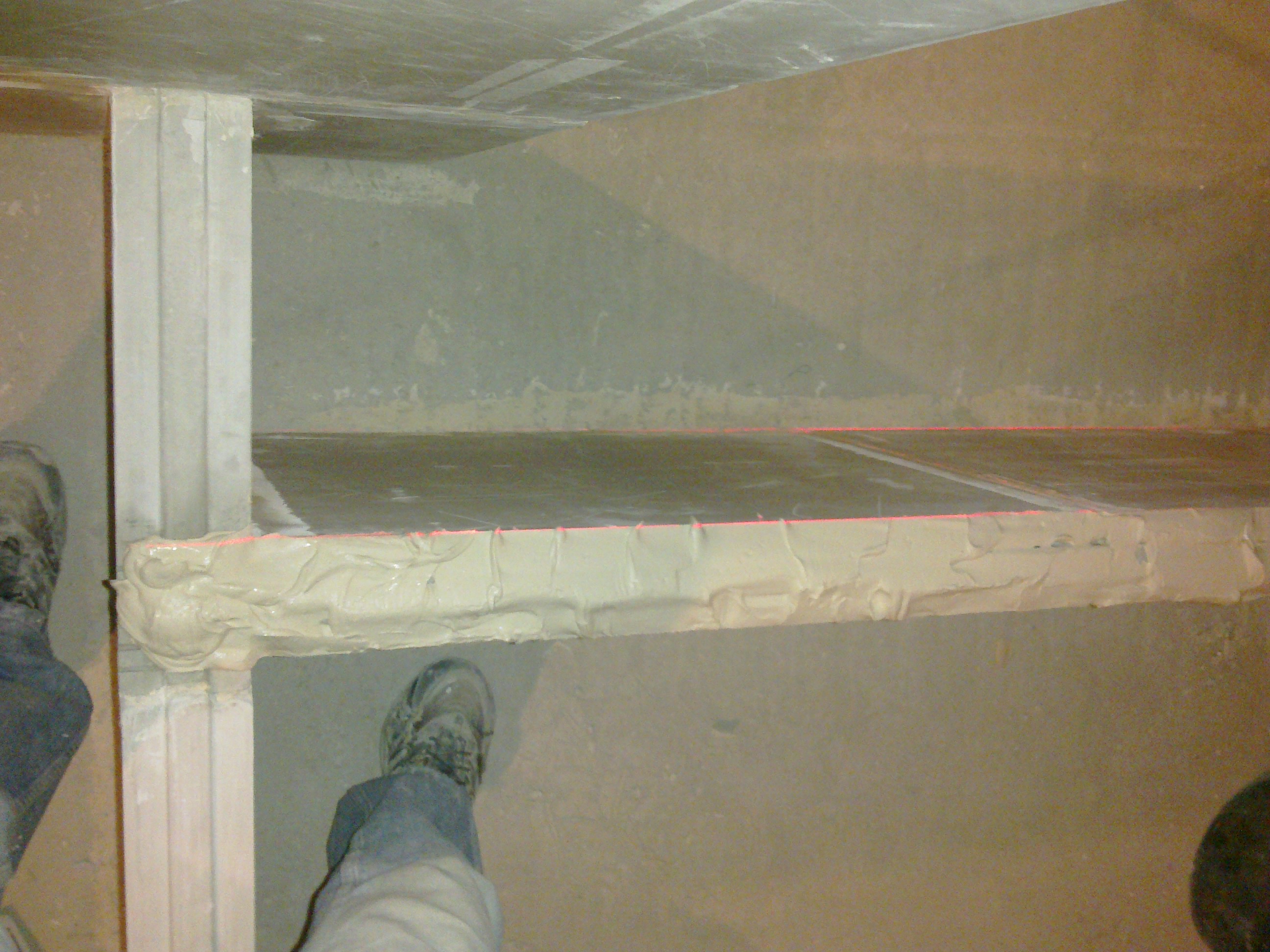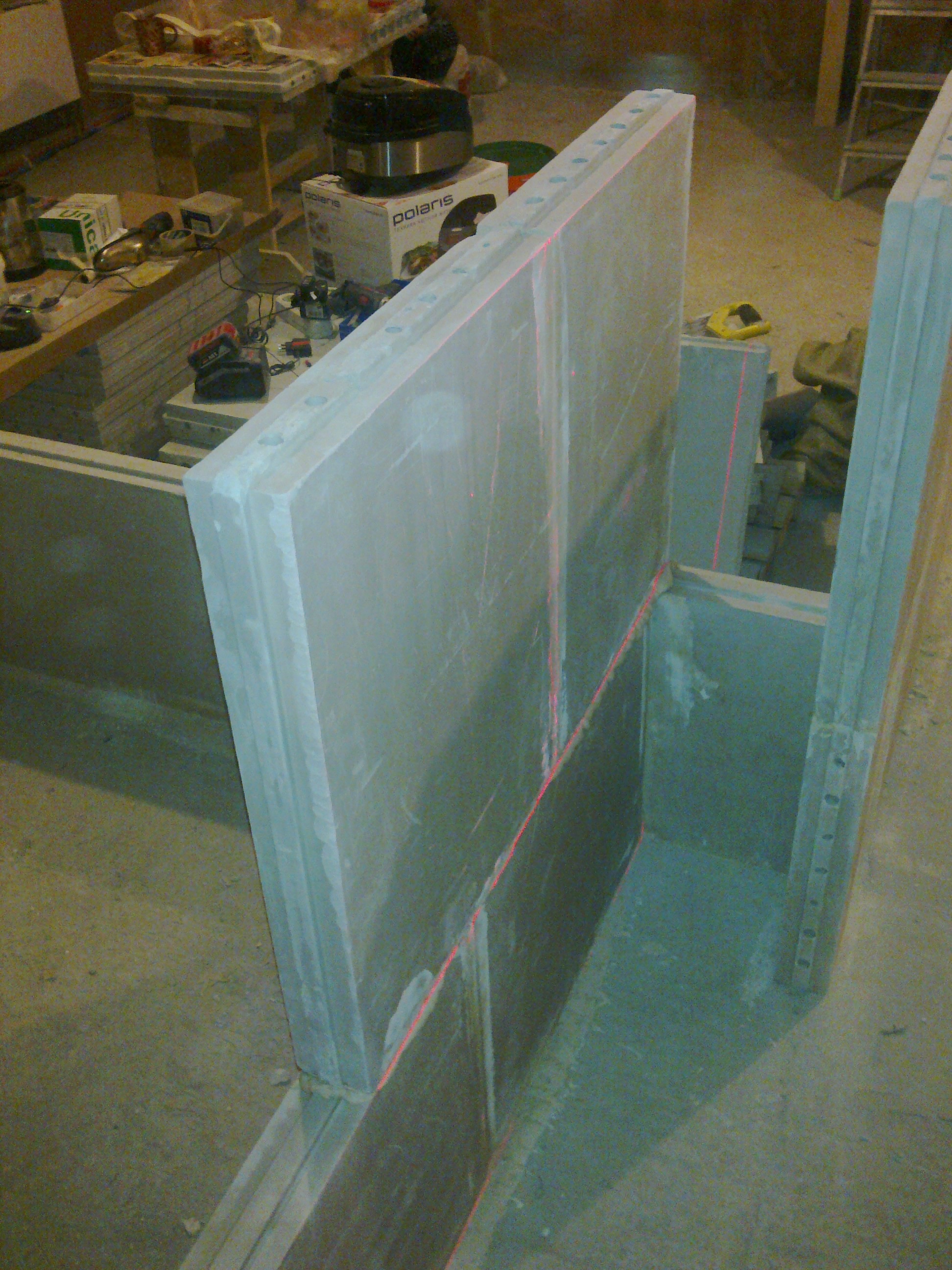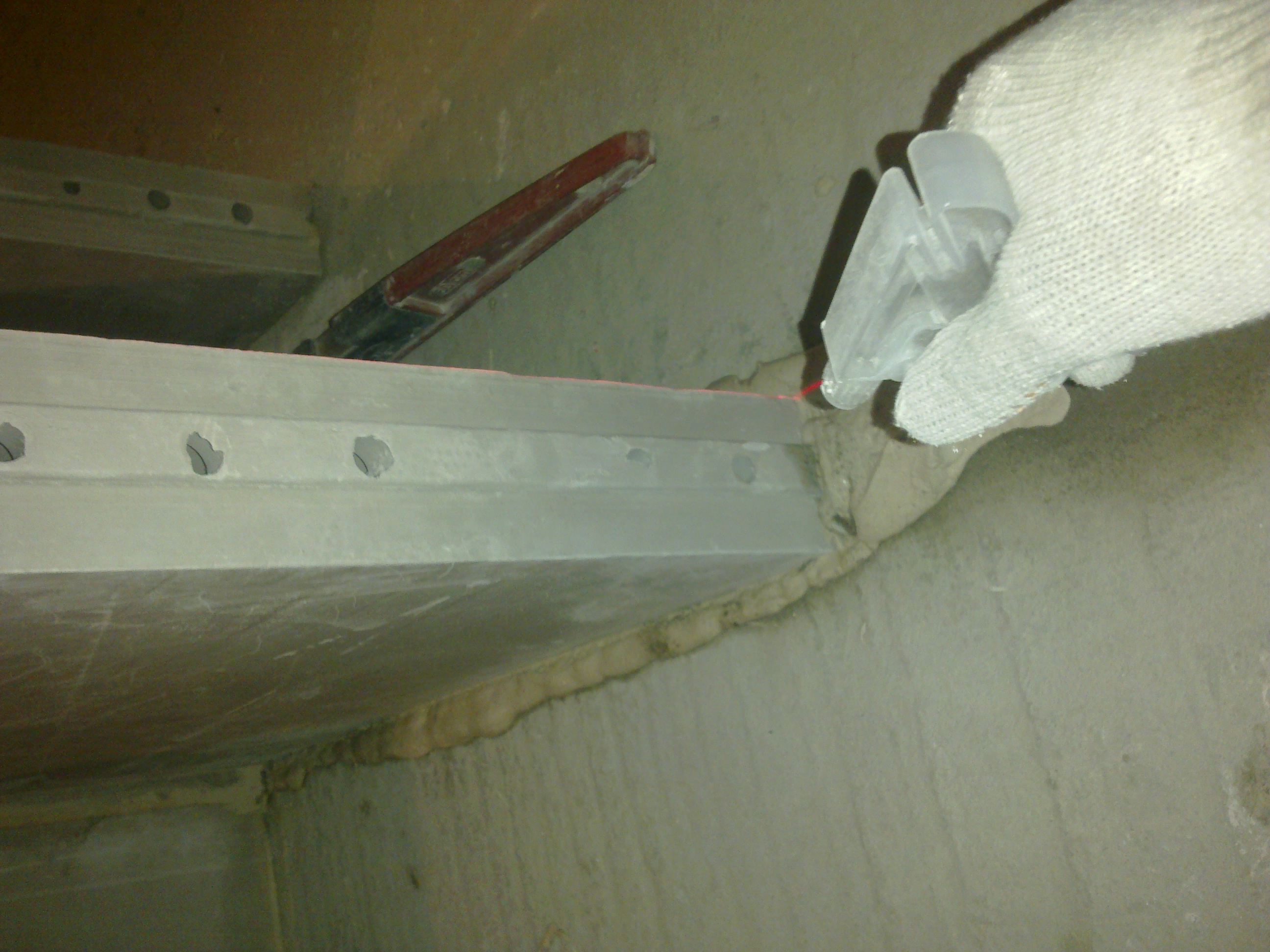 Когда "насобачишься", то можно и от лазера. Как например здесь: Три блока на лазер, два от него, обозначив дверной проём, и за перпендикулярной перегородкой ещё не установлены огрызки для встроенного шкафа В принципе лазер такая штука, что хоть сверху. По барабану Ради прикола решили проверить плоскость ряда уровнем. И выяснили что уровень кривой (IMG:style_emoticons/default/laugh.gif) |