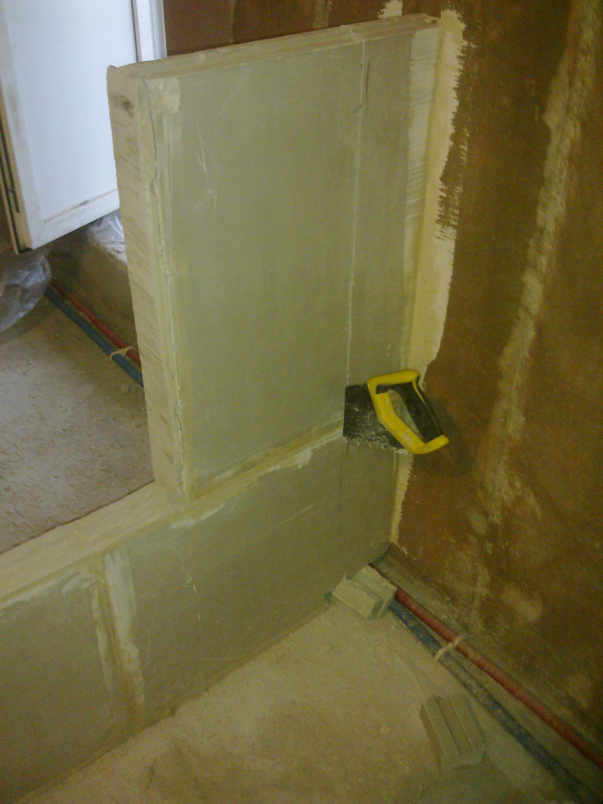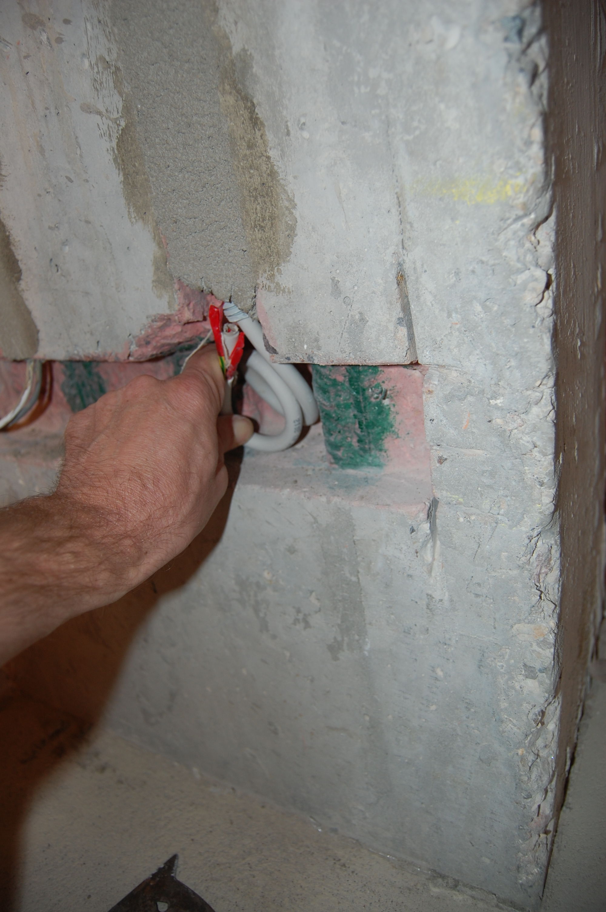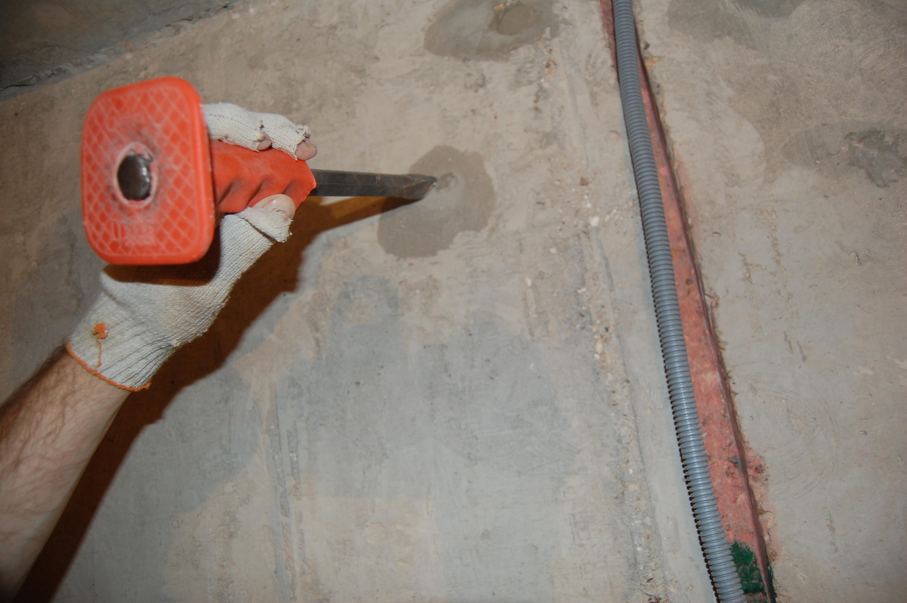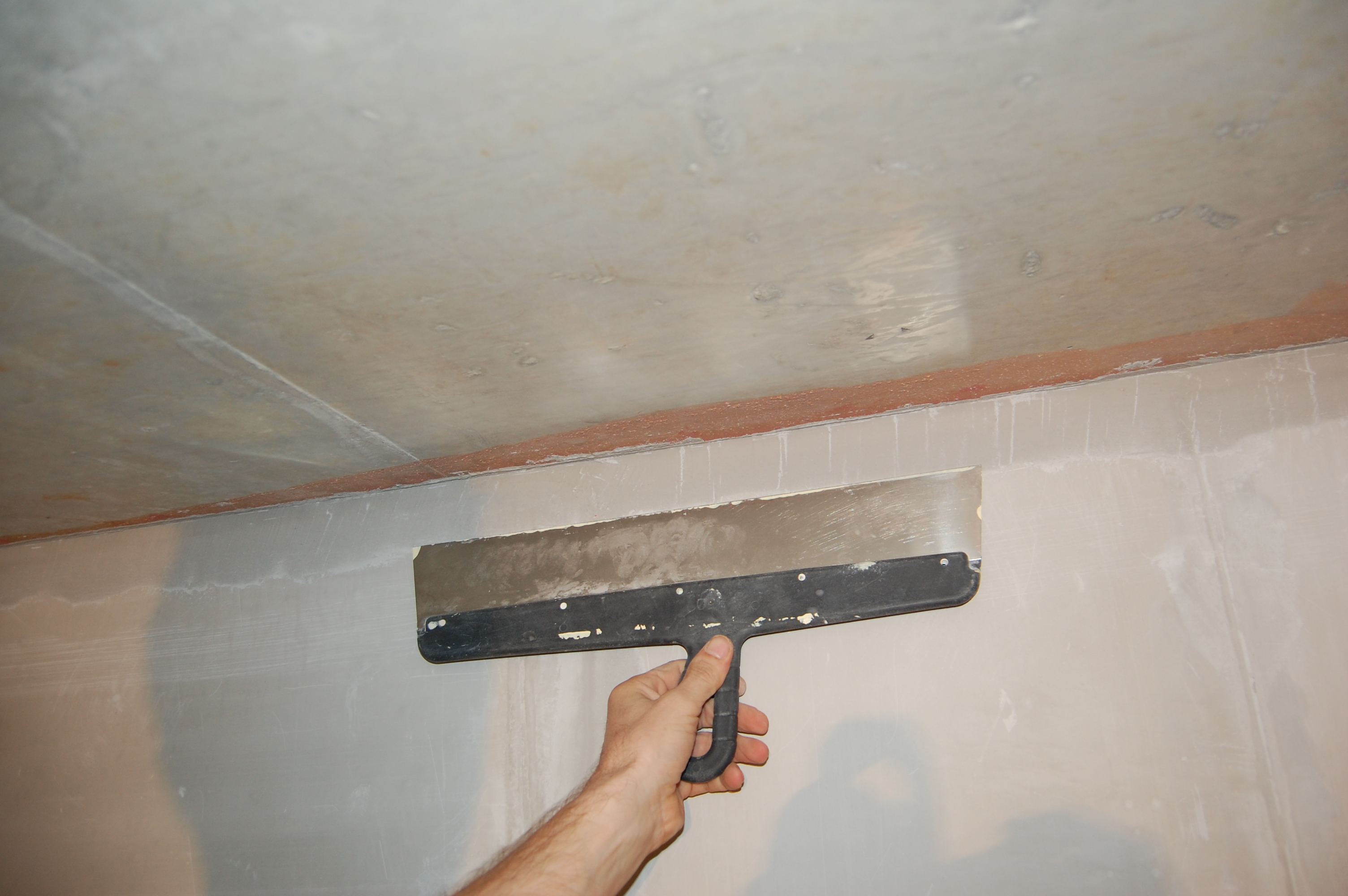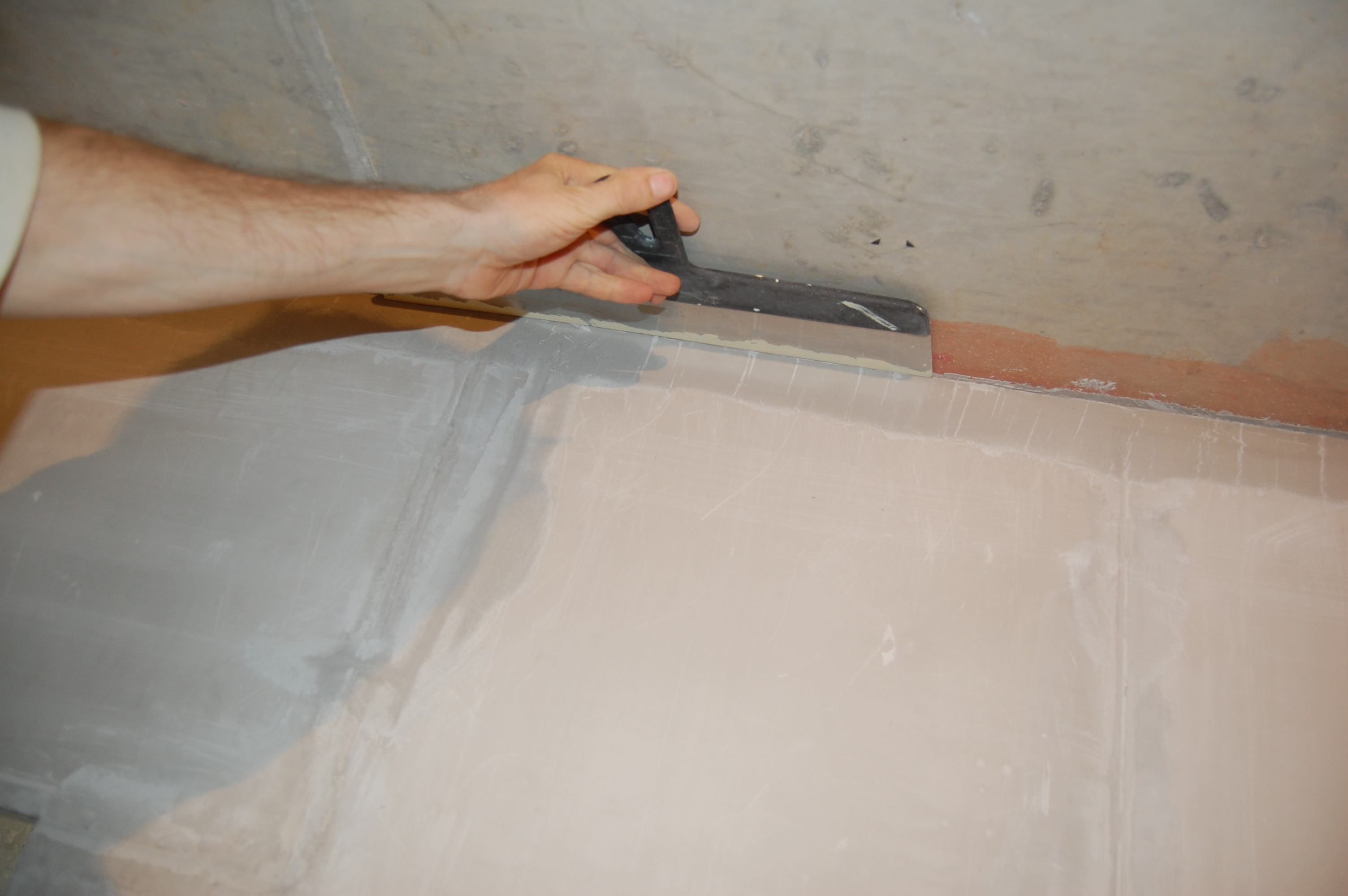 Подготовка стен для оштукатуривания Самым первым делом, чтобы не запылились, замазываю запененные стыки стен и потолка, на которых я и остановился ... давным-давно (IMG:style_emoticons/default/biggrin.gif) В принципе их достаточно просто сбрызнуть водой, чтобы обеспылить. Никаких нагрузок там нет. Да и прикрыты будут штукатуркой. У меня они промазаны бетон-контактом, т.к. очень хотелось добиться наилучшего прилипания клея к поверхностям, дабы исключить появление малейших щелей через которые может проникать звук Замазывать можно практически чем угодно и остатками клея для блоков, и штукатуркой, и плиточным клеем, и цементно-песчанной смесью... Ну весь тот же арсенал, что и для замазки штроб с теми же исключениями в виде пескобетона. Я предпочёл для себя гипсовую смесь, так как ЦПС всё-таки менее трещиностойки. В данном случае всё тот же "Пластер-блок" Зубилом, хотя в теории для этого существуют специальные скребки и топоры, которых мне так и не удалось даже увидеть, срубаю всякие наросты, которые могут "выйти" за маяк или вызывают сомнения в прочности прилипания к стене Им же, на хороший удар молотка, проверяем всякие подозрительные места на стене, чтобы потом в этом месте штукатурка не осыпалась вместе с укрытой ей поверхностью Универсальным шпателем, который всё-таки скорее более скребок и обычной металлической щёткой лучше пройтись по стенам на предмет удаления всяких "рыхлостей" Гвоздодёром выдираем куски вбитой в бетон арматуры По стенам обязательно надо "пройтись" хотя бы широким дешёвым шпателем И обязательно им же удаляем всякие выступы, которые непременно обломятся при оштукатуривании на шве между стеной и потолком И с потолка налипший около шва клей Хорошо прилипший можно не отскабливать. Вдоль низа стены я тоже прохожу скребком, так как там непременно будут "шлёпки" от упавших растворов от склеивания блоков и заделки штроб. При оштукатуривании правило тянется вверх от самого пола и при его прикладывании зацепит за нарост на полу. Правило зацепившись за нарост либо "скакнёт", либо "загуляет". А низ стены, прямизна которого будет подчёркнута идеально прямым плинтусом полового покрытия, даже важнее того, что будет находится на уровне глаз. Провода подворачиваем и прячем в будущие подрозетники |