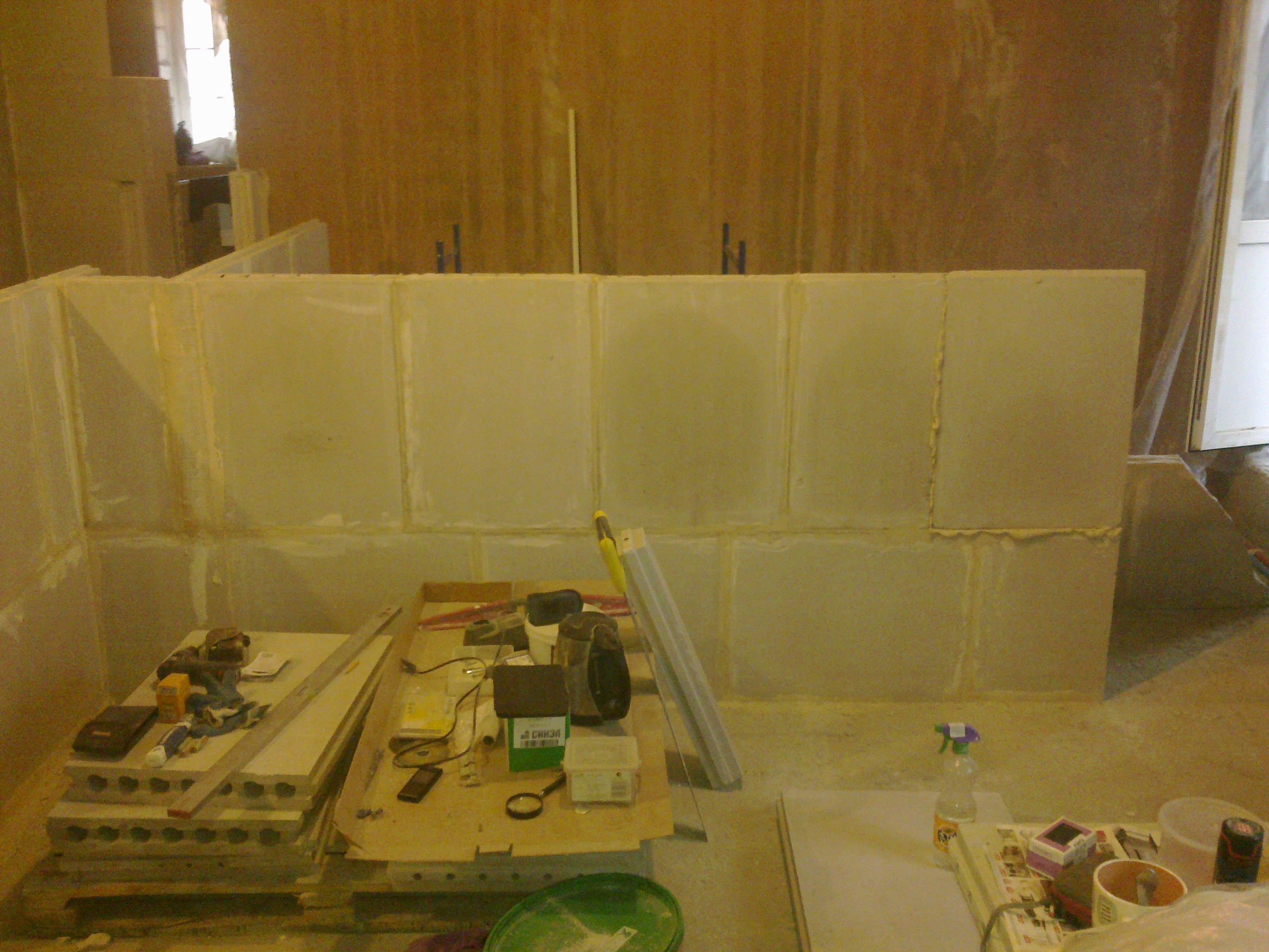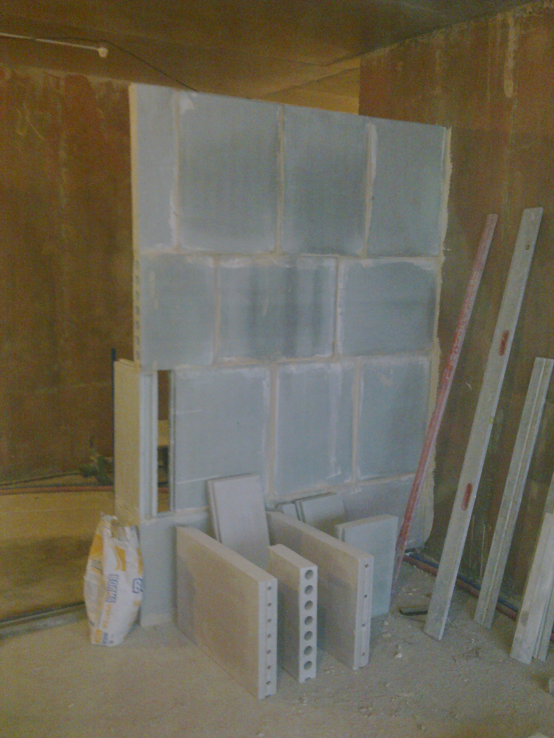 Не проблема. "Любой каприз..." Только обратите внимание, что под низ плиты у стены подсунут упор. Ведь там же вырез для труб отопления. Вот чтобы оставшаяся часть в воздухе не висела на всякий случай. Выпиленные блоки вполне можно использовать в качестве "старта" другой перегородки На конец перегородки второго ряда, в этом ряду он справа (IMG:style_emoticons/default/biggrin.gif) , ставлю не обрезанный блок, так как он тогда бы швом совпал с нижним блоком - "НиззззЯ!!!!!"(с) (IMG:style_emoticons/default/laugh.gif) , а цельный, поменяв их местами. Естественно заранее надо учитывать |