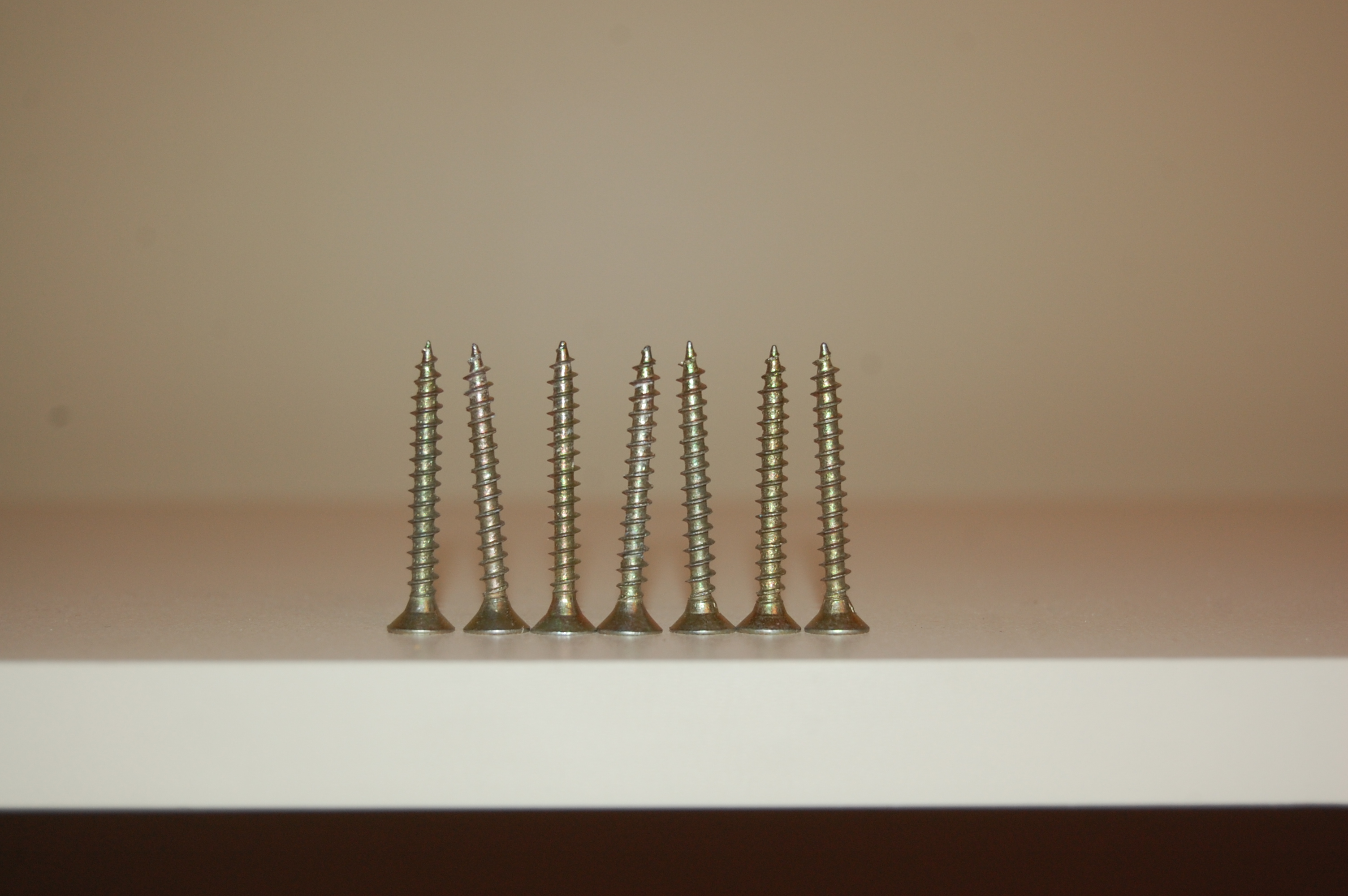 Гордость кухни только в её дешевизне, форме и цвете, которые мы сами выбрали. А инструкция на сборку такова, что не был бы я инженером, возможно бы и не разобрался со сборкой и той кучей механизмов, которые мы к ней дозаказали. Ну и всякие там запилы и кернения нашим механизмам тоже не пригодились. Да и набор крепежа там просто какой-то стандартный лежал без учёта нашего проекта. У меня до сих пор вопросы, кто так саморезы умудрился сделать?: Или как гвоздики, уже из набора комнатной мебели, и вроде бы одинаковые, такими получились |