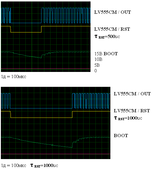 Цитата Кто-бы мог проверить у себя? Вот результаты моих экспериментов. "Собрал" схемку, которая должна вырабатывать сигнал BOOT. Как видно (несколько постов выше), 555 сбрасывается инверсным сигналом. Если этот импульс 0,5мс, то на выходе BOOT уровень не доходит до 5В. При 1мс - доходит. Но что это за сигал? Кстати, форма сигнала при нагрузке - 10к (реальную не знаю).