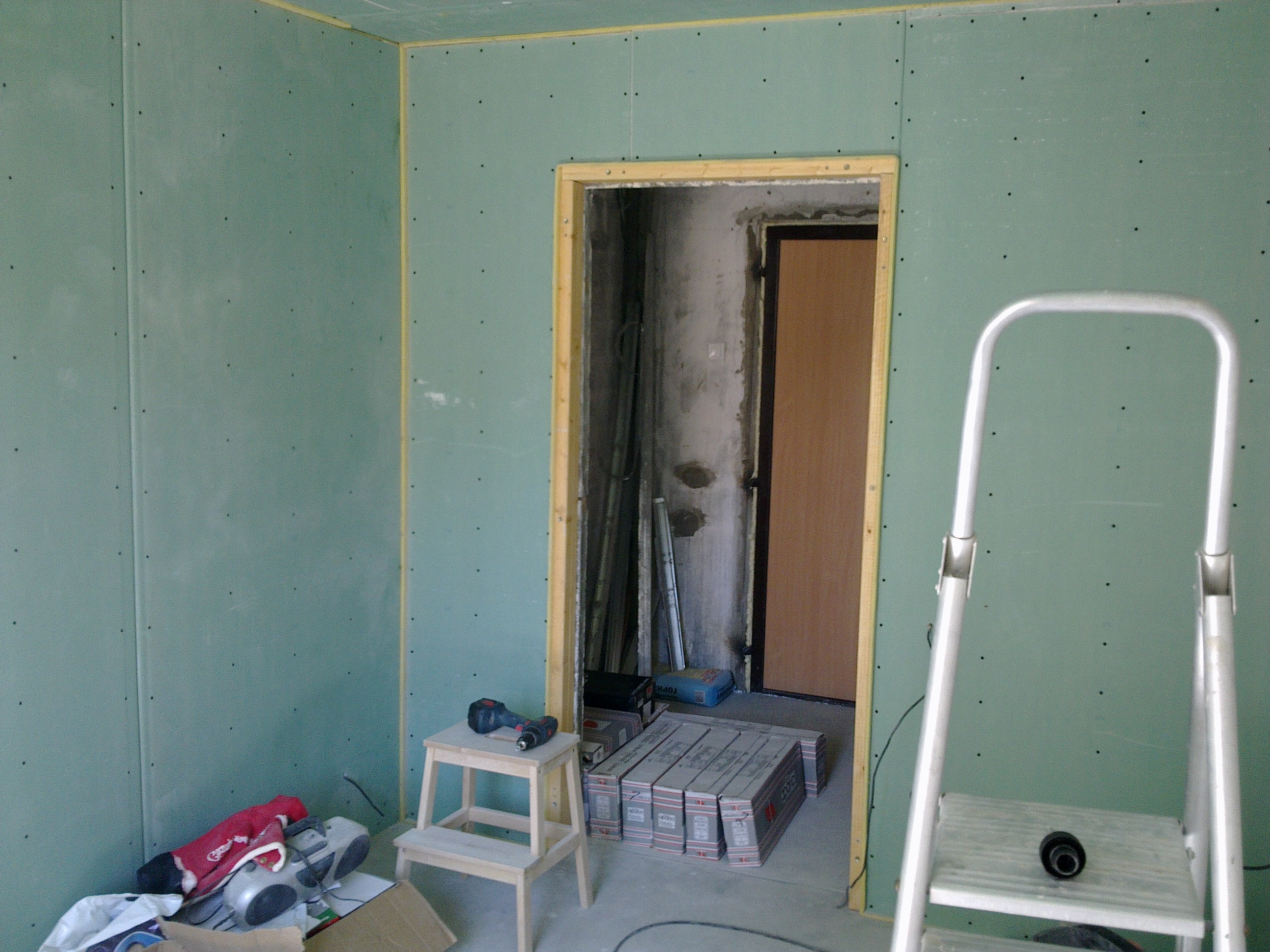 Что еще хорошего сказать... Вот вам фото стены с дверным проемом с звукоизоляционной облицовкой. Самая маленькая стена, но самая геморройная, ибо тонкая (единственная ненесущая в квартире, если не считать стены туалета с ванной) и периодически с другой стороны вылетали куски бетона (IMG:style_emoticons/default/smile.gif) Так что она у меня с обратки как после обстрела. Для примыкания ЗИПСа проем, как видите, обрамляется брусом. Фоткал сегодня, самые внимательные на полу в коридоре могут заметить упаковки плитки. Сегодня ее привезли, натаскался... Лифт еще, гадство, не работал грузовой, так что пришлось частями на пассажирском. Хотя достаточно быстро на мой взгляд лифтер пришел и починил лифт - где-то через час после моего звонка. |