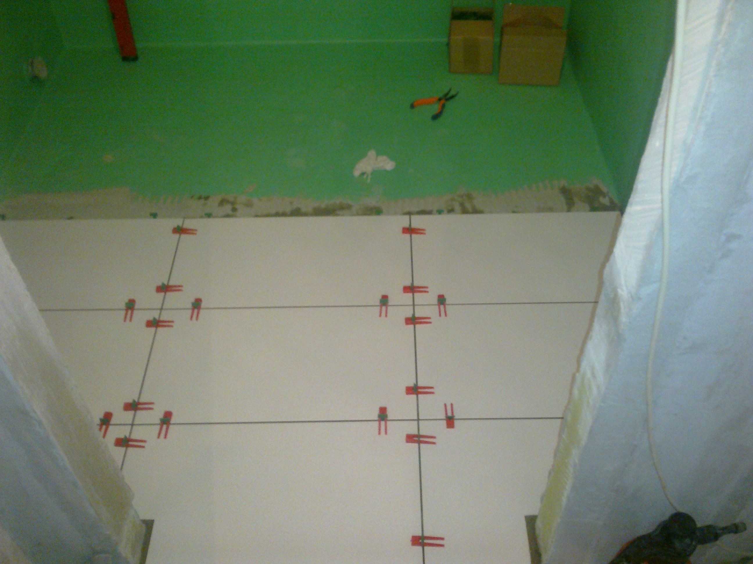 Есть они в продаже и на стройрынках, но велик шанс нарваться на подделку. Проверяется элементарно! Если при просьбе затушить сигарету в середине полотна торгован тушуется, можно смело идти дальше! Сергей, беда в том, что я курить бросил )) Хотя ради такого дела (IMG:style_emoticons/default/laugh.gif) А вообще спасибо! Значит буду брать мёллер. Кстати, тут вычитал на просторах интернета, что якобы через 3-4 года листы ГВЛ трещинами идут. Бред, да? По моим новостям, надоедает понемногу мыться в бассейне, ибо долго (IMG:style_emoticons/default/sleep.gif) Поэтому движусь на встречу ванне. Вчера клал плитку на пол. Предварительно нарезали ее, чтобы крайняя правая и крайняя левая плитки были одинаковой величины. Вроде получилось неплохо, старался, правда качество покажет время, поскольку как на самом деле распределился клей под плиткой - одному Богу известно (IMG:style_emoticons/default/smile.gif) Кстати, можно это как-то проверить? Постучу вечером, конечно )) Все по уровню, швы одинаковые. Сделал только половину, т.к. вторую половину надо делать с первой половины (IMG:style_emoticons/default/smile.gif) Начинал со стороны дверного проема, т.к. противоположная сторона будет все равно ванной закрыта. Теперь вот ищу где купить затирку Kiilto, тоже геморр как оказалось. В интернет-магазинах, конечно, есть, но доставка дорогая выходит... Зря сразу с клеем и гидроизоляцией не заказал. Кстати, клей Kiilto Pro Fix понравился. Конечно, мне не с чем его сравнить, но в целом очень пластичный, очень мелкие фракции, в общем комфортно с ним мне было работать. Ну и фото, конечно. Использовал ту систему укладки для выравнивания до миллиметра плоскости плиток: |
