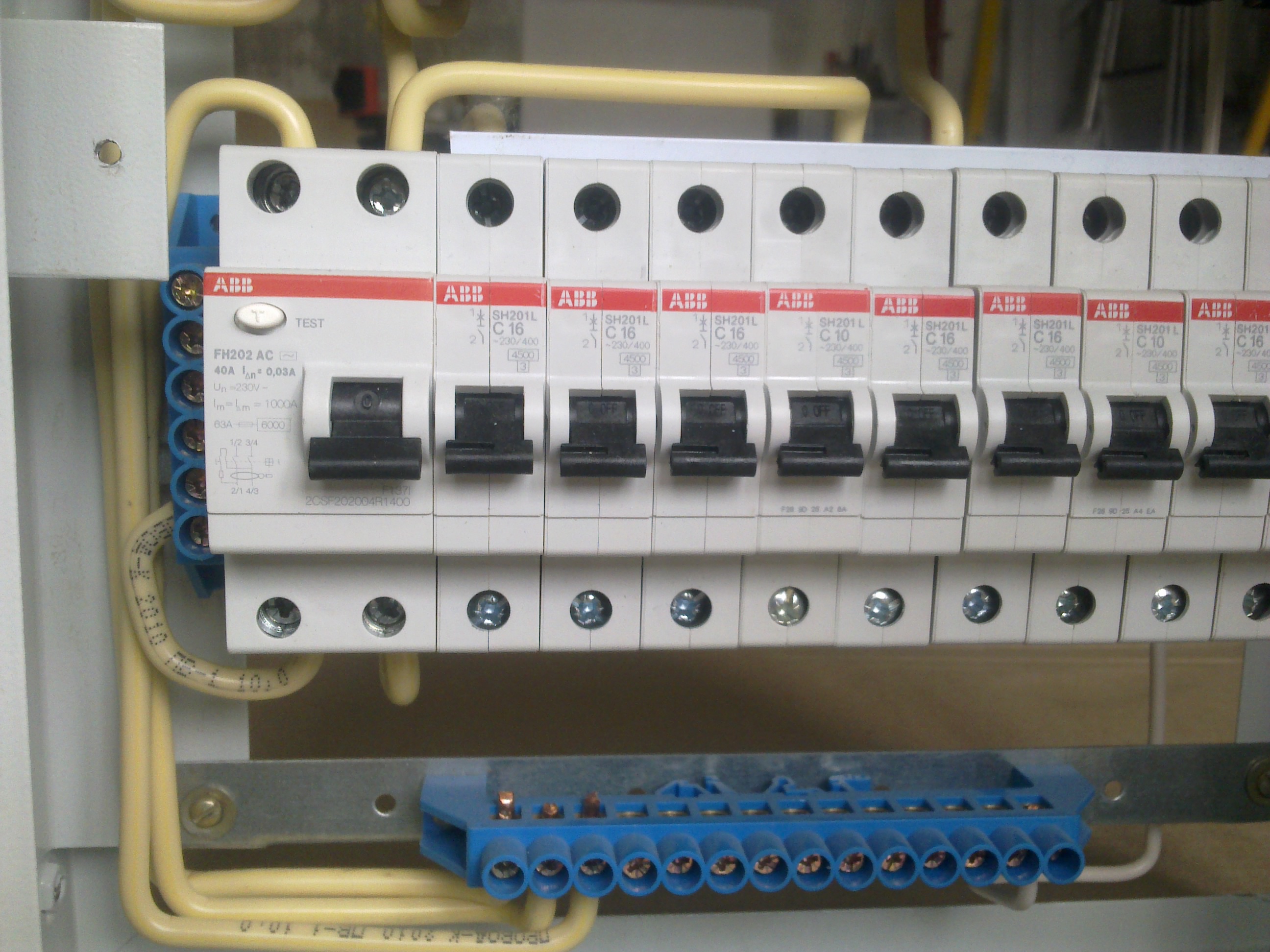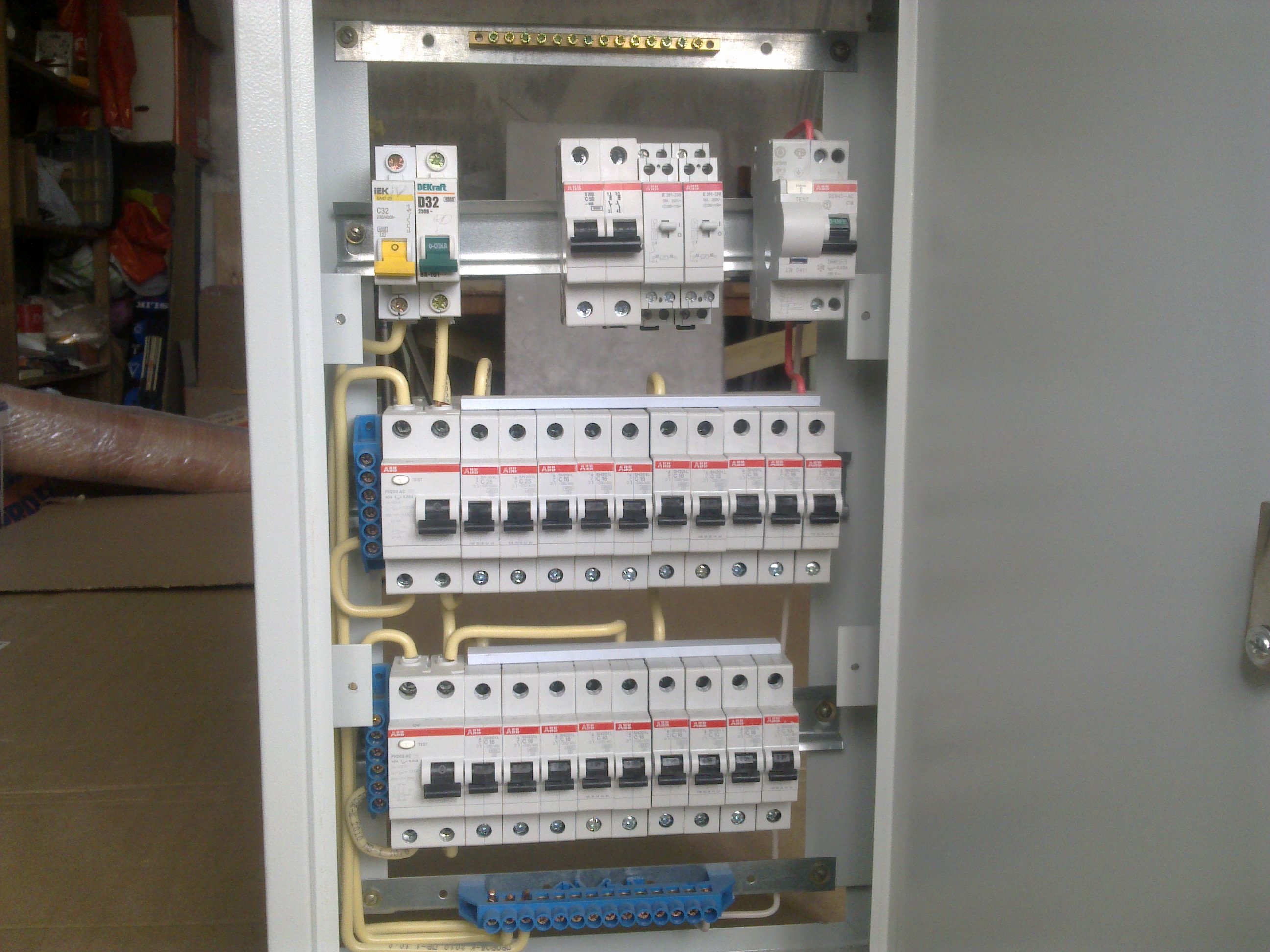 По щитку там какие-то вопросы были... Слева маленькие клеммы - это ноль, относящийся к УЗО, расположенному рядом. Внизу синий клеммник - это для ноля от остальных потребителей (кроме тех, что к УЗО и дифавтомату пойдут). Ну а сверху металлический клемник - земля.