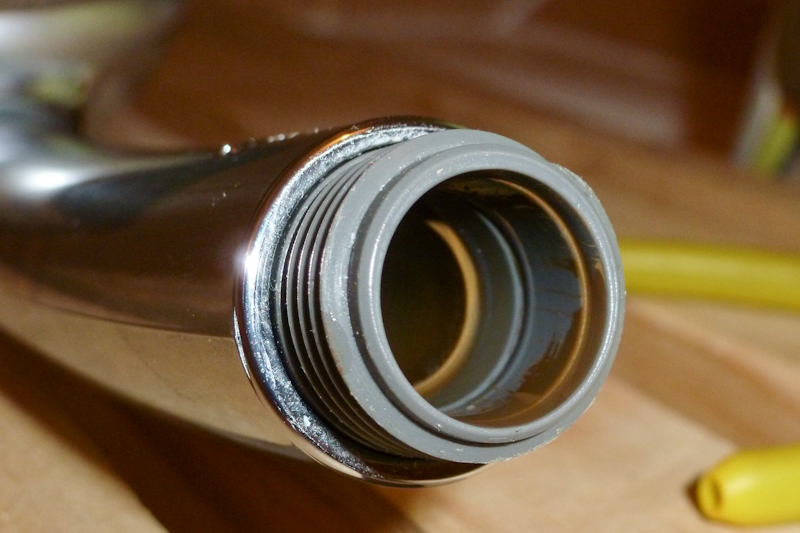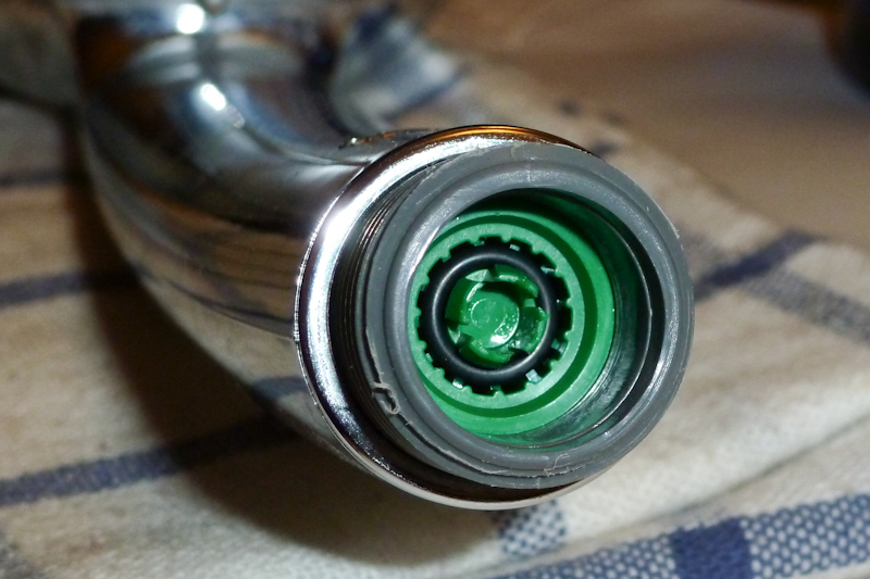 Берем лейку: И вот такой инструмент: И выдергиваем вставку: Видно утолщение на вставке, которым она держится за корпус лейки: Соответственно в лейке внутри есть проточка: Для вытаскивания вставки пришлось приложить довольно приличное усилие. Ну и на всякий случай я тащил по очереди за разные усы (их там по центру четыре штуки). |
