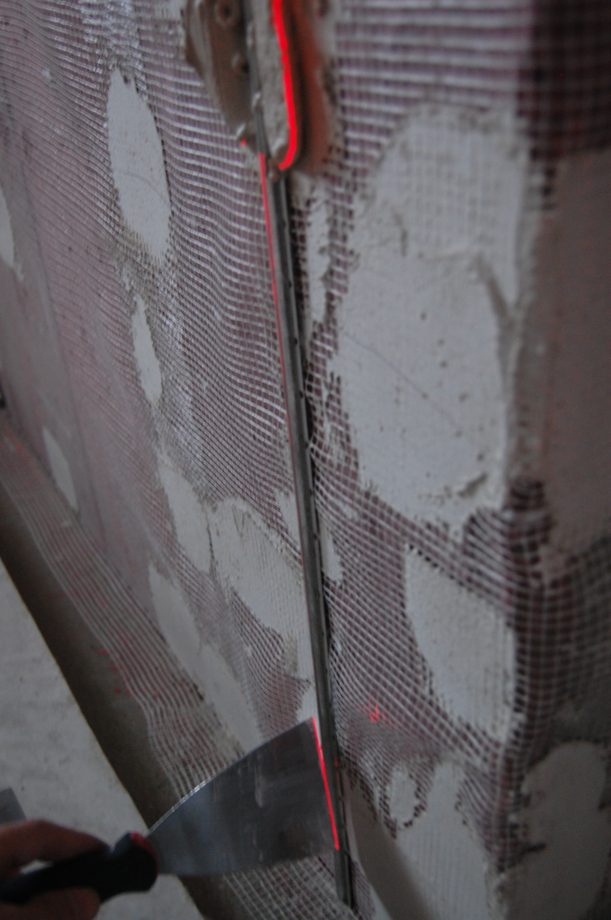 Маяки мешают. Поэтому я маяки ставлю с расстоянием на 15 см больше, чем ширина сетки. Под маяк, именно под маяк на нашлёпки, кладу ленту из сетки шириной 25 см. Перед накидыванием раствора свободный край загибаю отгибаю от стены. Накидываю раствор. Отпускаю края - маяков ведь два. Поверх раствора и краёв прикладываю заранее отрезанное полотно сетки. Прохожу зубчатой гладилкой с крупным зубом и сетка "тонет". Дальше правила в руки и вперёд ...