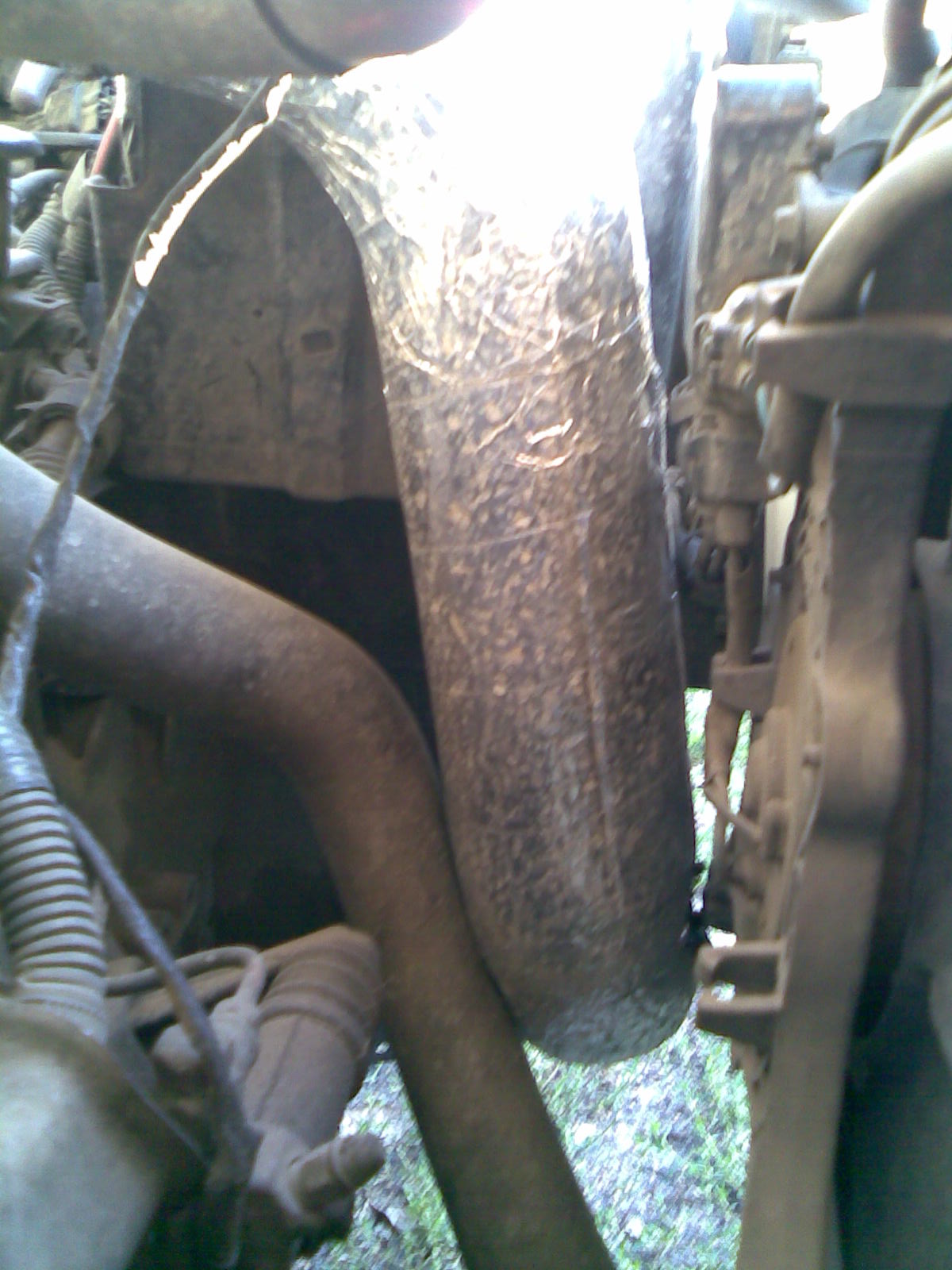 фото 4,5-корпус противотуманки до"доработки" фото 6,7-отпилена болгаркой верхняя часть корпуса птф и наклеен кусок шумки,так как при езде по плохой дороге фильтр бился об эти части фото 8 -конечная часть трубы(одевается сам фильтр) фото 9-видно место где труба билась об корпус вентилятора радиатора;расширительный бачок системы охлаждения снят со своего места на лонжероне,так как не давал места для установки трубы(фиксирован обычной проволокой) фото 10,11-труба упирается в резиновую трубку радиатора.всё руки никак не дойдут её оттянуть и зафиксировать. |