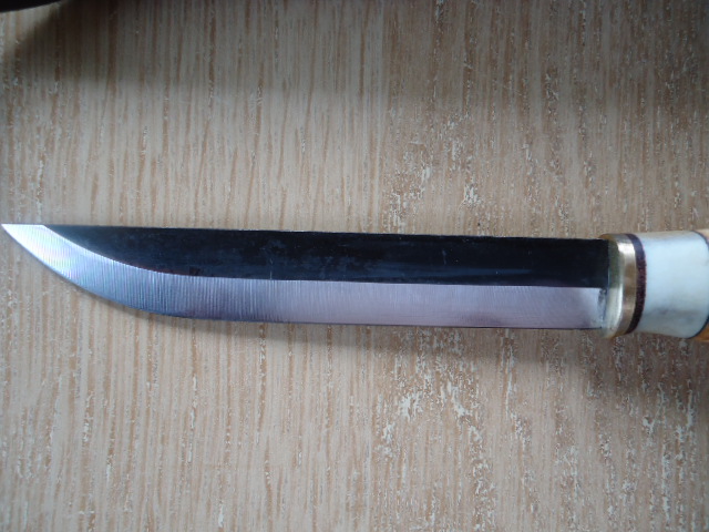 Сегодня приехал. (IMG:style_emoticons/default/smile.gif) Деревянные накладки на ручку. Не люфтит и не болтается. Тяжёлый, 265 гр. Взвешивал на градуснике который Онега подарил. (IMG:style_emoticons/default/biggrin.gif) Заточка конская, тупой, завтра буду перетачивать, хочу ,,снимать лишнее мясо"(с) Mihail V, и делать нормальный острый нож. |