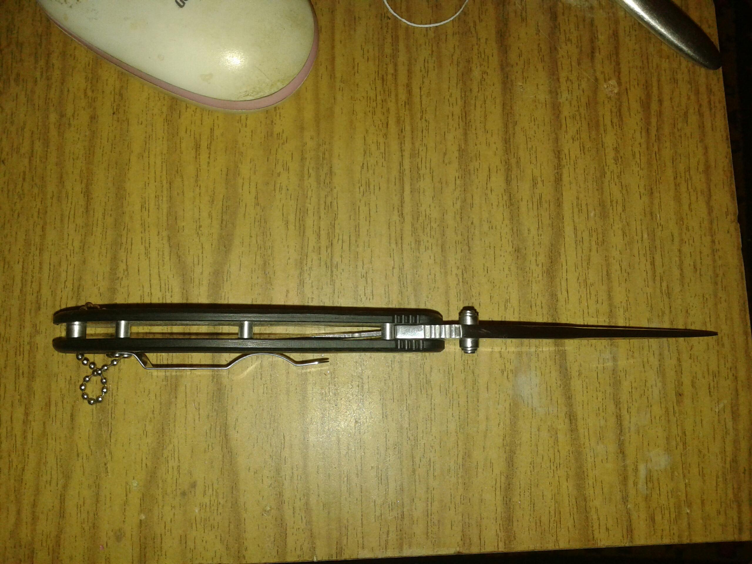 Итак джентльмены, на этом мои эксперименты, с поделками китайских школьников на уроках труда, закончены. Будем смотреть изделия более серьёзных производителей. Сегодня гулял по китайскому базару, и не удержался, прикупил вот такого малыша. За 200р. (IMG:style_emoticons/default/smile.gif) Перебрал штук 10. Надо было видеть лицо китайца, когда я стал втыкать ножи, в доску его прилавка. (IMG:style_emoticons/default/laugh.gif) Этот, оказался самым приличным, по качеству сборки. Остальные развалились, или сложились фиксаторы. Сталь на лезвии написана 440с. Но её там и близко нет. Длинна лезвиия 8.5 см, толщина 2.5 мм, длинна ручки 11см. Переточил - волос на руке бреет. Пусть валяется где нить дома. (IMG:style_emoticons/default/rofl.gif) Не прошло и два месяца.... (IMG:style_emoticons/default/smile.gif) |