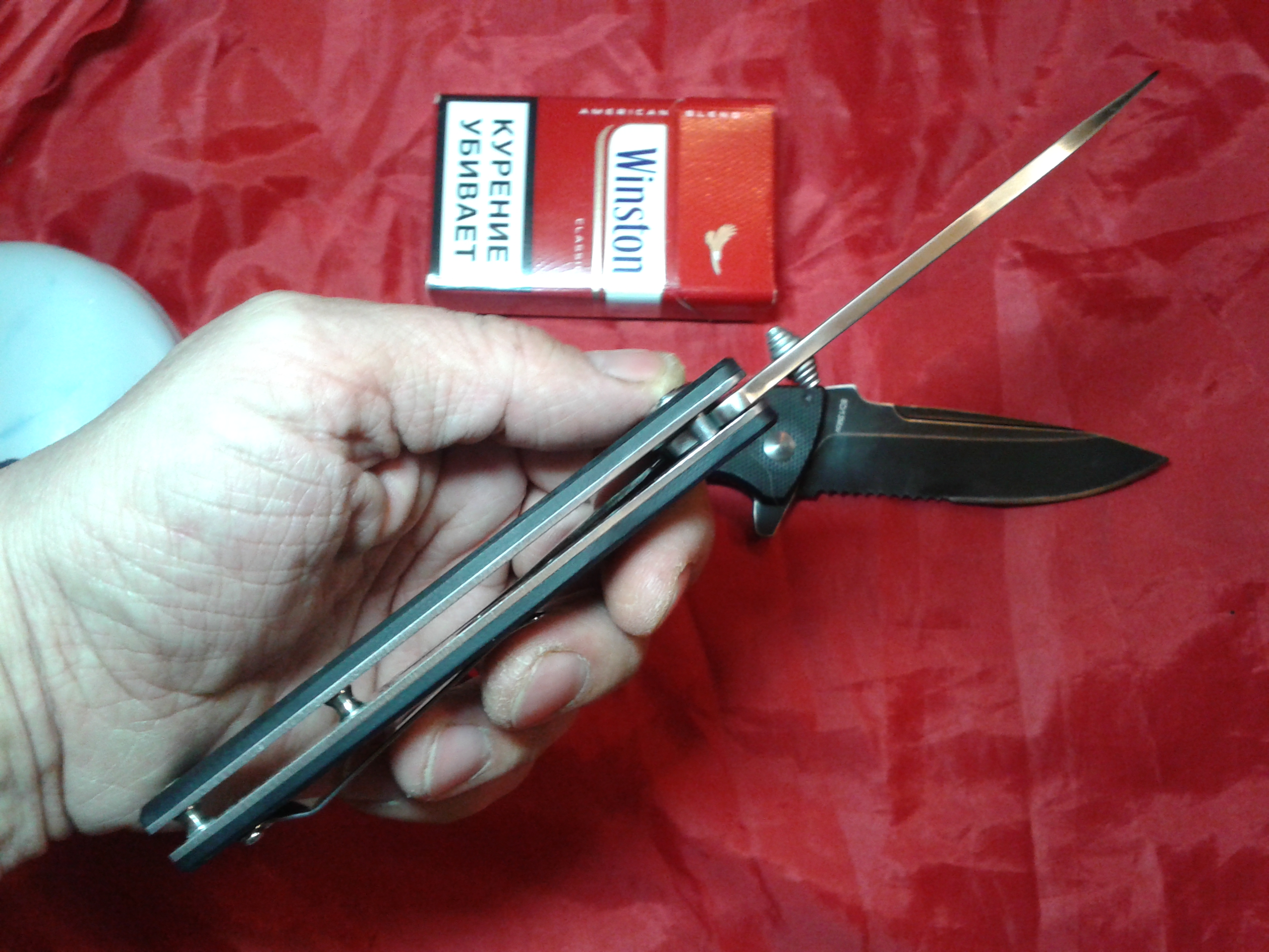 Приехала китайская Крыса. (IMG:style_emoticons/default/smile.gif) Китайский клон ножа - Онтарио RAT-1. Идеальный рез из всех что я видел! Сравнимо с лучшими разделочными ножами. Спуски прямые. Заточка из коробки идеальная. Сталь 9Cr18Mov. Толщина обуха 3.8 мм, длина клинка 9.5 см, ручка 13.2 см.Запирающий лайнер туговат. Буду чуть разбирать и смотреть что там. Поищу сухую смазку, типа такой - http://www.mkad86.ru/cat/smazki/352774 Рекомендую! Супер резак и как нож за свои деньги. Во сколько крыса обошлась? |