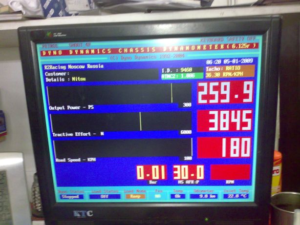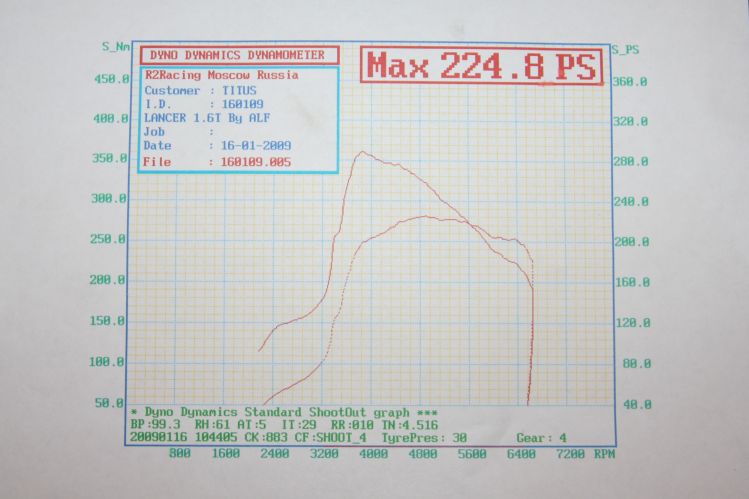 тогда если вы дунули наполную то турбинка дунет под 2 бара и сил должно быть не 225 а под 300 а кто тебе сказал что мы дунули на полную? дули 1.25, получили пик на 3800. при бусте 1.4 получили пик в 385нм и 260лс при 5000. (на фото с монитора видно). я ставил 1.75 бара, для проверки надёжности мотора, стенд показал 279лс., но для турбины это оч тяжко. идеальный вариант для данного конфига это замена распредвалавала (сток после 5000 "умирает") и буст в 1 бар., на выходе 210лс и полка момента в 300нм с 3500 до 6000. |