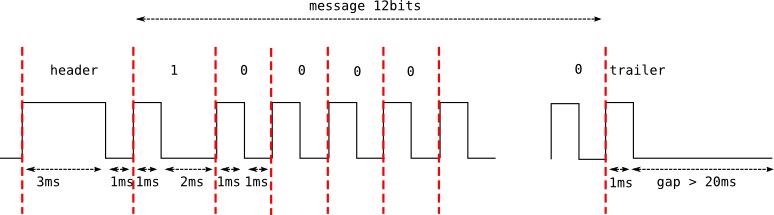Привет, если не сложно - подскажи, пожалуйста, как правильнее сделать на микробайсике, чтобы размер кода получился меньше. есть задача отправлять 12битные команды. посылка команды выглядит следующим образом. Заголовок GPIO.1 = 1 Delay_ms(3) GPIO.1 = 0 Delay_ms(1) потом 12 бит команды где ноль выглядит след образом GPIO.1 = 1 Delay_ms(1) GPIO.1 = 0 Delay_ms(1) а единица вот так GPIO.1 = 1 Delay_ms(1) GPIO.1 = 0 Delay_ms(2) и посылка завершения GPIO.1 = 1 Delay_ms(1) GPIO.1 = 0 Delay_ms(30) для нагладности вот картинка сейчас в тестовом режиме использую построчное описание включения и выключения GPIO.1. получается громоздко и не удобно . Хотелось бы описать как отправляется ноль, а как единица, а потом уже просто давать команду "отправить 00011101001" или "отправить 0x0E9 " но как это сделать? |