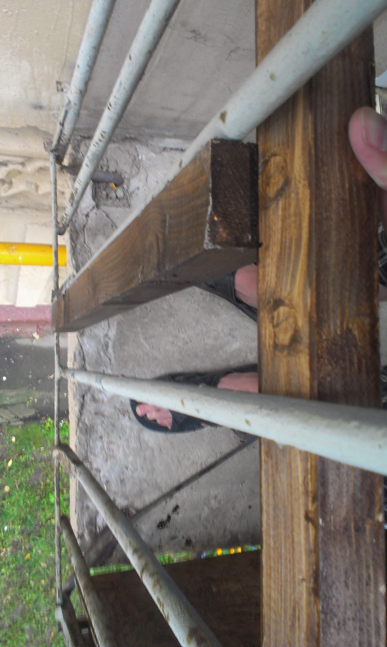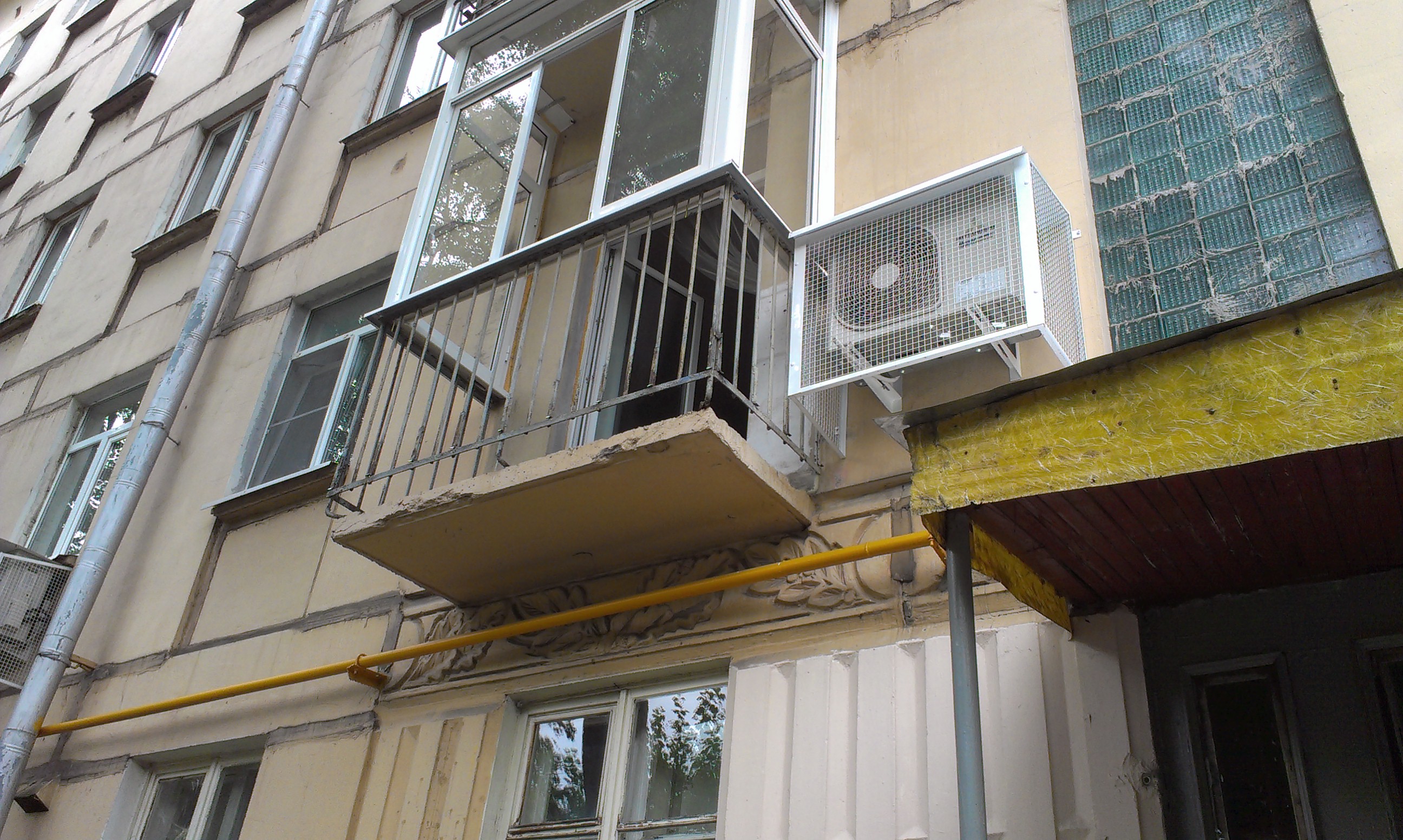 Вынес ЧЫТЫРЕ мешка мусора - плитка, раствор, стяжка, рубероид. Передо мной предстала прекрасного состояния балконная плита. Усилить её нет возможности своими силам, так как !!!внимание на фото ниже!!!... ...аккурать под моим балконом проходит домовая газовая магистраль. Да и такая прекрасная лепнина. Жалко её закрывать. Подружился с болгаркой. Прекрасный инструмент. Срезал им ужасные усы (видны у верхнего балкона), в который раньше доски с цветами и различными растениями ставили. На следующей неделе пропитываю OSB и обшиваю. |