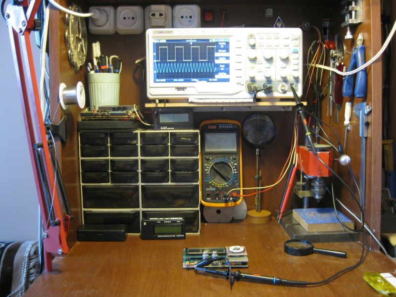 Наконец придумал, куда приткнуть осциллограф... Пришлось пожертвовать некоторым пространством на передней перегородке - у меня там раньше кое-какие инструменты висели, ну и полочку приспосабливать. не удержался (IMG:style_emoticons/default/biggrin.gif)