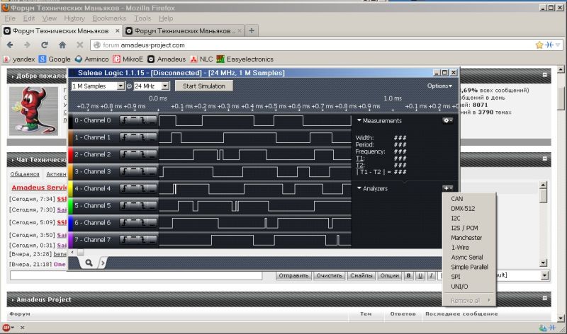 В последнее время часто приходится заниматься передачей данных между узлами по UART. Пока что анализатор использовался только с указанным протоколом и весьма успешно. В принципе и был приобретен специально для этого дела.